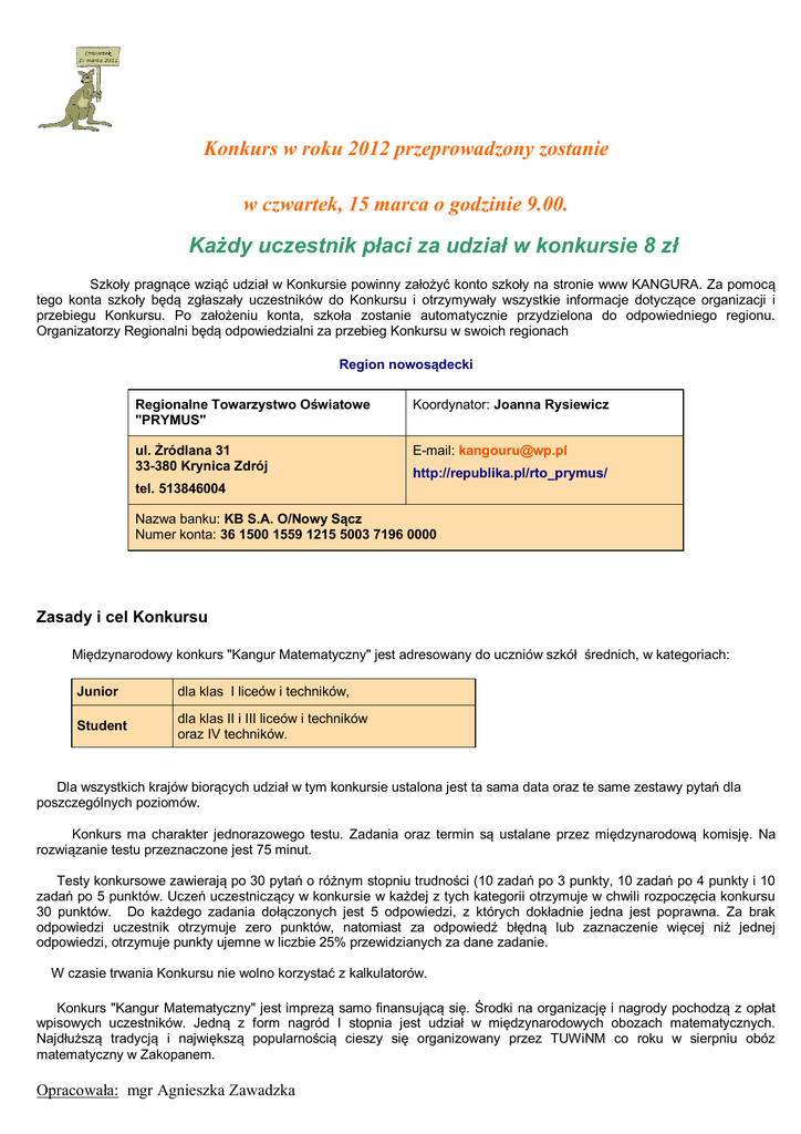 Konkurs w roku 2012 przeprowadzony zostanie w czwartek, 15 marca o godzinie 9.00. Każdy uczestnik płaci za udział w konkursie 8 zł Szkoły pragnące wziąć udział w Konkursie powinny założyć konto szkoły na stronie www KANGURA. Za pomocą tego konta szkoły będą zgłaszały uczestników do Konkursu i otrzymywały wszystkie informacje dotyczące organizacji i przebiegu Konkursu. Po założeniu konta, szkoła zostanie automatycznie przydzielona do odpowiedniego regionu. Organizatorzy Regionalni będą odpowiedzialni za przebieg Konkursu w swoich regionach Region nowosądecki Regionalne Towarzystwo Oświatowe "PRYMUS" Koordynator: Joanna Rysiewicz ul. Źródlana 31 33-380 Krynica Zdrój E-mail: [email protected] http://republika.pl/rto_prymus/ tel. 513846004 Nazwa banku: KB S.A. O/Nowy Sącz Numer konta: 36 1500 1559 1215 5003 7196 0000 Zasady i cel Konkursu Międzynarodowy konkurs "Kangur Matematyczny" jest adresowany do uczniów szkół średnich, w kategoriach: Junior dla klas I liceów i techników, Student dla klas II i III liceów i techników oraz IV techników. Dla wszystkich krajów biorących udział w tym konkursie ustalona jest ta sama data oraz te same zestawy pytań dla poszczególnych poziomów. Konkurs ma charakter jednorazowego testu. Zadania oraz termin są ustalane przez międzynarodową komisję. Na rozwiązanie testu przeznaczone jest 75 minut. Testy konkursowe zawierają po 30 pytań o różnym stopniu trudności (10 zadań po 3 punkty, 10 zadań po 4 punkty i 10 zadań po 5 punktów. Uczeń uczestniczący w konkursie w każdej z tych kategorii otrzymuje w chwili rozpoczęcia konkursu 30 punktów. Do każdego zadania dołączonych jest 5 odpowiedzi, z których dokładnie jedna jest poprawna. Za brak odpowiedzi uczestnik otrzymuje zero punktów, natomiast za odpowiedź błędną lub zaznaczenie więcej niż jednej odpowiedzi, otrzymuje punkty ujemne w liczbie 25% przewidzianych za dane zadanie. W czasie trwania Konkursu nie wolno korzystać z kalkulatorów. Konkurs "Kangur Matematyczny" jest imprezą samo finansującą się. Środki na organizację i nagrody pochodzą z opłat wpisowych uczestników. Jedną z form nagród I stopnia jest udział w międzynarodowych obozach matematycznych. Najdłuższą tradycją i największą popularnością cieszy się organizowany przez TUWiNM co roku w sierpniu obóz matematyczny w Zakopanem. Opracowała: mgr Agnieszka Zawadzka