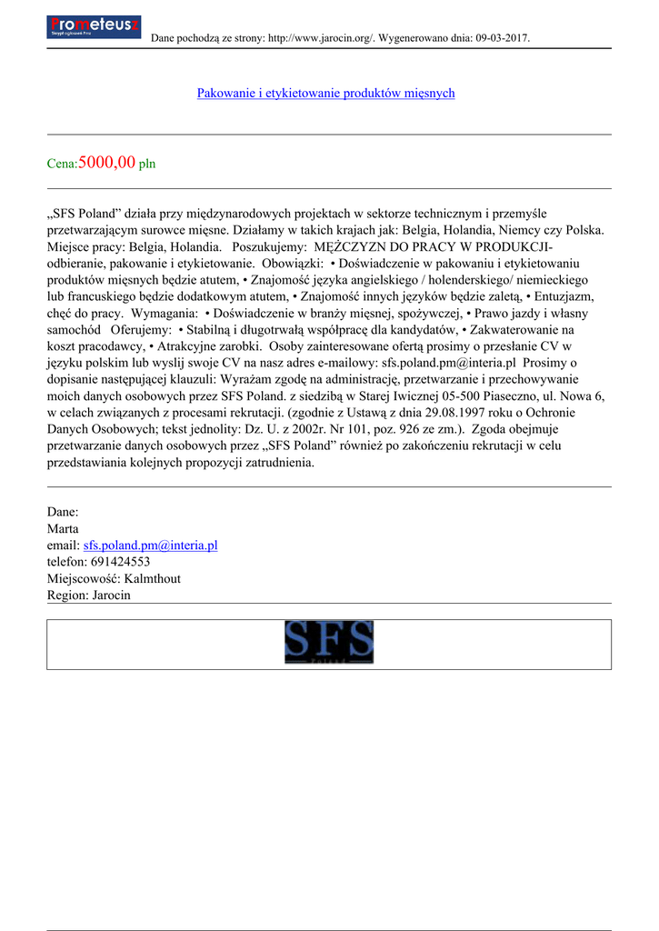 Dane pochodzą ze strony: http://www.jarocin.org/. Wygenerowano dnia: 09-03-2017. Pakowanie i etykietowanie produktów mięsnych Cena:5000,00 pln „SFS Poland” działa przy międzynarodowych projektach w sektorze technicznym i przemyśle przetwarzającym surowce mięsne. Działamy w takich krajach jak: Belgia, Holandia, Niemcy czy Polska. Miejsce pracy: Belgia, Holandia. Poszukujemy: MĘŻCZYZN DO PRACY W PRODUKCJIodbieranie, pakowanie i etykietowanie. Obowiązki: • Doświadczenie w pakowaniu i etykietowaniu produktów mięsnych będzie atutem, • Znajomość języka angielskiego / holenderskiego/ niemieckiego lub francuskiego będzie dodatkowym atutem, • Znajomość innych języków będzie zaletą, • Entuzjazm, chęć do pracy. Wymagania: • Doświadczenie w branży mięsnej, spożywczej, • Prawo jazdy i własny samochód Oferujemy: • Stabilną i długotrwałą współpracę dla kandydatów, • Zakwaterowanie na koszt pracodawcy, • Atrakcyjne zarobki. Osoby zainteresowane ofertą prosimy o przesłanie CV w języku polskim lub wyslij swoje CV na nasz adres e-mailowy: [email protected] Prosimy o dopisanie następującej klauzuli: Wyrażam zgodę na administrację, przetwarzanie i przechowywanie moich danych osobowych przez SFS Poland. z siedzibą w Starej Iwicznej 05-500 Piaseczno, ul. Nowa 6, w celach związanych z procesami rekrutacji. (zgodnie z Ustawą z dnia 29.08.1997 roku o Ochronie Danych Osobowych; tekst jednolity: Dz. U. z 2002r. Nr 101, poz. 926 ze zm.). Zgoda obejmuje przetwarzanie danych osobowych przez „SFS Poland” również po zakończeniu rekrutacji w celu przedstawiania kolejnych propozycji zatrudnienia. Dane: Marta email: [email protected] telefon: 691424553 Miejscowość: Kalmthout Region: Jarocin