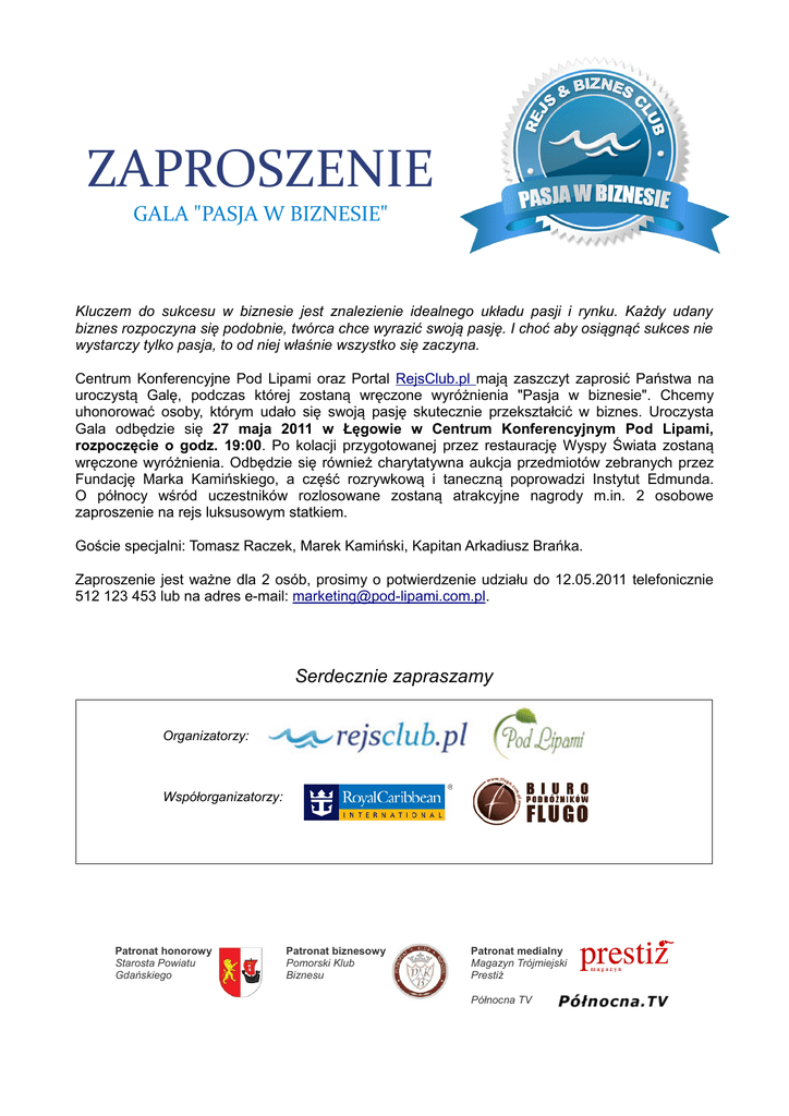 ZAPROSZENIE GALA "PASJA W BIZNESIE" Kluczem do sukcesu w biznesie jest znalezienie idealnego układu pasji i rynku. Każdy udany biznes rozpoczyna się podobnie, twórca chce wyrazić swoją pasję. I choć aby osiągnąć sukces nie wystarczy tylko pasja, to od niej właśnie wszystko się zaczyna. Centrum Konferencyjne Pod Lipami oraz Portal RejsClub.pl mają zaszczyt zaprosić Państwa na uroczystą Galę, podczas której zostaną wręczone wyróżnienia "Pasja w biznesie". Chcemy uhonorować osoby, którym udało się swoją pasję skutecznie przekształcić w biznes. Uroczysta Gala odbędzie się 27 maja 2011 w Łęgowie w Centrum Konferencyjnym Pod Lipami, rozpoczęcie o godz. 19:00. Po kolacji przygotowanej przez restaurację Wyspy Świata zostaną wręczone wyróżnienia. Odbędzie się również charytatywna aukcja przedmiotów zebranych przez Fundację Marka Kamińskiego, a część rozrywkową i taneczną poprowadzi Instytut Edmunda. O północy wśród uczestników rozlosowane zostaną atrakcyjne nagrody m.in. 2 osobowe zaproszenie na rejs luksusowym statkiem. Goście specjalni: Tomasz Raczek, Marek Kamiński, Kapitan Arkadiusz Brańka. Zaproszenie jest ważne dla 2 osób, prosimy o potwierdzenie udziału do 12.05.2011 telefonicznie 512 123 453 lub na adres e-mail: [email protected]. Serdecznie zapraszamy Organizatorzy: Współorganizatorzy: Patronat honorowy Starosta Powiatu Gdańskiego Patronat biznesowy Pomorski Klub Biznesu Patronat medialny Magazyn Trójmiejski Prestiż Północna TV