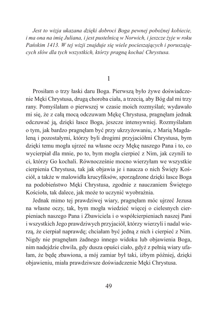 Jest to wizja ukazana dzięki dobroci Boga pewnej pobożnej kobiecie, i ma ona na imię Juliana, i jest pustelnicą w Norwich, i jeszcze żyje w roku Pańskim 1413. W tej wizji znajduje się wiele pocieszających i poruszających słów dla tych wszystkich, którzy pragną kochać Chrystusa. 1 Prosiłam o trzy łaski daru Boga. Pierwszą było żywe doświadczenie Męki Chrystusa, drugą choroba ciała, a trzecią, aby Bóg dał mi trzy rany. Pomyślałam o pierwszej w czasie moich rozmyślań; wydawało mi się, że z całą mocą odczuwam Mękę Chrystusa, pragnęłam jednak odczuwać ją, dzięki łasce Boga, jeszcze intensywniej. Rozmyślałam o tym, jak bardzo pragnęłam być przy ukrzyżowaniu, z Marią Magdaleną i pozostałymi, którzy byli drogimi przyjaciółmi Chrystusa, bym dzięki temu mogła ujrzeć na własne oczy Mękę naszego Pana i to, co wycierpiał dla mnie, po to, bym mogła cierpieć z Nim, jak czynili to ci, którzy Go kochali. Równocześnie mocno wierzyłam we wszystkie cierpienia Chrystusa, tak jak objawia je i naucza o nich Święty Kościół, a także w malowidła krucyfiksów, sporządzone dzięki łasce Boga na podobieństwo Męki Chrystusa, zgodnie z nauczaniem Świętego Kościoła, tak dalece, jak może to uczynić wyobraźnia. Jednak mimo tej prawdziwej wiary, pragnęłam móc ujrzeć Jezusa na własne oczy, tak, bym mogła wiedzieć więcej o cielesnych cierpieniach naszego Pana i Zbawiciela i o współcierpieniach naszej Pani i wszystkich Jego prawdziwych przyjaciół, którzy wierzyli i nadal wierzą, że cierpiał naprawdę; chciałam być jedną z nich i cierpieć z Nim. Nigdy nie pragnęłam żadnego innego widoku lub objawienia Boga, nim nadejdzie chwila, gdy dusza opuści ciało, gdyż z pełnią wiary ufałam, że będę zbawiona, a mój zamiar był taki, iżbym później, dzięki objawieniu, miała prawdziwsze doświadczenie Męki Chrystusa. 49 Co się tyczy drugiego daru, pojawiło się we mnie, razem ze skruchą, w sposób nieprzymuszony i bez żadnego wysiłku z mej strony, usilne pragnienie, by otrzymać Boży dar choroby ciała. Chciałam, by ta choroba ciała była aż do śmierci, po to, bym mogła w tej chorobie otrzymać ostatnie namaszczenie Świętego Kościoła, po to, bym sama mogła uwierzyć, że umieram i aby każdy, kto by mnie ujrzał, mógł wierzyć tak samo, gdyż nie pragnęłam już żadnej nadziei życia w ciele lub na ziemi. Pragnęłam doświadczyć w mojej chorobie każdego rodzaju cierpienia, zarówno duszy, jak i ciała, których bym doświadczyła, gdybym umarła, wespół z przestrachem i zamieszaniem wśród diabłów, jak i wszelkich innych katuszy, z wyjątkiem rzeczywistego oddania ducha, gdyż miałam nadzieję, że z korzyścią byłoby dla mnie, gdybym umarła, gdyż pragnęłam być szybko z moim Bogiem. Prosiłam o te dwie rzeczy – mękę i chorobę – z jednym zastrzeżeniem, gdyż wydało mi się, że prośby te wychodzą poza to, o co najczęściej się modlimy, i dlatego powiedziałam: „Panie, wiesz, czego bym pragnęła. Jeśli jest Twoją wolą, bym to otrzymała, udziel mi tego daru. A jeśli nie jest to Twoją wolą, dobry Panie, nie bądź niezadowolony, gdyż chcę tylko tego, czego Ty chcesz”. Prosiłam o tę chorobę w mojej młodości, bym mogła na nią zapaść, gdy będę miała trzydzieści lat. Co się tyczy trzeciego daru, słyszałam, jak pewien mąż Świętego Kościoła opowiadał o św. Cecylii; z tego, co opisywał, zrozumiałam, że otrzymała ona trzy rany mieczem w szyję, od których zmarła wolno i w męczarniach. Ta opowieść poruszyła mnie i zrodziła we mnie ogromne pragnienie, i modliłam się do naszego Boga i Pana, aby udzie Na średniowiecznych malowidłach przedstawiających ludzi na łożu śmierci często widzimy diabły czekające niecierpliwie na to, by porwać duszę umierającego człowieka. Legenda o św. Cecylii opowiada, że była ona pochodzącą z rodu rzymskich patrycjuszy dziewczyną, która po nawróceniu wybranego dla niej męża i brata na chrześcijaństwo została skazana na śmierć, przez ścięcie mieczem. Trzy ciosy mieczem nie pozbawiły jej życia, lecz spowodowały śmierć trzy dni później. Pod koniec czternastego wieku legendę o św. Cecylii przypomniał Chaucer w swoich Opowieściach kanterberyjskich, w Opowieści drugiej mniszki. 50 lił mi trzech ran w moim życiu, to znaczy rany skruchy, rany współodczuwania i rany wielkiej tęsknoty za Bogiem. O dwa pierwsze dary prosiłam z zastrzeżeniem, o trzeci dar jednak prosiłam bez żadnych zastrzeżeń. Moje dwa pierwsze pragnienia wspomniane przed chwilą odeszły z mej pamięci, a trzecie towarzyszyło mi cały czas. 2 I kiedy miałam lat trzydzieści i pół roku, Bóg zesłał mi chorobę ciała i złożona chorobą leżałam trzy dni i trzy noce; i czwartej nocy otrzymałam ostatnie namaszczenie Świętego Kościoła i nie wierzyłam, że dożyję do rana. Potem jeszcze pozostawałam w agonii przez dwa dni i dwie noce. Gdy nadeszła trzecia noc, często przychodziła do mnie myśl, że właśnie umieram, i tak samo myśleli ci, którzy byli przy mnie. W tym czasie jednak był we mnie ogromny żal i nie chciałam umierać, nie iżby było coś na ziemi, dla czego chciałabym żyć, ani dlatego, że bałam się czegokolwiek, gdyż miałam ufność w Bogu, ale dlatego, że chciałam żyć i kochać Boga lepiej i dłużej, tak iżbym przez łaskę dłuższego życia mogła poznać i kochać Boga lepiej, gdy doświadczę szczęśliwości w niebie. Gdyż wydało mi się, że ten krótki czas, przez jaki mogłam żyć tutaj, był niczym w porównaniu z tą niebiańską szczęśliwością. Dlatego pomyślałam: „Mój dobry Panie, niech mój koniec żywota będzie na Twoją chwałę!”. I Bóg odpowiedział mi w moim rozumie i przez bóle, przez które czułam, że umieram. I w pełni przyjęłam wolę Boga, całą wolą mojego serca. I tak wytrwałam aż do dnia następnego, i
