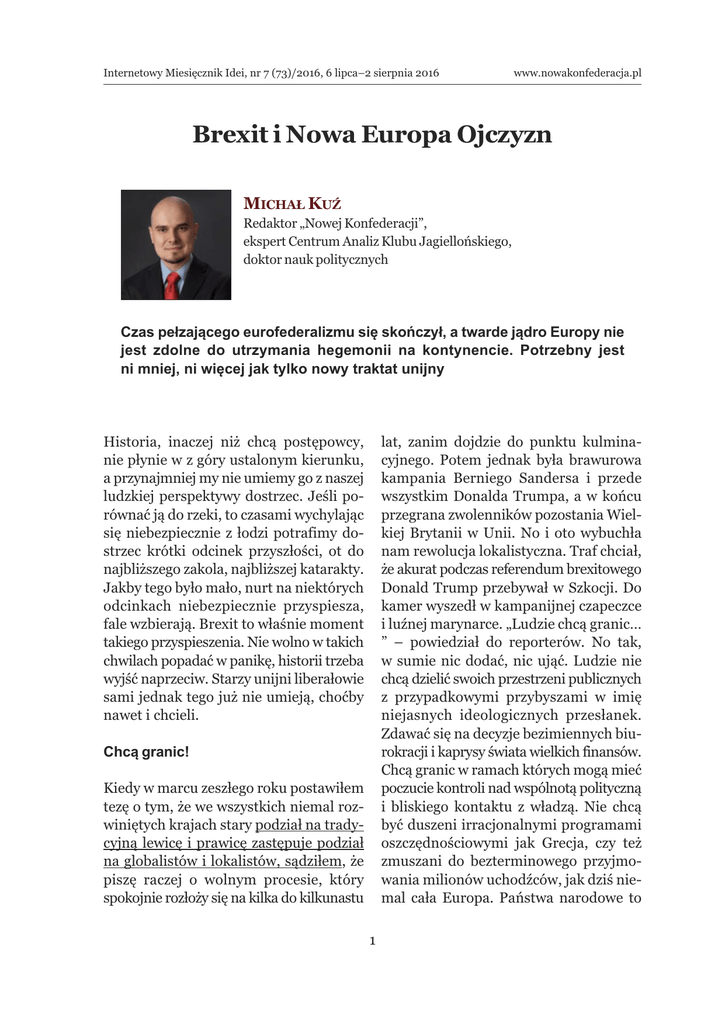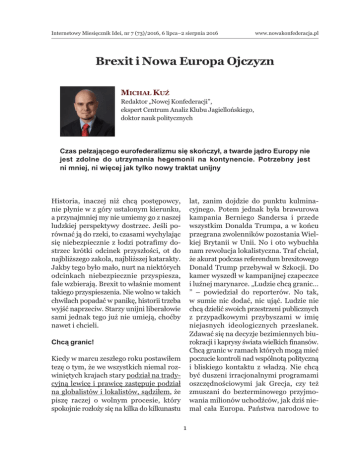 Internetowy Miesięcznik Idei, nr 7 (73)/2016, 6 lipca–2 sierpnia 2016 www.nowakonfederacja.pl Brexit i Nowa Europa Ojczyzn Michał Kuź Redaktor „Nowej Konfederacji”, ekspert Centrum Analiz Klubu Jagiellońskiego, doktor nauk politycznych Czas pełzającego eurofederalizmu się skończył, a twarde jądro Europy nie jest zdolne do utrzymania hegemonii na kontynencie. Potrzebny jest ni mniej, ni więcej jak tylko nowy traktat unijny Historia, inaczej niż chcą postępowcy, nie płynie w z góry ustalonym kierunku, a przynajmniej my nie umiemy go z naszej ludzkiej perspektywy dostrzec. Jeśli porównać ją do rzeki, to czasami wychylając się niebezpiecznie z łodzi potrafimy dostrzec krótki odcinek przyszłości, ot do najbliższego zakola, najbliższej katarakty. Jakby tego było mało, nurt na niektórych odcinkach niebezpiecznie przyspiesza, fale wzbierają. Brexit to właśnie moment takiego przyspieszenia. Nie wolno w takich chwilach popadać w panikę, historii trzeba wyjść naprzeciw. Starzy unijni liberałowie sami jednak tego już nie umieją, choćby nawet i chcieli. lat, zanim dojdzie do punktu kulminacyjnego. Potem jednak była brawurowa kampania Berniego Sandersa i przede wszystkim Donalda Trumpa, a w końcu przegrana zwolenników pozostania Wielkiej Brytanii w Unii. No i oto wybuchła nam rewolucja lokalistyczna. Traf chciał, że akurat podczas referendum brexitowego Donald Trump przebywał w Szkocji. Do kamer wyszedł w kampanijnej czapeczce i luźnej marynarce. „Ludzie chcą granic… ” – powiedział do reporterów. No tak, w sumie nic dodać, nic ująć. Ludzie nie chcą dzielić swoich przestrzeni publicznych z przypadkowymi przybyszami w imię niejasnych ideologicznych przesłanek. Zdawać się na decyzje bezimiennych biurokracji i kaprysy świata wielkich finansów. Chcą granic w ramach których mogą mieć poczucie kontroli nad wspólnotą polityczną i bliskiego kontaktu z władzą. Nie chcą być duszeni irracjonalnymi programami oszczędnościowymi jak Grecja, czy też zmuszani do bezterminowego przyjmowania milionów uchodźców, jak dziś niemal cała Europa. Państwa narodowe to Chcą granic! Kiedy w marcu zeszłego roku postawiłem tezę o tym, że we wszystkich niemal rozwiniętych krajach stary podział na tradycyjną lewicę i prawicę zastępuje podział na globalistów i lokalistów, sądziłem, że piszę raczej o wolnym procesie, który spokojnie rozłoży się na kilka do kilkunastu 1 Internetowy Miesięcznik Idei, nr 7 (73)/2016, 6 lipca–2 sierpnia 2016 zaś nie wymysł zacofanych umysłów, które nie rozumieją, że ludzkość to jedna wielka rodzina, tylko realnie największe możliwe terytorialnie wspólnoty polityczne, w których obywatele wciąż mają jeszcze poczucie współuczestniczenia w sprawowaniu władzy. Ich istnienie, w takich, a nie innych ramach, nie wynika ze złośliwości nacjonalistów, jak sugeruje po referendum wielu rozżalonych liberałów, tylko z ekonomii i mechaniki sprawowania władzy. Tę mechanikę z kolei warunkują cechy gatunku ludzkiego, to ile jesteśmy w stanie przyjąć informacji i z iloma innymi jednostkami wejść w jakiś sensowny kontakt (nawet przy użyciu protez, takich jak media tradycyjne i ostatnio media społecznościowe). W tym sensie powojenny globalistyczny liberalizm dotarł do antropologicznej granicy, a po drodze zjadł i przerobił na swoją modłę większą część starej lewicy. Zmusił ją z czasem do głoszenia haseł zupełnie sprzecznych: otwarcia granic dla przybyszów, zgody na nieregulowany globalny rynek i (już tylko symbolicznie) obrony interesów ludzi pracy. A przecież tych trzech postulatów nie da się pogodzić. Niespójności pozwalają zaś politykom nowej generacji wkraczać w miejsce opuszczone przez lewicę i przy okazji odbierać też elektorat dawnej, a dziś również zglobalizowanej prawicy w rodzaju niemieckiej CDU i Cameronowskiego skrzydła konserwatystów. Czy bowiem UKIP albo też frakcja Borisa Johnsona to lewica, czy prawica? Nie, oto są właśnie lokaliści. Wśród globalistów tymczasem wybuchła panika. Kiedy słucha się głosów Jarosława Kurskiego, Radka Sikorskiego, a także niektórych komentarzy na prawicy, odnosi się wrażenie, że ich przepis na to, co zrobić po Brexicie brzmi: „położyć się spokojnie do grobu i czekać na działania Putina”. Dochodzi też do zupełnie dzie- www.nowakonfederacja.pl cinnego wytykania palcami tych, którzy rzekomo za bardzo się cieszą. Jakby i autor tych słów miał wstydzić się trafnych prognoz, zamiast mieć zawodową satysfakcję z dobrze wykonanej pracy analityka. Globalistyczni liberałowie są też skorzy, by zganiać całą odpowiedzialność za obecne zawirowania na giełdach i sytuację rosnącej niepewności na premiera Camerona. Zupełnie jakby Brexit nie był tylko symptomem głębokiej choroby lizbońskiej Europy. A przecież kryzys systemowy ujawniłby się i tak. Jeśli nie przy okazji brytyjskiego referendum, to przy jakichś kolejnych wyborach w innym państwie. Twardego jądra nie będzie Inną narracją, popularną zwłaszcza wśród polskich globalistów, jest opowiadanie o jednoczącym się wokół Niemiec twardym jądrze Unii, które wypchnie kraje nowej UE na peryferie, robiąc przy okazji z Polski kozła ofiarnego. Równocześnie jednak, głoszący tę tezę eksperci, politycy i publicyści zwykle sami sobie przeczą, kiedy jednym tchem mówią o możliwych referendach we Francji, Holandii, Belgii, Danii, Szwecji czy w krajach biedniejszego Południa. Czyżby więc w owym mitycznym twardym jądrze miały w końcu pozostać same osamotnione Niemcy i czy to z nimi mamy jeszcze bardziej zacieśniać stosunki? Tylko jak? Nasze związki gospodarcze są przecież już bardzo bliskie. Politycznie zaś bardziej się zbliżyć już nie możemy, bo nie chcą tego nasze społeczeństwa. Co możemy jeszcze jako Polacy zrobić? Emitować dwujęzyczne „Nachrichten” z