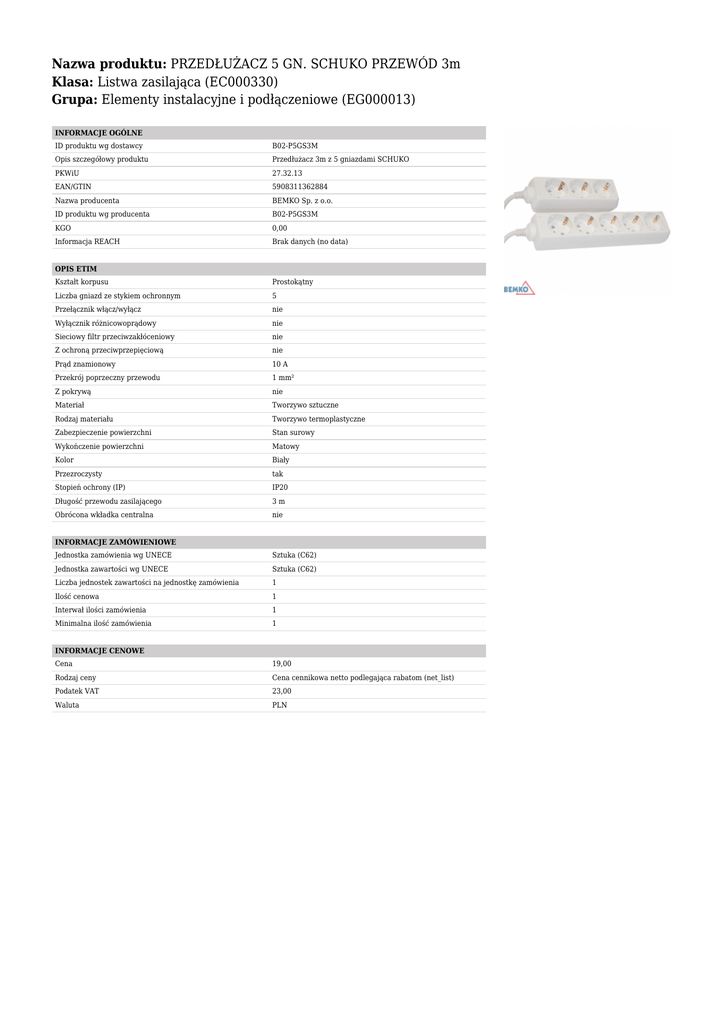 Nazwa produktu: PRZEDŁUŻACZ 5 GN. SCHUKO PRZEWÓD 3m Klasa: Listwa zasilająca (EC000330) Grupa: Elementy instalacyjne i podłączeniowe (EG000013) INFORMACJE OGÓLNE ID produktu wg dostawcy B02-P5GS3M Opis szczegółowy produktu Przedłużacz 3m z 5 gniazdami SCHUKO PKWiU 27.32.13 EAN/GTIN 5908311362884 Nazwa producenta BEMKO Sp. z o.o. ID produktu wg producenta B02-P5GS3M KGO 0,00 Informacja REACH Brak danych (no data) OPIS ETIM Kształt korpusu Prostokątny Liczba gniazd ze stykiem ochronnym 5 Przełącznik włącz/wyłącz nie Wyłącznik różnicowoprądowy nie Sieciowy filtr przeciwzakłóceniowy nie Z ochroną przeciwprzepięciową nie Prąd znamionowy 10 A Przekrój poprzeczny przewodu 1 mm² Z pokrywą nie Materiał Tworzywo sztuczne Rodzaj materiału Tworzywo termoplastyczne Zabezpieczenie powierzchni Stan surowy Wykończenie powierzchni Matowy Kolor Biały Przezroczysty tak Stopień ochrony (IP) IP20 Długość przewodu zasilającego 3m Obrócona wkładka centralna nie INFORMACJE ZAMÓWIENIOWE Jednostka zamówienia wg UNECE Sztuka (C62) Jednostka zawartości wg UNECE Sztuka (C62) Liczba jednostek zawartości na jednostkę zamówienia 1 Ilość cenowa 1 Interwał ilości zamówienia 1 Minimalna ilość zamówienia 1 INFORMACJE CENOWE Cena 19,00 Rodzaj ceny Cena cennikowa netto podlegająca rabatom (net_list) Podatek VAT 23,00 Waluta PLN