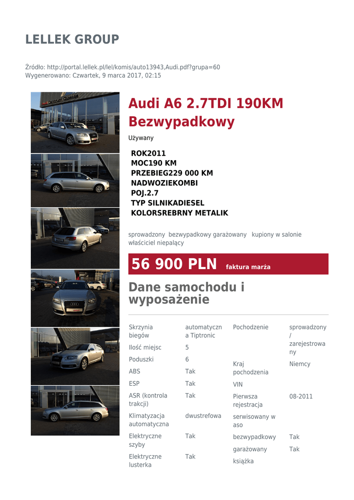 LELLEK GROUP Źródło: http://portal.lellek.pl/lel/komis/auto13943,Audi.pdf?grupa=60 Wygenerowano: Czwartek, 9 marca 2017, 02:15 Audi A6 2.7TDI 190KM Bezwypadkowy Używany ROK2011 MOC190 KM PRZEBIEG229 000 KM NADWOZIEKOMBI POJ.2.7 TYP SILNIKADIESEL KOLORSREBRNY METALIK sprowadzony bezwypadkowy garażowany kupiony w salonie właściciel niepalący 56 900 PLN faktura marża Dane samochodu i wyposażenie Skrzynia biegów automatyczn a Tiptronic Pochodzenie sprowadzony / zarejestrowa ny Ilość miejsc 5 Poduszki 6 ABS Kraj pochodzenia Niemcy Tak ESP Tak VIN ASR (kontrola trakcji) Tak Pierwsza rejestracja Klimatyzacja automatyczna dwustrefowa serwisowany w aso Elektryczne szyby Tak bezwypadkowy Tak garażowany Tak Elektryczne lusterka Tak książka 08-2011 Szyberdach Tak serwisowa Wspomaganie kierownicy Tak I właściciel Komputer Tak kupiony w salonie Radioodtwarza cz Tak tunning Alarm Tak stan idealny Immobilizer Tak Centralny zamek Tak właściciel niepalący Światła przeciwmgieln e Tak Czujnik deszczu Tak Czujniki parkowania Tak Kierownica wielofunkcyjna Tak Podgrzewane fotele Tak Zaw. pneumatyczne Tak Tempomat Tak Alufelgi Tak Miejsce postoju Gliwice ul. Portowa 2 Tak homologacja Opis dodatkowy AUDI CENTRUM GLIWICE autoryzowany Salon i Serwis Audi LELLEK GROUP oferuje do sprzedania samochód Audi A6 Avant sprawdzone 117 punktów w samochodzie gwarancja przebiegu i stanu technicznego Kolor nadwozia: Ice Silver/srebrny metalizowany Tapicerka: tkaninowa podsufitka: tkaninowa I-rejestracja 05.08.2011 bezwypadkowy, bez korekt lakierniczych forma sprzedaży: Faktura VAT/Marża stan wzorowy! Tak PRZYJMUJEM W ROZLICZENIU SAMOCHODY WSZYSTKICH MAREK! Handlowiec Wiesław Fiszer zapytaj mobile +48 663 000 673 Ubezpieczenie Ubezpieczenie dostępne Kredyt Kredyt dostępny Zeskanuj kod, aby zobaczyć ofertę online Wyposażenie dodatkowe: System nagłośnienia Audi BOSE Pneumatyczne zawieszenie z regulacją wysokości Klimatyzacja automatyczna dwustrefowa Podgrzewane elektrycznie przednie fotele Szklany szyberdach sterowany elektrycznie Czujniki cofania tył Alarm fabryczny Światła przeciwmgłowe Czujnik deszczu Czujnik zmierzchu Tempomat Elektrycznie sterowany fotel kierowcy oraz pasażera czteroramienna multifunkcyjna kierownica obszyta skórą Elektryczne sterowane szyby przednich oraz tylnych drzwi Wyposażenie podstawowe: ABS z ESP Poduszki powietrzne czołowe dla kierowcy i pasażera Poduszki powietrzne boczne z przodu oraz kurtyny chroniące głowy Elektryczna regulacja zasięgu reflektorów Reflektory przeciwmgielne zintegrowane w zderzaku Ogrzewane dysze spryskiwaczy Servotronic - wspomaganie układu kierowniczego zależne od prędkości jazdy Immobiliser Czujnik kontroli zapięcia pasów bezpieczeństwa dla przednich siedzeń Czujnik zmierzchowy świateł z czujnikiem deszczu oraz światła do jazdy dziennej (bez LED) Komfort Multi Media Interface (podstawowe) z radioodtwarzaczem CD i ekranem kolorowym Klimatyzacja automatyczna (bez wyświetlacza LCD) Komputer pokładowy z kolorowym wyświetlaczem Elektrycznie opuszczane szyby boczne z przodu i z tyłu Centralny zamek sterowany falami radiowymi Elektrycznie regulowane i ogrzewane lusterka zewnętrzne w kolorze nadwozia Wnętrze Przednie siedzenia standardowe z manualną regulacją wysokości Tapicerka tkaninowa "Meridian" Dzielone i składane oparcie tylnej kanapy w Limuzynie z napędem quattro i wersji Avant 4-ramienna kierownica i gałka dźwigni skrzyni biegów obszyte skórą Manualna regulacja położenia kolumny kierowniczej w dwóch płaszczyznach Aplikacje dekoracyjne: aluminium Radial Podłokietnik z tyłu Gniazdo zasilające 12 V z tyłu (w miejsce zapalniczki) Podświetlane lusterka do makijażu Lampki do czytania z przodu i z tyłu Dywaniki welurowe z przodu i z tyłu Wyposażenie zewnętrzne Srebrne listwy ozdobne wokół szyb Szyby termoizolacyjne System prowadnic w bagażniku (Avant) Obręcze ze stopu metali lekkich o wymiarach 7,5 J x 16, opony 225/55 R16 Y Przygotowanie do podłączenia urządzeń monitorujących skradziony pojazd PRZYJMUJEMY W ROZLICZENIU SAMOCHODY WSZYSTKICH MAREK!!! Kontakt: Wiesław Fiszer + 48 663 000 673, Mariusz Budziński +48 663 000 670 Adrian Gabor 032-335-92-83 Szanowny Kliencie przed przyjazdem upewnij się telefonicznie, że auto czeka na Twoją wizytę. Niniejsze ogłoszenie jest wyłącznie informacją handlową i nie stanowi oferty w myśl art. 66, §1. Kodeksu Cywilnego. Sprzedający nie odpowiada za ewentualne błędy lub nieaktualność ogłoszenia. Nota prawna Informacja nie stanowi oferty w rozumieniu art. 66 Kodeksu Cywilnego. Podane dane mają charakter wyłącznie informacyjny. Pełna informacja dostępna jest u handlowca. Sprzedający nie odpowiada za ewentualne błędy lub nieaktualność ogłoszenia.