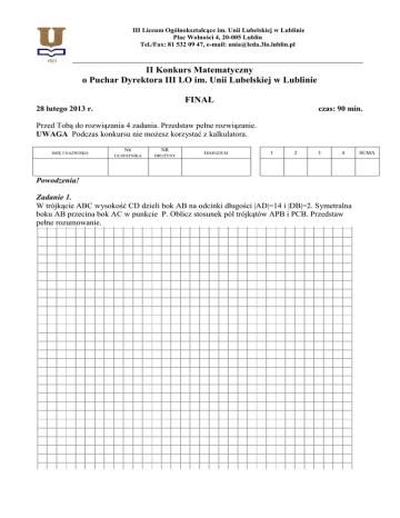 III Liceum Ogólnokształcące im. Unii Lubelskiej w Lublinie Plac Wolności 4, 20-005 Lublin Tel./Fax: 81 532 09 47, e-mail: [email protected] II Konkurs Matematyczny o Puchar Dyrektora III LO im. Unii Lubelskiej w Lublinie FINAŁ 28 lutego 2013 r. czas: 90 min. Przed Tobą do rozwiązania 4 zadania. Przedstaw pełne rozwiązanie. UWAGA Podczas konkursu nie możesz korzystać z kalkulatora. IMIĘ I NAZWISKO NR UCZESTNIKA NR DRUŻYNY GIMNZJUM 1 2 3 4 Powodzenia! Zadanie 1. W trójkącie ABC wysokość CD dzieli bok AB na odcinki długości |AD|=14 i |DB|=2. Symetralna boku AB przecina bok AC w punkcie P. Oblicz stosunek pól trójkątów APB i PCB. Przedstaw pełne rozumowanie. SUMA Zadanie 2. W ostrosłupie prawidłowym czworokątnym, w którym krawędź boczna ma długość 5 7 cm., poprowadzono przekrój zawierający wysokość ostrosłupa oraz wysokości naprzeciwległych ścian bocznych. Przekrój ten jest trójkątem równoramiennym, w którym kąt przy wierzchołku ostrosłupa ma miarę 120o. a) Oblicz objętość ostrosłupa b) Sprawdź, wykonując odpowiednie obliczenia, czy wewnątrz ostrosłupa zmieści się kula o promieniu 3 cm. Zadanie 3. Tata wraz z córką Anią i synem Bartkiem złożyli się na prezent urodzinowy dla mamy. Tata dał połowę tego, co dały dzieci razem i jeszcze 13 zł. Ania dała trzecią część tego, co dali tato i Bartek i jeszcze 13 zł. Bartek dał czwartą część tego, co tato i Ania i jeszcze 13 zł. Ile kosztował prezent dla mamy? Zadanie 4. Wyznacz liczbę wszystkich par (x, y) liczb całkowitych spełniających równanie: x 4 = y 4 + 1223334444