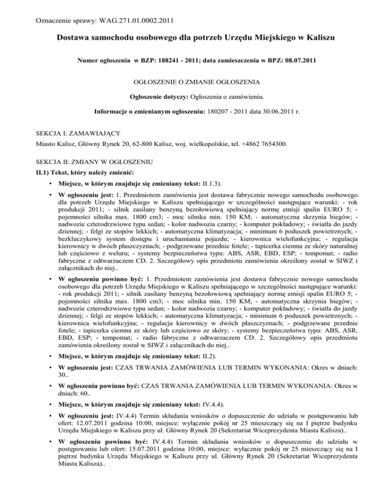 Oznaczenie sprawy: WAG.271.01.0002.2011 Dostawa samochodu osobowego dla potrzeb Urzędu Miejskiego w Kaliszu Numer ogłoszenia w BZP: 188241 - 2011; data zamieszczenia w BPZ: 08.07.2011 OGŁOSZENIE O ZMIANIE OGŁOSZENIA Ogłoszenie dotyczy: Ogłoszenia o zamówieniu. Informacje o zmienianym ogłoszeniu: 180207 - 2011 data 30.06.2011 r. SEKCJA I: ZAMAWIAJĄCY Miasto Kalisz, Główny Rynek 20, 62-800 Kalisz, woj. wielkopolskie, tel. +4862 7654300. SEKCJA II: ZMIANY W OGŁOSZENIU II.1) Tekst, który należy zmienić: • Miejsce, w którym znajduje się zmieniany tekst: II.1.3). • W ogłoszeniu jest: 1. Przedmiotem zamówienia jest dostawa fabrycznie nowego samochodu osobowego dla potrzeb Urzędu Miejskiego w Kaliszu spełniającego w szczególności następujące warunki: - rok produkcji 2011; - silnik zasilany benzyną bezołowiową spełniający normę emisji spalin EURO 5; pojemności silnika max. 1800 cm3; - moc silnika min. 150 KM; - automatyczna skrzynia biegów; nadwozie czterodrzwiowe typu sedan; - kolor nadwozia czarny; - komputer pokładowy; - światła do jazdy dziennej; - felgi ze stopów lekkich; - automatyczna klimatyzacja; - minimum 6 poduszek powietrznych; bezkluczykowy system dostępu i uruchamiania pojazdu; - kierownica wielofunkcyjna; - regulacja kierownicy w dwóch płaszczyznach; - podgrzewane przednie fotele; - tapicerka ciemna ze skóry naturalnej lub częściowo z weluru; - systemy bezpieczeństwa typu: ABS, ASR, EBD, ESP; - tempomat; - radio fabryczne z odtwarzaczem CD. 2. Szczegółowy opis przedmiotu zamówienia określony został w SIWZ i załącznikach do niej.. • W ogłoszeniu powinno być: 1. Przedmiotem zamówienia jest dostawa fabrycznie nowego samochodu osobowego dla potrzeb Urzędu Miejskiego w Kaliszu spełniającego w szczególności następujące warunki: - rok produkcji 2011; - silnik zasilany benzyną bezołowiową spełniający normę emisji spalin EURO 5; pojemności silnika max. 1800 cm3; - moc silnika min. 150 KM; - automatyczna skrzynia biegów; nadwozie czterodrzwiowe typu sedan; - kolor nadwozia czarny; - komputer pokładowy; - światła do jazdy dziennej; - felgi ze stopów lekkich; - automatyczna klimatyzacja; - minimum 6 poduszek powietrznych; kierownica wielofunkcyjna; - regulacja kierownicy w dwóch płaszczyznach; - podgrzewane przednie fotele; - tapicerka ciemna ze skóry lub częściowo ze skóry; - systemy bezpieczeństwa typu: ABS, ASR, EBD, ESP; - tempomat; - radio fabryczne z odtwarzaczem CD. 2. Szczegółowy opis przedmiotu zamówienia określony został w SIWZ i załącznikach do niej.. • Miejsce, w którym znajduje się zmieniany tekst: II.2). • W ogłoszeniu jest: CZAS TRWANIA ZAMÓWIENIA LUB TERMIN WYKONANIA: Okres w dniach: 30.. • W ogłoszeniu powinno być: CZAS TRWANIA ZAMÓWIENIA LUB TERMIN WYKONANIA: Okres w dniach: 60.. • Miejsce, w którym znajduje się zmieniany tekst: IV.4.4). • W ogłoszeniu jest: IV.4.4) Termin składania wniosków o dopuszczenie do udziału w postępowaniu lub ofert: 12.07.2011 godzina 10:00, miejsce: wyłącznie pokój nr 25 mieszczący się na I piętrze budynku Urzędu Miejskiego w Kaliszu przy ul. Główny Rynek 20 (Sekretariat Wiceprezydenta Miasta Kalisza).. • W ogłoszeniu powinno być: IV.4.4) Termin składania wniosków o dopuszczenie do udziału w postępowaniu lub ofert: 15.07.2011 godzina 10:00, miejsce: wyłącznie pokój nr 25 mieszczący się na I piętrze budynku Urzędu Miejskiego w Kaliszu przy ul. Główny Rynek 20 (Sekretariat Wiceprezydenta Miasta Kalisza)..