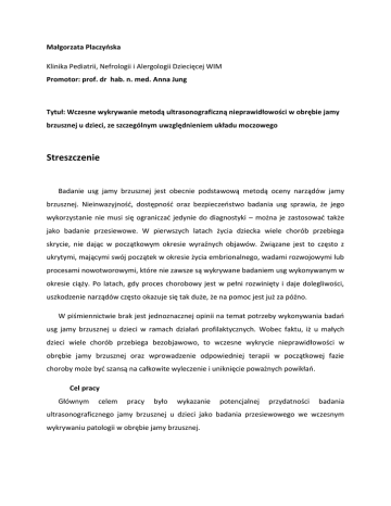 Małgorzata Placzyńska Klinika Pediatrii, Nefrologii i Alergologii Dziecięcej WIM Promotor: prof. dr hab. n. med. Anna Jung Tytuł: Wczesne wykrywanie metodą ultrasonograficzną nieprawidłowości w obrębie jamy brzusznej u dzieci, ze szczególnym uwzględnieniem układu moczowego Streszczenie Badanie usg jamy brzusznej jest obecnie podstawową metodą oceny narządów jamy brzusznej. Nieinwazyjność, dostępność oraz bezpieczeństwo badania usg sprawia, że jego wykorzystanie nie musi się ograniczać jedynie do diagnostyki – można je zastosować także jako badanie przesiewowe. W pierwszych latach życia dziecka wiele chorób przebiega skrycie, nie dając w początkowym okresie wyraźnych objawów. Związane jest to często z ukrytymi, mającymi swój początek w okresie życia embrionalnego, wadami rozwojowymi lub procesami nowotworowymi, które nie zawsze są wykrywane badaniem usg wykonywanym w okresie ciąży. Po latach, gdy proces chorobowy jest w pełni rozwinięty i daje dolegliwości, uszkodzenie narządów często okazuje się tak duże, że na pomoc jest już za późno. W piśmiennictwie brak jest jednoznacznej opinii na temat potrzeby wykonywania badań usg jamy brzusznej u dzieci w ramach działań profilaktycznych. Wobec faktu, iż u małych dzieci wiele chorób przebiega bezobjawowo, to wczesne wykrycie nieprawidłowości w obrębie jamy brzusznej oraz wprowadzenie odpowiedniej terapii w początkowej fazie choroby może być szansą na całkowite wyleczenie i uniknięcie poważnych powikłań. Cel pracy Głównym celem pracy było wykazanie potencjalnej przydatności badania ultrasonograficznego jamy brzusznej u dzieci jako badania przesiewowego we wczesnym wykrywaniu patologii w obrębie jamy brzusznej. Szczegółowe cele pracy to wykazanie przydatności badania usg jamy brzusznej w wykrywaniu:  wad wrodzonych w obrębie jamy brzusznej ze szczególnym uwzględnieniem układu moczowego  zmian rozrostowych w obrębie jamy brzusznej  kamicy układu moczowego. Materiał i metody Przebadano 500 dzieci (252 dziewczynki i 248 chłopców) w wieku od 1 miesiąca do 7 lat, które nigdy wcześniej nie miały wykonywanego badania usg jamy brzusznej. Spośród nich 44,4% stanowiły niemowlęta, a 55,6% dzieci powyżej 1. roku życia. W analizowanej grupie zbadano 383/500 (76,6%) dzieci z Warszawy i okolic oraz 117/500 (23,4%) dzieci z okolic Muszyny w województwie małopolskim. Wyniki Nieprawidłowości w badaniu usg jamy brzusznej stwierdzono u 14,29% przebadanych dziewczynek oraz u 12,9% chłopców. Wśród niemowląt odsetek ten wynosił 18,02%, z kolei u starszych dzieci – 10,07%. W przebadanej grupie pacjentów z Warszawy zmiany w badaniu usg stwierdzono u 57 dzieci, co stanowiło 14,88%. W grupie pacjentów spoza Warszawy nieprawidłowości stwierdzono u 9,40% pacjentów. Ze względu na zbyt małą liczbę przebadanych niemowląt w grupie spoza Warszawy, porównanie dwóch grup ze względu na miejsce zamieszkania nie było możliwe. W całej badanej grupie nieprawidłowości stwierdzono u 13,6% przebadanych dzieci. Najczęściej stwierdzano poszerzenia układów kielichowo-miedniczkowych. Kolejnym często opisywanym odchyleniem od normy było zdwojenie układu kielichowo-miedniczkowego. U 4 pacjentów badanie ultrasonograficzne wykazało poszerzenie moczowodu. U 2 dzieci stwierdzono kamicę układu moczowego, dwóch pacjentów miało asymetrię wielkości nerek. U jednego dziecka stwierdzono ureterocele. U pojedynczych pacjentów opisano agenezję nerki, torbiel śledziony oraz guz w jamie brzusznej. Wnioski 1. Badanie ultrasonograficzne jamy brzusznej, wykonane w ramach diagnostyki przesiewowej u niemowląt lub małych dzieci, pozwala na wczesne rozpoznanie wad układu moczowego oraz innych nieprawidłowości w obrębie jamy brzusznej, zatem powinno być umieszczone w programie obowiązujących badań przesiewowych. 2. Mimo obowiązującego programu prenatalnych badań ultrasonograficznych nadal w usg u niemowląt wykrywane są wrodzone wady układu moczowego, których nie uwidoczniono w okresie życia płodowego. 3. Wykonanie przesiewowego badania usg może być szansą na wczesne wykrycie zmian nowotworowych w obrębie jamy brzusznej u dzieci. 4. Badanie usg jamy brzusznej pozwala na wykrycie w populacji dziecięcej schorzeń o potencjalnych poważnych konsekwencjach klinicznych, takich jak: kamica układu moczowego, torbiel śledziony. Summary Abdominal ultrasound is currently the primary method of assessing organs inside of the abdomen. As it is non-invasive, available and secure procedure, it may be used not only to the diagnosis but also as a screening test. In the first years of life many diseases can go secretly, without any symptoms at the beginning. This is often related to the malformations or neoplastic processes, having its origin in the embryonic stage of life, which are not always detected by the ultrasound examination performed during pregnancy. After years when the disease process is fully developed and symptomatic, organ damage is so advanced that it is too late for help. In the literature there is no explicit opinion on the need of performing abdominal ultrasound as a screening test in children. Because many disorders of small children are asymptomatic, the early detection of abdominal abnormalities and the implementation of appropriate treatment in the early stages of the disease may be a chance to avoid serious complications and achieve full recovery. Objectives The main objective of the study was to demonstrate the potential usefulness of abdominal ultrasound in children as a screening test for the early detection of pathologies in the abdomen. The specific objectives of the work were to show that ultrasound testing can be suitable in detecting: • congenital defects in the abdominal cavity including particularly the urinary tract • neoplastic lesions in the abdominal cavity • urolithiasis . Material and methods The study included 500 c