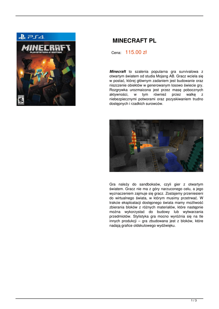 MINECRAFT PL Cena: 115.00 zł Minecraft to szalenia popularna gra survivalowa z otwartym światem od studia Mojang AB. Gracz wciela się w postać, której głównym zadaniem jest budowanie oraz niszczenie obiektów w generowanym losowo świecie gry. Rozgrywka urozmaicona jest przez masę pobocznych aktywności, w tym również przez walkę z niebezpiecznymi potworami oraz pozyskiwaniem trudno dostępnych i rzadkich surowców. Gra należy do sandboksów, czyli gier z otwartym światem. Gracz nie ma z góry narzuconego celu, a jego wyznaczeniem zajmuje się gracz. Zostajemy przeniesieni do wirtualnego świata, w którym musimy przetrwać. W trakcie eksploatacji dostępnego świata mamy możliwość zbierania bloków z różnych materiałów, które następnie można wykorzystać do budowy lub wytwarzania przedmiotów. Stylistyka gra mocno wyróżnia się na tle innych produkcji – gra zbudowana jest z bloków, które nadają grafice oldskulowego wydźwięku. 1/3 Mechanika rozgrywki jest nieskomplikowana i mocno uproszczona. Dzięki temu jest to tytuł idealny zarówno dla dzieci, jak i osób dorosłych. Mamy możliwość grania w dwóch różnych trybach. W klasycznym możemy swobodnie stawiać konstrukcję i poświęcić się budowaniu coraz większych obiektów. W trybie survivalu noc będzie wielkim zagrożeniem, któremu będziemy musieli stawić czoła. Gra oferuje tryb wieloosobowy, w którym możemy spotkać się z innymi graczami i wspólnie wznosić coraz większe i bardziej wyszukane konstrukcje. Zobacz wideo: Szczegóły 2/3 wersja językowa POLSKA 3/3 Powered by TCPDF (www.tcpdf.org)