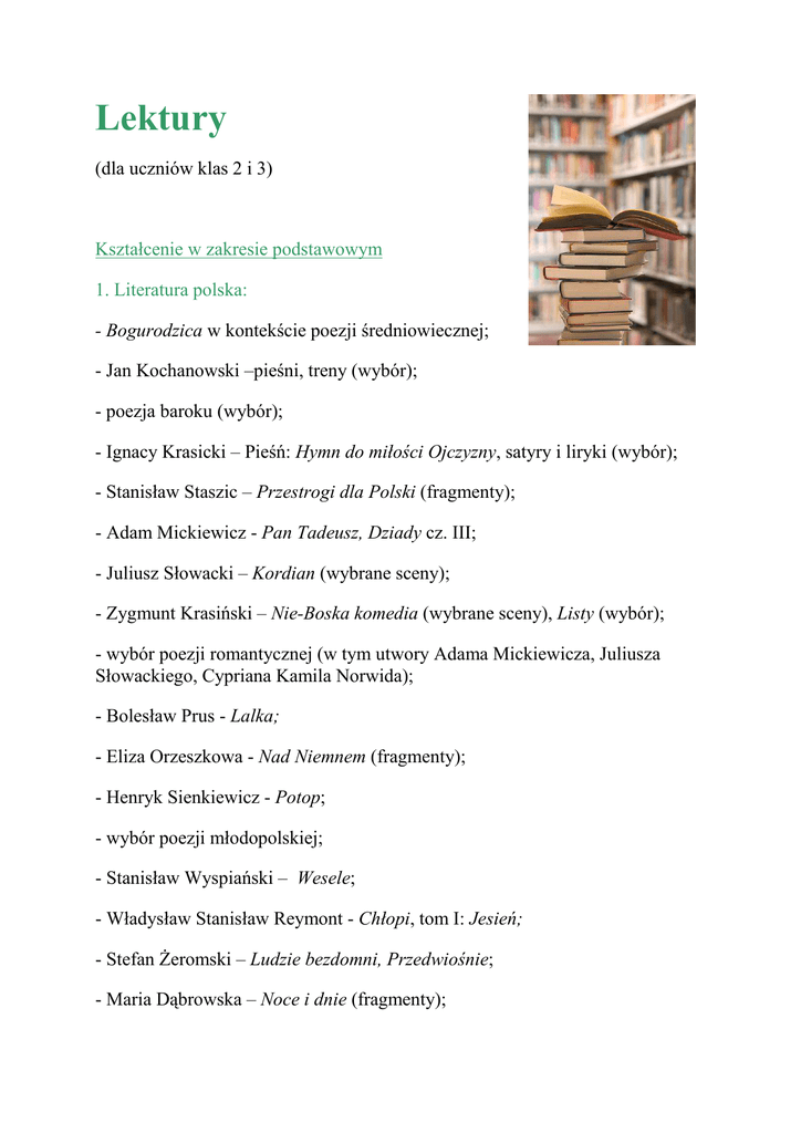 Lektury (dla uczniów klas 2 i 3) Kształcenie w zakresie podstawowym 1. Literatura polska: - Bogurodzica w kontekście poezji średniowiecznej; - Jan Kochanowski –pieśni, treny (wybór); - poezja baroku (wybór); - Ignacy Krasicki – Pieśń: Hymn do miłości Ojczyzny, satyry i liryki (wybór); - Stanisław Staszic – Przestrogi dla Polski (fragmenty); - Adam Mickiewicz - Pan Tadeusz, Dziady cz. III; - Juliusz Słowacki – Kordian (wybrane sceny); - Zygmunt Krasiński – Nie-Boska komedia (wybrane sceny), Listy (wybór); - wybór poezji romantycznej (w tym utwory Adama Mickiewicza, Juliusza Słowackiego, Cypriana Kamila Norwida); - Bolesław Prus - Lalka; - Eliza Orzeszkowa - Nad Niemnem (fragmenty); - Henryk Sienkiewicz - Potop; - wybór poezji młodopolskiej; - Stanisław Wyspiański – Wesele; - Władysław Stanisław Reymont - Chłopi, tom I: Jesień; - Stefan Żeromski – Ludzie bezdomni, Przedwiośnie; - Maria Dąbrowska – Noce i dnie (fragmenty); - Zofia Nałkowska – Granica; - Sławomir Mrożek - Tango; - Witold Gombrowicz – Ferdydurke; - Tadeusz Borowski - Pożegnanie z Marią (wybrane opowiadania); - Gustaw Herling-Grudziński – Inny świat (fragmenty); - wybór poezji XX wieku (w tym utwory Bolesława Leśmiana, Leopolda Staffa, Juliana Tuwima, Marii Pawlikowskiej - Jasnorzewskiej, Czesława Miłosza, Krzysztofa Kamila Baczyńskiego, Zbigniewa Herberta, Tadeusza Różewicza, Mirona Białoszewskiego, Wisławy Szymborskiej, Stanisława Barańczaka, ks. Jana Twardowskiego); - inne wybrane fragmenty prozy dokumentalnej (reportaż, dziennik, pamiętnik) i eseistycznej; - inne utwory zaproponowane przez uczniów i nauczyciela; - teksty kultury (adaptacje filmowe powieści i inne filmy, spektakle teatralne, utwory muzyczne, obrazy, słuchowiska, programy telewizyjne, teksty prasowe). 2. Literatura powszechna: - Sofokles - Król Edyp; - Horacy - wybór pieśni; - Wiliam Szekspir - Makbet; - Molier - Świętoszek; - Johann Wolfgang von Goethe – Cierpienia młodego Wertera (fragmenty); - Fiodor Dostojewski – Zbrodnia i kara; - Joseph Conrad – Jądro ciemności. Kształcenie w zakresie rozszerzonym 1. Literatura polska: - Jan Kochanowski - Treny; - Henryk Rzewuski – Pamiątki Soplicy; - wybrany dramat romantyczny Juliusza Słowackiego lub Zygmunta Krasińskiego; - Stanisław Ignacy Witkiewicz – Szewcy (fragmenty); - Maria Kuncewiczowa – Cudzoziemka; - wybrany utwór polskich pisarzy emigracyjnych (Andrzeja Bobkowskiego, Witolda Gombrowicza i Józefa Mackiewicza). 2. Literatura powszechna: - Dante Alighieri - Boska Komedia (fragmenty Piekła); - Franz Kafka – Proces (fragmenty); - Michaił Bułhakow - Mistrz i Małgorzata; - Platon – Obrona Sokratesa.