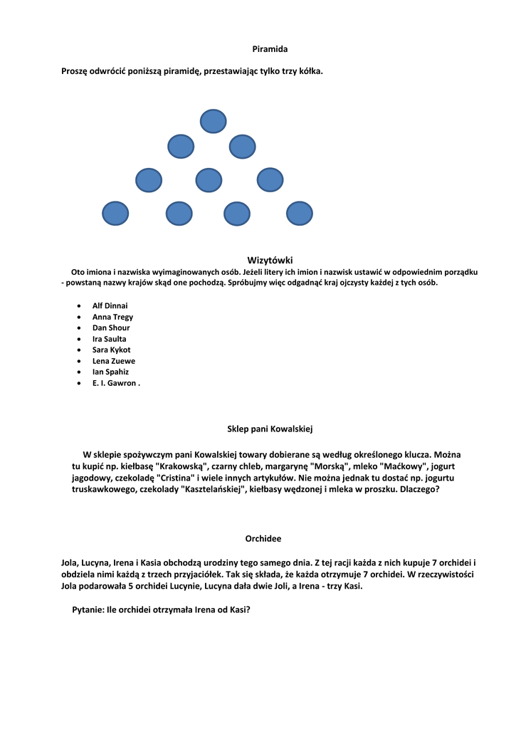 Piramida Proszę odwrócić poniższą piramidę, przestawiając tylko trzy kółka. Wizytówki Oto imiona i nazwiska wyimaginowanych osób. Jeżeli litery ich imion i nazwisk ustawić w odpowiednim porządku - powstaną nazwy krajów skąd one pochodzą. Spróbujmy więc odgadnąć kraj ojczysty każdej z tych osób. Alf Dinnai Anna Tregy Dan Shour Ira Saulta Sara Kykot Lena Zuewe Ian Spahiz E. I. Gawron . Sklep pani Kowalskiej W sklepie spożywczym pani Kowalskiej towary dobierane są według określonego klucza. Można tu kupić np. kiełbasę "Krakowską", czarny chleb, margarynę "Morską", mleko "Maćkowy", jogurt jagodowy, czekoladę "Cristina" i wiele innych artykułów. Nie można jednak tu dostać np. jogurtu truskawkowego, czekolady "Kasztelańskiej", kiełbasy wędzonej i mleka w proszku. Dlaczego? Orchidee Jola, Lucyna, Irena i Kasia obchodzą urodziny tego samego dnia. Z tej racji każda z nich kupuje 7 orchidei i obdziela nimi każdą z trzech przyjaciółek. Tak się składa, że każda otrzymuje 7 orchidei. W rzeczywistości Jola podarowała 5 orchidei Lucynie, Lucyna dała dwie Joli, a Irena - trzy Kasi. Pytanie: Ile orchidei otrzymała Irena od Kasi?