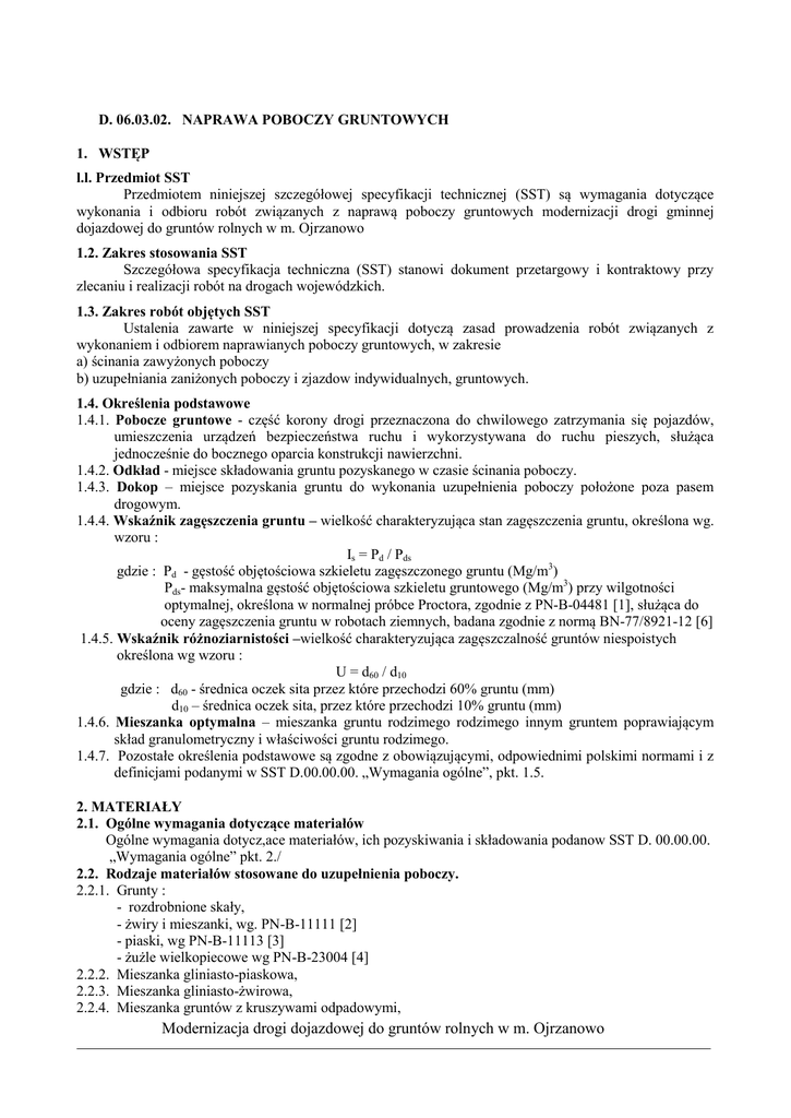 D. 06.03.02. NAPRAWA POBOCZY GRUNTOWYCH 1. WSTĘP l.l. Przedmiot SST Przedmiotem niniejszej szczegółowej specyfikacji technicznej (SST) są wymagania dotyczące wykonania i odbioru robót związanych z naprawą poboczy gruntowych modernizacji drogi gminnej dojazdowej do gruntów rolnych w m. Ojrzanowo 1.2. Zakres stosowania SST Szczegółowa specyfikacja techniczna (SST) stanowi dokument przetargowy i kontraktowy przy zlecaniu i realizacji robót na drogach wojewódzkich. 1.3. Zakres robót objętych SST Ustalenia zawarte w niniejszej specyfikacji dotyczą zasad prowadzenia robót związanych z wykonaniem i odbiorem naprawianych poboczy gruntowych, w zakresie a) ścinania zawyżonych poboczy b) uzupełniania zaniżonych poboczy i zjazdow indywidualnych, gruntowych. 1.4. Określenia podstawowe 1.4.1. Pobocze gruntowe - część korony drogi przeznaczona do chwilowego zatrzymania się pojazdów, umieszczenia urządzeń bezpieczeństwa ruchu i wykorzystywana do ruchu pieszych, służąca jednocześnie do bocznego oparcia konstrukcji nawierzchni. 1.4.2. Odkład - miejsce składowania gruntu pozyskanego w czasie ścinania poboczy. 1.4.3. Dokop – miejsce pozyskania gruntu do wykonania uzupełnienia poboczy położone poza pasem drogowym. 1.4.4. Wskaźnik zagęszczenia gruntu – wielkość charakteryzująca stan zagęszczenia gruntu, określona wg. wzoru : Is = Pd / Pds gdzie : Pd - gęstość objętościowa szkieletu zagęszczonego gruntu (Mg/m3) Pds- maksymalna gęstość objętościowa szkieletu gruntowego (Mg/m3) przy wilgotności optymalnej, określona w normalnej próbce Proctora, zgodnie z PN-B-04481 [1], służąca do oceny zagęszczenia gruntu w robotach ziemnych, badana zgodnie z normą BN-77/8921-12 [6] 1.4.5. Wskaźnik różnoziarnistości –wielkość charakteryzująca zagęszczalność gruntów niespoistych określona wg wzoru : U = d60 / d10 gdzie : d60 - średnica oczek sita przez które przechodzi 60% gruntu (mm) d10 – średnica oczek sita, przez które przechodzi 10% gruntu (mm) 1.4.6. Mieszanka optymalna – mieszanka gruntu rodzimego rodzimego innym gruntem poprawiającym skład granulometryczny i właściwości gruntu rodzimego. 1.4.7. Pozostałe określenia podstawowe są zgodne z obowiązującymi, odpowiednimi polskimi normami i z definicjami podanymi w SST D.00.00.00. „Wymagania ogólne”, pkt. 1.5. 2. MATERIAŁY 2.1. Ogólne wymagania dotyczące materiałów Ogólne wymagania dotycz,ace materiałów, ich pozyskiwania i składowania podanow SST D. 00.00.00. „Wymagania ogólne” pkt. 2./ 2.2. Rodzaje materiałów stosowane do uzupełnienia poboczy. 2.2.1. Grunty : - rozdrobnione skały, - żwiry i mieszanki, wg. PN-B-11111 [2] - piaski, wg PN-B-11113 [3] - żużle wielkopiecowe wg PN-B-23004 [4] 2.2.2. Mieszanka gliniasto-piaskowa, 2.2.3. Mieszanka gliniasto-żwirowa, 2.2.4. Mieszanka gruntów z kruszywami odpadowymi, Modernizacja drogi dojazdowej do gruntów rolnych w m. Ojrzanowo 2.2.5. Kruszywo łamane 2.2.6. Destrukt z frezowania nawierzchni bitumicznych. 2.3. Wymagania dla materiałów Przydatność materiału do wbudowania Wykonawca powinien sprawdzić na odcinku próbnym i uzyskać zgodę Inżyniera na jego zastosowanie. 3. SPRZĘT Wykonawca przystępujący do wykonania robót określonych w niniejszej SST powinien wykazać się możliwością korzystania z następującego sprzętu: - zrywarki, kultywatory lub brony talerzowe do ewentualnego spulchnienia gruntu, - ścinarka poboczy lub zestaw sprzętowy umożliwiający ścinkę poboczy, - równiarka, - ładowarka czołowa i chwytakowa do załadunku gruntu, -walce statyczne gładkie, ogumione lub wibracyjne do 5ton, - zagęszczarka płytowa, wibracyjna. 4. TRANSPORT Do wykonania robót Wykonawca zapewni dowolne środki transportowe (np. samochody skrzyniowe, samochody samowyładowcze lub ciągniki z przyczepami). Preferuje się stosowanie środków transportowych samowyładowczych. 5. WYKONANIE ROBÓT Ścinanie poboczy może być wykonywane ręcznie, za pomocą łopat lub sprzętem mechanicznym wg pkt. 3 Ścinanie poboczy należy przeprowadzić od krawędzi pobocza do krawędzi nawierzchni. Nadmiar gruntu uzyskanego podczas ścinania poboczy należy wywieźć na odkład. Miejsce odkładu pozostaje w gestii Wykonawcy. Grunt pozostały w poboczu należy spulchnić na głębokość od 5 do 10 cm, doprowadzić do wilgotności optymalnej poprzez dodanie wody i zagęścić. Przed przystąpieniem do robót związanych z uzupełnieniem poboczy destruktem z frezowania nawierzchni bitumicznych Wykonawca jest zobowiązany dokonać : - usunięcie z uzupełnianych powierzchni zanieczyszczeń takich jak galęzie, kamienie, liście z drzew, trawy i chwastów, - wyznaczenie szerokości uzupełnianego pobocza z wyrównaniem podłoża, - odwodnienie uzupełnianych powierzchni w przypadku stwierdzenia zastoisk wodnych, przez wykopanie rowków odwadniających. Materiał uzupełniający powinien być równomiernie rozkładany na całej powierzchni uzupełnianego pobocza oraz profilowany do wymaganego spadku poprzecznego za pomocą równiarek. Zagęszczenie materiału uzupełniającego powinno być dokonywane za pomocą walców, których rodzaj Wykonawca uzgodni z Inżynierem. Zagęszczenie pobocza prowadzić od jego krawędzi w kierunku nawierzchni jezdni. Zagęszczona powierzchnia powinna być równa, posiadać jednakowy spadek poprzeczny zgodny ze spadkiem założonym oraz nie posiadać śladów kół od walców. Wskaźnik zagęszczenia określony zgodnie z BN-77/8931-12, powinien wynosić, co najmniej 0,98 maksymalnego zagęszczenia, według normalnej metody Proctora, zgodnie z PN-B-04481. 6. KONTROLA JAKOŚCI ROBÓT Pomiar cech geometrycznych ścinanych lub uzupełnianych poboczy Częstotliwość oraz zakres pomiarów po zakończeniu robót podano w tablicy 1. Modernizacja drogi dojazdowej do gruntów rolnych w m. Ojrzanowo Tablica 1. Częstotliwość oraz zakres pomiarów ścinanych lub uzupełnianych poboczy Lp Wyszc