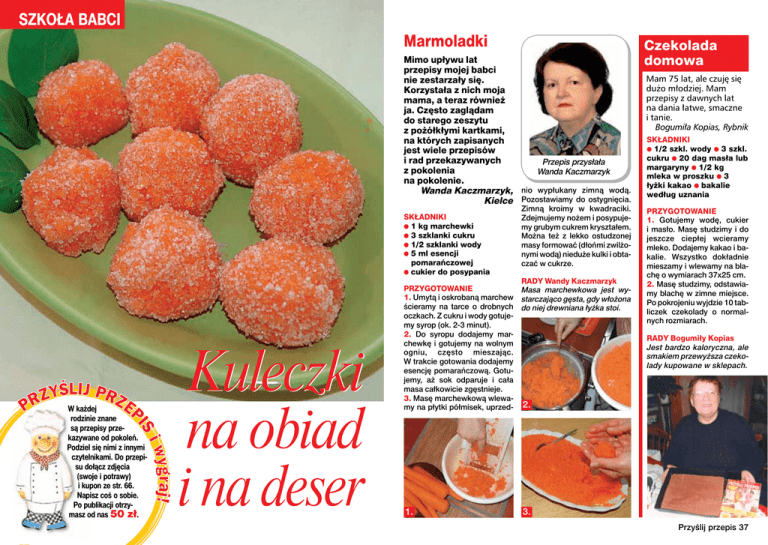 SZKOŁA BABCI Marmoladki Mimo upływu lat przepisy mojej babci nie zestarzały się. Korzystała z nich moja mama, a teraz również ja. Często zaglądam do starego zeszytu z pożółkłymi kartkami, na których zapisanych jest wiele przepisów i rad przekazywanych Przepis przysłała z pokolenia Wanda Kaczmarzyk na pokolenie. Wanda Kaczmarzyk, nio wypłukany zimną wodą. Kielce Pozostawiamy do ostygnięcia. SKŁADNIKI ● 1 kg marchewki ● 3 szklanki cukru ● 1/2 szklanki wody ● 5 ml esencji pomarańczowej ● cukier do posypania W każdej rodzinie znane są przepisy przekazywane od pokoleń. Podziel się nimi z innymi czytelnikami. Do przepisu dołącz zdjęcia (swoje i potrawy) i kupon ze str. 66. Napisz coś o sobie. Po publikacji otrzymasz od nas 50 zł. Kuleczki na obiad i na deser Zimną kroimy w kwadraciki. Zdejmujemy nożem i posypujemy grubym cukrem kryształem. Można też z lekko ostudzonej masy formować (dłońmi zwilżonymi wodą) nieduże kulki i obtaczać w cukrze. RADY Wandy Kaczmarzyk PRZYGOTOWANIE Masa marchewkowa jest wy1. Umytą i oskrobaną marchew starczająco gęsta, gdy włożona ścieramy na tarce o drobnych do niej drewniana łyżka stoi. oczkach. Z cukru i wody gotujemy syrop (ok. 2-3 minut). 2. Do syropu dodajemy marchewkę i gotujemy na wolnym ogniu, często mieszając. W trakcie gotowania dodajemy esencję pomarańczową. Gotujemy, aż sok odparuje i cała masa całkowicie zgęstnieje. 3. Masę marchewkową wlewamy na płytki półmisek, uprzed- 2. 1. Czekolada domowa Mam 75 lat, ale czuję się dużo młodziej. Mam przepisy z dawnych lat na dania łatwe, smaczne i tanie. Bogumiła Kopias, Rybnik SKŁADNIKI ● 1/2 szkl. wody ● 3 szkl. cukru ● 20 dag masła lub margaryny ● 1/2 kg mleka w proszku ● 3 łyżki kakao ● bakalie według uznania PRZYGOTOWANIE 1. Gotujemy wodę, cukier i masło. Masę studzimy i do jeszcze ciepłej wcieramy mleko. Dodajemy kakao i bakalie. Wszystko dokładnie mieszamy i wlewamy na blachę o wymiarach 37x25 cm. 2. Masę studzimy, odstawiamy blachę w zimne miejsce. Po pokrojeniu wyjdzie 10 tabliczek czekolady o normalnych rozmiarach. RADY Bogumiły Kopias Jest bardzo kaloryczna, ale smakiem przewyższa czekolady kupowane w sklepach. 3. Przyślij przepis 37