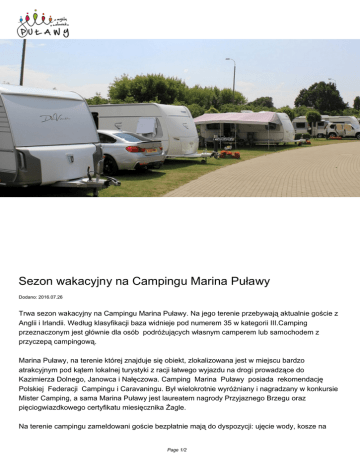 Sezon wakacyjny na Campingu Marina Puławy Dodano: 2016.07.26 Trwa sezon wakacyjny na Campingu Marina Puławy. Na jego terenie przebywają aktualnie goście z Anglii i Irlandii. Według klasyfikacji baza widnieje pod numerem 35 w kategorii III.Camping przeznaczonym jest głównie dla osób podróżujących własnym camperem lub samochodem z przyczepą campingową. Marina Puławy, na terenie której znajduje się obiekt, zlokalizowana jest w miejscu bardzo atrakcyjnym pod kątem lokalnej turystyki z racji łatwego wyjazdu na drogi prowadzące do Kazimierza Dolnego, Janowca i Nałęczowa. Camping Marina Puławy posiada rekomendację Polskiej Federacji Campingu i Caravaningu. Był wielokrotnie wyróżniany i nagradzany w konkursie Mister Camping, a sama Marina Puławy jest laureatem nagrody Przyjaznego Brzegu oraz pięciogwiazdkowego certyfikatu miesięcznika Żagle. Na terenie campingu zameldowani goście bezpłatnie mają do dyspozycji: ujęcie wody, kosze na Page 1/2 śmieci, oświetlone pole campingowe, zespoły sanitariatów: toalety, prysznice, umywalki, ciepłą i zimną wodę, itp. Na terenie campingu zameldowani goście odpłatnie mają do dyspozycji: dostęp do energii elektrycznej, parking, kajaki, łodzie, rowery. Fot. Antoni Rękas. Źródło: Page 2/2
