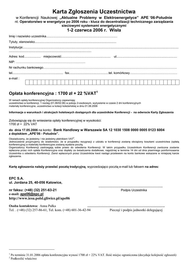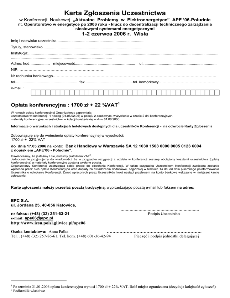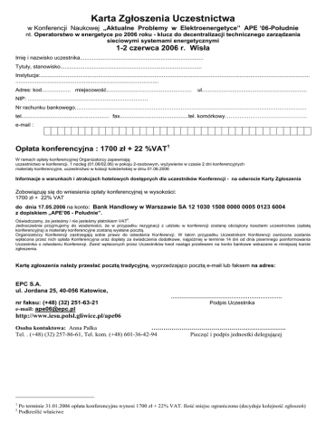 Karta Zgłoszenia Uczestnictwa w Konferencji Naukowej „Aktualne Problemy w Elektroenergetyce” APE ’06-Południe nt. Operatorstwo w energetyce po 2006 roku - klucz do decentralizacji technicznego zarządzania sieciowymi systemami energetycznymi 1-2 czerwca 2006 r. Wisła Imię i nazwisko uczestnika................................................................................. Tytuły, stanowisko............................................................................................. Instytucja:................................................................................................................................................................................. .............................................................................................. Adres: kod................... miejscowość........................................................ ul..................................................................... NIP: ………………………………………………………… Nr rachunku bankowego………………………………………………………………………………………………………………. tel.......................................................... fax.............................................tel. komórkowy……………………………………… e-mail : Opłata konferencyjna : 1700 zł + 22 %VAT1 W ramach opłaty konferencyjnej Organizatorzy zapewniają: uczestnictwo w konferencji, 1 nocleg (01.06/02.06) w pokoju 2-osobowym, wyżywienie w czasie 2 dni konferencyjnych materiały konferencyjne, uczestnictwo w kolacji koleżeńskiej w dniu 01.06.2006 Informacje o warunkach i atrakcjach hotelowych dostępnych dla uczestników Konferencji - na odwrocie Karty Zgłoszenia Zobowiązuję się do wniesienia opłaty konferencyjnej w wysokości: 1700 zł + 22% VAT do dnia 17.05.2006 na konto: Bank Handlowy w Warszawie SA 12 1030 1508 0000 0005 0123 6004 z dopiskiem „APE’06 - Południe”. 2 Oświadczamy, że jesteśmy / nie jesteśmy płatnikiem VAT . Jednocześnie przyjmujemy do wiadomości, że w przypadku rezygnacji z udziału w konferencji zostanę obciążony kosztami uczestnictwa (opłatą konferencyjną) a materiały konferencyjne zostaną wysłane pocztą. Organizatorzy Konferencji zastrzegają sobie prawo do odwołania Konferencji. W takim przypadku Uczestnikom Konferencji zwrócona zostanie wpłacona przez nich opłata Konferencyjna oraz dopłaty za świadczenia dodatkowe, najpóźniej w terminie 14 dni od dnia pisemnego poinformowania Uczestnika o odwołaniu Konferencji. Zwrot wpłaconych przez Uczestników kwot nastąpi przelewem na konto bankowe wskazane w niniejszej karcie zgłoszenia. Kartę zgłoszenia należy przesłać pocztą tradycyjną, wyprzedzająco pocztą e-mail lub faksem na adres: EPC S.A. ul. Jordana 25, 40-056 Katowice, nr faksu: (+48) (32) 251-63-21 e-mail: [email protected] ……………………………………………………. Podpis Uczestnika http://www.iesu.polsl.gliwice.pl/ape06 Osoba kontaktowa: Anna Pałka …………………………………………………………. Tel. . (+48) (32) 257-86-61, Tel. kom. (+48) 601-36-42-94 Pieczęć i podpis jednostki delegującej 1 2 Po terminie 31.01.2006 opłata konferencyjna wynosi 1700 zł + 22% VAT. Ilość miejsc ograniczona (decyduje kolejność zgłoszeń) Podkreślić właściwe Miejsce Konferencji Konferencja obędzie się w ekskluzywnym Hotelu Gołębiewski, usytuowanym na zboczu Bukowej nad brzegiem Wisły. Z okien Hotelu roztacza się niepowtarzalny widok na piękny krajobraz Beskidu Śląskiego. Do dyspozycji Uczestników Konferencji będą wygodne pokoje hotelowe z łazienkami o wysokim standardzie. Obrady będą odbywać się w jednej z klimatyzowanych sal konferencyjnych z profesjonalnym wyposażeniem audiowizualnym i multimedialnym. Doskonały relaks gwarantuje Park Wodny Tropikana - kompleks basenów z licznymi zjeżdżalniami (łącznej długości ponad 550 m), falą wodną , basenem sportowym, basenami rekreacyjnymi, brodzikami dla dzieci, basenem "kaskadą" jakuzzi, różnorodnymi saunami i komorą śnieżną. Podczas pobytu w Hotelu będzie można skorzystać z aktywnego wypoczynku, do czego zachęcają znakomicie wyposażone pomieszczenia w Parku Wodnym Tropikana z masażami wodnymi, leczniczymi, relaksacyjnymi, saunami suchym i parowymi, biczami szkockimi, kąpielami perełkowymi, aromatycznymi i solankowymi, tepidarium. Goście hotelowi korzystają z kompleksu w godzinach 8.00-22.00, nieodpłatnie. W Hotelu znajdują się także dodatkowe atrakcje: eleganckie restauracje, Klub Nocny z Cocktail Barem, Gabinet Odnowy Biologicznej, siłownia, kręgielnia oraz pasaż handlowo-usługowy z gabinetami: kosmetycznym i fryzjerskim, komora kriogeniczna.