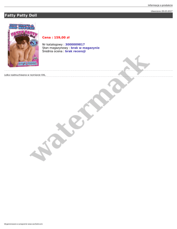 Informacje o produkcie Utworzono 09-03-2017 Fatty Patty Doll Cena : 159,00 zł w at Lalka nadmuchiwana w rozmiarze XXL. er m ar k Nr katalogowy : 3000009817 Stan magazynowy : brak w magazynie Średnia ocena : brak recenzji Wygenerowano w programie www.oscGold.com