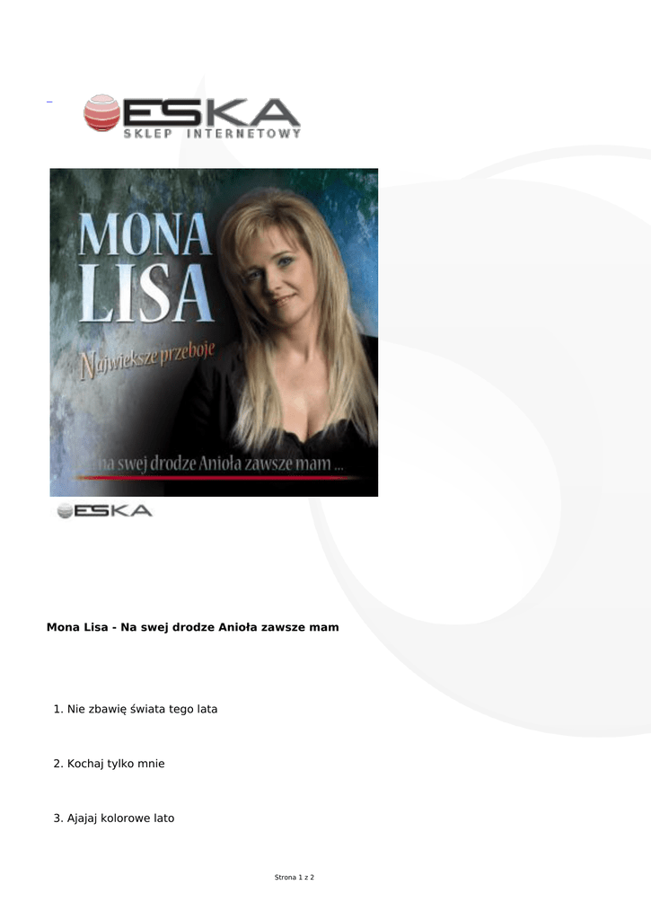 Mona Lisa - Na swej drodze Anioła zawsze mam 1. Nie zbawię świata tego lata 2. Kochaj tylko mnie 3. Ajajaj kolorowe lato Strona 1 z 2 4. Pocałunek na gorącej plaży 5. Zamknięte niebo 6. Zatańcz mambo 7. Na swej drodze Anioła zawsze mam 8. Warto dalej żyć 9. Niech lato 10. Miłość nie jest na jedną noc 11. Szalona noc 12. Śpiewajmy miłość 13. Rendez-vous 14. Wiązanka Strona 2 z 2