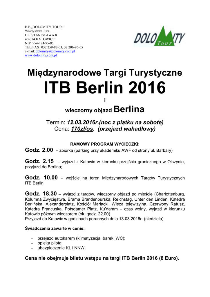 B.P.„DOLOMITY TOUR” Władysława Jura UL. STANISŁAWA 8 40-014 KATOWICE NIP: 954-184-95-85 TEL/FAX: 032 259-82-03, 32 206-96-65 e-mail: [email protected] www.dolomity.com.pl Międzynarodowe Targi Turystyczne ITB Berlin 2016 i wieczorny objazd Berlina Termin: 12.03.2016r.(noc z piątku na sobotę) Cena: 170zł/os. (przejazd wahadłowy) Godz. 2.00 Godz. 2.15 RAMOWY PROGRAM WYCIECZKI: – zbiórka (parking przy akademiku AWF od strony ul. Barbary) – wyjazd z Katowic w kierunku przejścia granicznego w Olszynie, przyjazd do Berlina; Godz. 10.00 ITB Berlin – wejście na teren Międzynarodowych Targów Turystycznych Godz. 18.30 – wyjazd z targów, wieczorny objazd po mieście (Charlottenburg, Kolumna Zwycięstwa, Brama Brandenburska, Reichstag, Unter den Linden, Katedra Berlińska, Alexanderplatz, Kościół Mariacki, Wieża telewizyjna, Czerwony Ratusz, Katedra Francuska, Potsdamer Platz, Ku’damm – czas wolny, wyjazd w kierunku Katowic późnym wieczorem (ok. godz. 22.00) Przyjazd do Katowic w godzinach porannych dnia 13.03.2016r. (niedziela) Świadczenia zawarte w cenie: - przejazd autokarem (klimatyzacja, barek, WC); opieka pilota; ubezpieczenie KL i NNW. Cena nie obejmuje biletu wstępu na targi ITB Berlin 2016 (8 Euro).