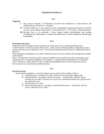 Regulamin Konkursu &1 Nagrody I. Jury przyzna nagrody i wyróżnienia (rzeczowe lub książkowe) a nauczycielom, lub opiekunom prac, honorowe – dyplomy. II. Laureaci konkursu, w tym uczniowie wraz z opiekunami zostaną zaproszeni na wernisaż wystawy, który będzie miał miejsce 10 listopada 2013 r. w Świetlicy w Radziechowach III. Decyzja Jury, co do podziału i formy nagród będzie nieodwołalna (nie podlega weryfikacji lub zaskarżeniu) i zostanie przedstawiona w formie publicznie ogłoszonego komunikatu. &2 Przeznaczenie prac Nadesłane prace nie będą zwracane autorom; po ocenie przez Jury, zostaną skatalogowane i zarchiwizowane w Stowarzyszeniu Dzieci Serc - gdzie stworzą odrębną kolekcję. Nagrodzone prace zostaną umieszczone na stałe jako wota w Grocie pod Jubileuszowym Krzyżem w Radziechowach na Matysce. Prace mogą być udostępniane wszystkim zainteresowanym na powszechnie obowiązujących zasadach archiwalnych. Prace, ich fragmenty lub streszczenia mogą być publikowane, przedstawiane lub wymieniane przez Organizatorów w specjalnej publikacji, ewentualnie w czasopismach ogólnokrajowych i lokalnych oraz w internecie, radiu, telewizji. We wszystkich przypadkach autorzy zachowują swoje prawa, również prawo do samodzielnej publikacji pracy &3 Kryteria oceny Ocenie będzie podlegać w systemie punktowym (w sumie można zdobyć 10 pkt.): a) zgodność pracy z tematem (0-1 pkt.); błąd rzeczowy powoduje odjęcie pkt. b) samodzielność i szczególne właściwości pracy – oryginalność, śmiałość ujęcia, trwałość itp. (0-5 pkt.); Prosimy nie używać do wykonania biżuterii art. spożywczych np. makaronów itp. c) estetyka pracy (0-1 pkt.). d) opis wykonanej pracy, w tym jaką ważną datę historyczną – wydarzenie chcemy uczcić i dlaczego (0 do 5 pkt.)