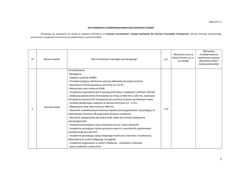 Załącznik nr 3 OPIS PRZEDMIOTU ZAMÓWIENIA/FORMULARZ OFERTOWO-CENOWY Nawiązując do zaproszenia do udziału w zapytaniu ofertowym na Dostawa termofonierki i pompy próżniowej dla Centrum Przemysłów Kreatywnych, oferuję realizację wymienionego asortymentu w podanych cenach brutto przedstawionych w poniższej tabeli: LP 1 Nazwa artykułu Termofornierka Opis minimalnych wymagań zamawiającego Termofornierka Wymagania: - Napięcie zasilania 3x400V - Przewód zasilający zakończony wtyczką adekwatną do prądu zasilania - Nominalne ciśnienie powietrza nie mniej niż 0,4 Pa - Maksymalna moc minimum 8 kW - Urządzenie wyposażone jest w pompę próżniową o wydajności minimum 20m3/h - Efektywna powierzchnia formowania nie mniej niż 460 mm x 320 mm, możliwość zmniejszenia powierzchni formowania przy pomocy systemu wymiennych ramek - Grubość obrabianego materiału w zakresie minimum 0,1 - 5 mm - Maksymalny skok stołu minimum 500 mm - Sterownik z wbudowanymi minimum dwoma termoregulatorami pozwalający na zapamiętanie minimum 49 programów działania urządzenia - Sterownik zintegrowany jako jedna bryła, łatwy do wymiany (połączenia wtyczka/gniazdo) - Urządzenie posiadające opcję sterowanie ręczne i przez sterownik - Urządzenie posiadające system grzania w oparciu o promienniki podczerwieni wysokotemperaturowe HTS - Urządzenie posiadające opcję wstępnego rozdmuchu materiału z możliwością doposażenia w moduł wstępnego rozciągania - Urządzenie wyposażone w system chłodzenia - wentylator turbinowy - Łatwa możliwość zmiany form j.m. Oferowana cena w złotych brutto za j.m. (za sztukę) Oferowany model/producent (wykonawca wpisuje oferowany model i nazwę producenta) 1 szt 1 LP 2 Nazwa artykułu Pompa próżniowa Opis minimalnych wymagań zamawiającego - Możliwość doposażenia urządzenia w stempel górny - Urządzenie posiadające certyfikat CE Wymagany 24 miesięczny okres gwarancji i rękojmi, wymagane zapewnienie serwisu pogwarancyjnego Pompa próżniowa: Wymagania: - Zasilanie 230 V lub 3 x 400 V - Moc minimum 0,9 kW - Łopatkowa-bezolejowa 3 - Wydajność minimum 25 m /h - Urządzenie posiadające certyfikat CE Wymagany 24 miesięczny okres gwarancji i rękojmi, wymagane zapewnienie serwisu pogwarancyjnego j.m. Oferowana cena w złotych brutto za j.m. (za sztukę) Oferowany model/producent (wykonawca wpisuje oferowany model i nazwę producenta) 1 szt. Razem: (suma wszystkich pozycji kolumny „Oferowana cena w złotych brutto za całość zamówienia”) Wartość należy przenieść do formularza ofertowego – załącznik nr 1 Oferujemy realizację całego asortymentu przedstawionego w niniejszym formularzu ofertowo-cenowym za cenę: ................................ zł brutto, słownie:.................................................................................................................................................................................................... zł brutto. ……………...................................... (Podpis i pieczęć Wykonawcy) 2