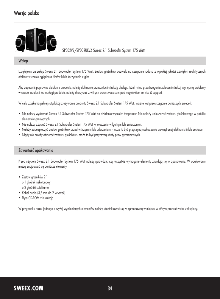 Wersja polska SP002V2/SP002UKV2 Sweex 2.1 Subwoofer System 175 Watt Wstęp Dziękujemy za zakup Sweex 2.1 Subwoofer System 175 Watt. Zestaw głośników pozwala na czerpanie radości z wysokiej jakości dźwięku i realistycznych efektów w czasie oglądania filmów i/lub korzystania z gier. Aby zapewnić poprawne działanie produktu, należy dokładnie przeczytać instrukcję obsługi. Jeżeli mimo przestrzegania zaleceń instrukcji występują problemy w czasie instalacji lub obsługi produktu, należy skorzystać z witryny www.sweex.com pod nagłówkiem service & support. W celu uzyskania pełnej satysfakcji z używania produktu Sweex 2.1 Subwoofer System 175 Watt, ważne jest przestrzeganie poniższych zaleceń: •Nie należy wystawiać Sweex 2.1 Subwoofer System 175 Watt na działanie wysokich temperatur. Nie należy umieszczać zestawu głośnikowego w pobliżu elementów grzewczych. •Nie należy używać Sweex 2.1 Subwoofer System 175 Watt w otoczeniu wilgotnym lub zakurzonym. •Należy zabezpieczyć zestaw głośników przed wstrząsami lub uderzeniami - może to być przyczyną uszkodzenia wewnętrznej elektroniki i/lub zestawu. •Nigdy nie należy otwierać zestawu głośników - może to być przyczyną utraty praw gwarancyjnych. Zawartość opakowania Przed użyciem Sweex 2.1 Subwoofer System 175 Watt należy sprawdzić, czy wszystkie wymagane elementy znajdują się w opakowaniu. W opakowaniu muszą znajdować się poniższe elementy: •Zestaw głośników 2.1: o 1 głośnik niskotonowy o 2 głośniki satelitarne •Kabel audio (3,5 mm do 2 wtyczek) •Płyta CD-ROM z instrukcją W przypadku braku jednego z wyżej wymienionych elementów należy skontaktować się ze sprzedawcą w miejscu w którym produkt został zakupiony. 34 Wersja polska Dane techniczne •Maksymalna moc głośników satelitarnych: 1,5 W RMS •Maksymalna moc głośnika niskotonowego: 5 W RMS •Ekranowanie pola magnetycznego •Wbudowany wzmacniacz stereo •2 głośniki satelitarne 2,5” •Regulacja głośności i niskich tonów •Plug and Play •Wbudowany zasilacz •Wejście: wtyczka stereo (RCA) •Wyjście: wtyczka stereo (RCA) •Zakres częstotliwości głośnika satelitarnego: 120 Hz – 20 KHz •Zakres częstotliwości głośnika niskotonowego: 50 Hz – 140 Hz •Średnica głośnika niskotonowego: 3” •Obsługuje: Windows 98SE, 2000 i XP Instalacja sprzętu Najpierw należy podłączyć głośniki satelitarne do głośnika niskotonowego. W tym celu należy podłączyć głośniki satelitarne do ‘OUTPUT’ głośnika niskotonowego. Czerwone złącze (R) jest przeznaczone dla prawego głośnika, białe złącze jest przeznaczone dla (L) lewego głośnika. 35 Wersja polska Następnie, należy podłączyć głośnik niskotonowy do źródła dźwięku. Należy zwrócić uwagę na kodowanie kolorów kabla audio i głośnika niskotonowego. W tym celu, należy użyć złącza ‘INPUT’ głośnika niskotonowego. Czerwone złącze (R) jest przeznaczone dla czerwonej wtyczki, białe złącze jest przeznaczone dla (L) białej wtyczki. Wtyczkę audio 3,5 mm można podłączyć do karty dźwiękowej lub innego dowolnego źródła dźwięku za pomocą złącza wyjściowego 3,5 mm. Na końcu należy podłączyć zestaw do zasilania i włączyć Sweex 2.1 Subwoofer System 175 Watt naciskając przycisk ‘POWER’ położony z przodu zestawu. Głośnik niskotonowy włączy się na niebiesko. Obsługa Część przednia Sweex 2.1 Subwoofer System 175 Watt została wyposażona w 3 przyciski. Przycisk Kolor diody LED Funkcja POWER niebieska Włączanie/wyłączanie Sweex 2.1 Subwoofer System 175 Watt VOLUME niebieska Przycisk regulacji głośności BASS niebieska Regulacja natężenia niskich tonów (bass) Dioda LED Sweex 2.1 Subwoofer System 175 Watt posiada niebieską diodę LED. Dioda świeci się nieprzerwanie wskazując, że zestaw głośników jest włączony. Gwarancja Wszystkie produkty marki Sweex są objęte trzyletnią gwarancją. Gwarancja i pomoc nie obejmuje załączonego oprogramowania i/lub dołączonych akumulatorów (do ładowania). W przypadku braku jednego z wyżej wymienionych elementów należy skontaktować się ze sprzedawcą w miejscu w którym produkt został zakupiony. Właściciel posiada i zachowuje prawa do wszystkich nazw marek wymienionych w niniejszej instrukcji oraz wszelkie prawa pokrewne. 36
