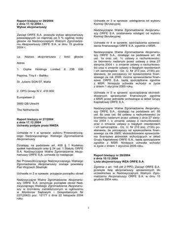 Uchwała nr 3 w sprawie: odstąpienia od wyboru Komisji Skrutacyjnej Raport bieżący nr 28/2004 z dnia 17.12.2004 r. Wykaz akcjonariuszy Nadzwyczajne Walne Zgromadzenie Akcjonariuszy ORFE S.A. postanawia odstąpić od wyboru Komisji Skrutacyjnej Zarząd ORFE S.A. przesyła wykaz akcjonariuszy posiadających co najmniej po 5 % ogólnej liczby głosów na Nadzwyczajnym Walnym Zgromadzeniu Akcjonariuszy ORFE S.A. w dniu 15 grudnia 2004 r. Lp. Nazwa akcjonariusza / Ilość Uchwała nr 4 w sprawie: sporządzania sprawozdania finansowego ORFE S.A. zgodnie z MSR. Nadzwyczajne Walne Zgromadzenie Akcjonariuszy ORFE S.A., działając na podstawie art. 45 ust. 1a oraz ust. 1c ustawy o rachunkowości, (w brzmieniu nadanym przez ustawę z dnia 27 sierpnia 2004 r. o zmianie ustawy o rachunkowości oraz o zmianie ustawy o biegłych rewidentach i ich samorządzie - Dz. U. Nr 213 poz. 2155) postanawia, że począwszy od sprawozdania finansowego za rok 2005, roczne sprawozdania finansowe ORFE S.A. będą sporządzane zgodnie z MSR. Niniejsza uchwała wchodzi w życie z dniem 1 stycznia 2005 roku. głosów Adres 1. Orphe Holdings Limited 6 238 000 Peprina, Triq il – Baltiku St. Julians SGN 07, Malta 2. OPG Groep N.V. 410 000 Uchwała nr 5 w sprawie: sporządzania skonsolidowanych sprawozdań finansowych zgodnie z MSR przez jednostki wchodzące w skład Grupy Kapitałowej ORFE S.A. Europalaan 2 3500 GB Utrecht Nadzwyczajne Walne Zgromadzenie Akcjonariuszy ORFE S.A., działając na podstawie art. 55 ust. 6c oraz ust. 6d ustawy o rachunkowości (w brzmieniu nadanym przez ustawę z dnia 27 sierpnia 2004 r. o zmianie ustawy o rachunkowości oraz o zmianie ustawy o biegłych rewidentach i ich samorządzie - Dz. U. Nr 213 poz. 2155) postanawia, że począwszy od sprawozdania finansowego za rok 2005, skonsolidowane sprawozdania finansowe jednostek wchodzących w skład Grupy Kapitałowej ORFE S.A., będą sporządzane zgodnie z MSR. Niniejsza uchwała wchodzi w życie z dniem 1 stycznia 2005 roku. The Netherlands Raport bieżący nr 27/2004 z dnia 17.12.2004 Uchwały podjęte przez NWZA Uchwała nr 1 w sprawie: wyboru Przewodniczącego Nadzwyczajnego Walnego Zgromadzenia Akcjonariuszy Działając na podstawie art. 409 § 1 Kodeksu spółek handlowych oraz § 24 ust. 1 Statutu ORFE S.A. Nadzwyczajne Walne Zgromadzenie Akcjonariuszy ORFE S.A. uchwala co następuje: Raport bieżący nr 26/2004 z dnia 10.12.2004 Lista akcjonariuszy WZA ORFE S.A. Na Przewodniczącego Nadzwyczajnego Walnego Zgromadzenia Akcjonariuszy zostaje powołany Pan Wojciech Śliwiński Zgodnie z art. 148 pkt 2 PPO, Zarząd ORFE S.A. przesyła listę akcjonariuszy uprawnionych do uczestnictwa w Nadzwyczajnym Walnym Zgromadzeniu Akcjonariuszy ORFE S.A. w dniu 15 grudnia 2004 roku. Uchwała nr 2 w sprawie: przyjęcia porządku obrad Nadzwyczajne Walne Zgromadzenie Akcjonariuszy ORFE S.A. przyjmuje porządek obrad Nadzwyczajnego Walnego Zgromadzenia Akcjonariuszy w brzmieniu zamieszczonym w ogłoszeniu w Monitorze Sądowym i Gospodarczym Nr 227(2063) poz. 12177 z dnia 22 listopada 2004 roku. 1 Lista akcjonariuszy uprawnionych do uczestnictwa w Nadzwyczajnym Walnym Zgromadzeniu ORFE S.A. w dniu 15 grudnia 2004 Lp. 1. 2. Imię i nazwisko/ Nazwa akcjonariusza Orphe Holdings Limited OPG Groep N.V. Razem Miejsce zamieszkania / Siedziba Peprina, Triq il-Baltiku St. Julians SGN 07 Malta Europalaan 2 3500 GB Utrecht The Netherlands Ilość akcji Rodzaj akcji 108 000 akcje serii A imienne uprzywilejowane co do głosu Ilość głosów Uwagi 540 000 wpisane do księgi akcyjnej 5 698 000 akcje zwykłe na okaziciela (PLORFE000020) 410 000 akcje zwykłe na okaziciela (PLORFE000020) 5 698 000 świadectwo depozytowe BRE Bank S.A. nr 986/346414/74 410 000 świadectwo depozytowe ING Bank Śląski S.A. nr 00000189/04 6 216 000 (78,11%) 6 648 000 (79,23 %) 2 Nadzwyczajne Walne Zgromadzenie Akcjonariuszy ORFE S.A., działając na podstawie art. 55 ust. 6c oraz ust. 6d ustawy o rachunkowości (w brzmieniu nadanym przez ustawę z dnia 27 sierpnia 2004 r. o zmianie ustawy o rachunkowości oraz o zmianie ustawy o biegłych rewidentach i ich samorządzie - Dz. U. Nr 213 poz. 2155) postanawia, że począwszy od sprawozdania finansowego za rok 2005, skonsolidowane sprawozdania finansowe jednostek wchodzących w skład Grupy Kapitałowej ORFE S.A., będą sporządzane zgodnie z MSR. Niniejsza uchwała wchodzi w życie z dniem 1 stycznia 2005 roku. Raport bieżący nr 25/2004 z dnia 06.12.2005 PROJEKTY UCHWAŁ, KTÓRE MAJA BYĆ PRZEDMIOTEM OBRAD NADZWYCZAJNEGO WALNEGO ZGROMADZENIA AKCJONARIUSZY ORFE S.A. w dniu 15 grudnia 2004 roku Uchwała nr __ w sprawie: wyboru Przewodniczącego Nadzwyczajnego Walnego Zgromadzenia Akcjonariuszy Działając na podstawie art. 409 § 1 Kodeksu spółek handlowych oraz § 24 ust. 1 Statutu ORFE S.A. Nadzwyczajne Walne Zgromadzenie Akcjonariuszy ORFE S.A. uchwala co następuje: Na Przewodniczącego Nadzwyczajnego Walnego Zgromadzenia Akcjonariuszy zostaje powołany .......................................... Raport bieżący nr 24/2004 z dnia 06.12.2004 r. Przystąpienie do ESPI Uchwała nr __ w sprawie: przyjęcia porządku obrad Zgodnie z §10 ust. 1 Regulaminu korzystania z Elektronicznego Systemu Przekazywania Informacji (ESPI) z dnia 22 października 2004, Zarząd ORFE S.A. informuje, że Spółka przystąpiła do Elektronicznego Systemu Przekazywania Informacji (ESPI) od 1 grudnia 2004 i będzie przekazywać informacje wynikające z obowiązków informacyjnych przy pomocy tego Systemu. Operatorem systemu ESPI został Pan Kazimierz Białek. Nadzwyczajne Walne Zgromadzenie Akcjonariuszy ORFE S.A. przyjmuje porządek obrad Nadzwyczajnego Walnego Zgromadzenia Akcjonariuszy w brzmieniu zamieszczonym w ogłoszeniu w Monitorze Sądowym i Gospodarczym Nr 227(2063) poz. 12177 z dnia 22 listopada 2004 roku. Uchwała nr __ w sprawie: wyboru Komisji Skrutacyjnej Raport bieżący nr 23/2004 z dnia 09.11.2004 r. Porządek obrad NWZA Nadzwyczajne Walne Zg
