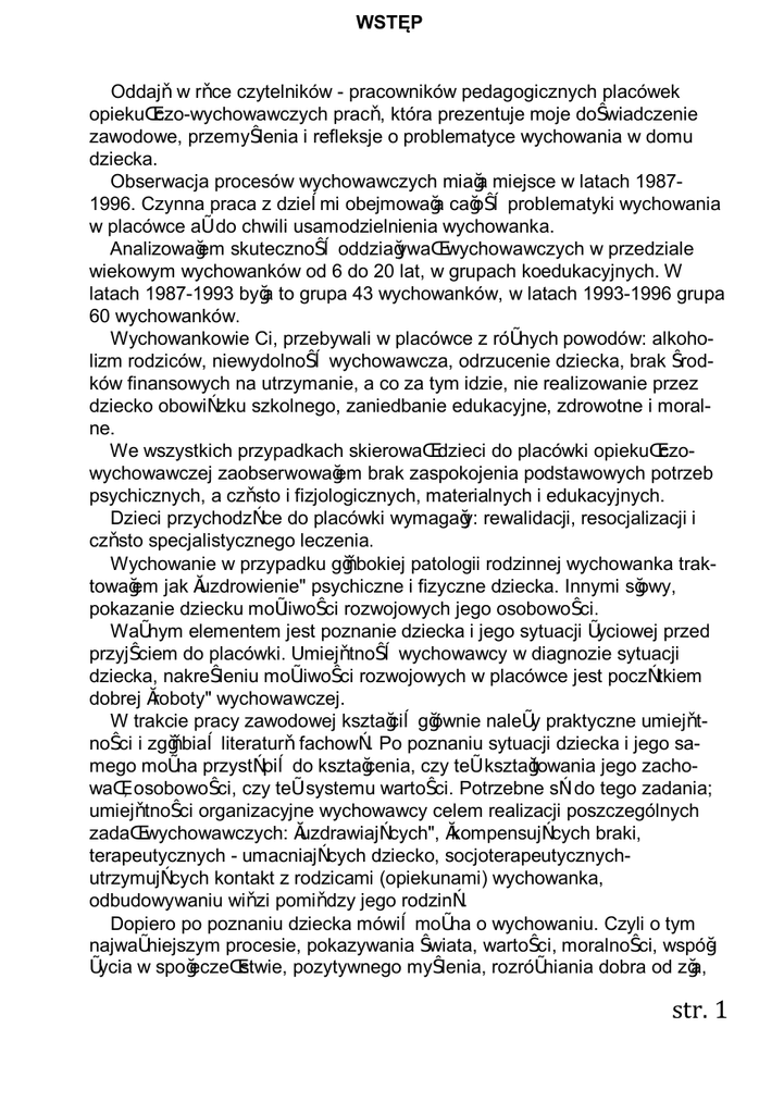 WSTĘP Oddaję w ręce czytelników - pracowników pedagogicznych placówek opiekuńczo-wychowawczych pracę, która prezentuje moje doświadczenie zawodowe, przemyślenia i refleksje o problematyce wychowania w domu dziecka. Obserwacja procesów wychowawczych miała miejsce w latach 19871996. Czynna praca z dziećmi obejmowała całość problematyki wychowania w placówce aż do chwili usamodzielnienia wychowanka. Analizowałem skuteczność oddziaływań wychowawczych w przedziale wiekowym wychowanków od 6 do 20 lat, w grupach koedukacyjnych. W latach 1987-1993 była to grupa 43 wychowanków, w latach 1993-1996 grupa 60 wychowanków. Wychowankowie Ci, przebywali w placówce z różnych powodów: alkoholizm rodziców, niewydolność wychowawcza, odrzucenie dziecka, brak środków finansowych na utrzymanie, a co za tym idzie, nie realizowanie przez dziecko obowiązku szkolnego, zaniedbanie edukacyjne, zdrowotne i moralne. We wszystkich przypadkach skierowań dzieci do placówki opiekuńczowychowawczej zaobserwowałem brak zaspokojenia podstawowych potrzeb psychicznych, a często i fizjologicznych, materialnych i edukacyjnych. Dzieci przychodzące do placówki wymagały: rewalidacji, resocjalizacji i często specjalistycznego leczenia. Wychowanie w przypadku głębokiej patologii rodzinnej wychowanka traktowałem jak „uzdrowienie" psychiczne i fizyczne dziecka. Innymi słowy, pokazanie dziecku możliwości rozwojowych jego osobowości. Ważnym elementem jest poznanie dziecka i jego sytuacji życiowej przed przyjściem do placówki. Umiejętność wychowawcy w diagnozie sytuacji dziecka, nakreśleniu możliwości rozwojowych w placówce jest początkiem dobrej „roboty" wychowawczej. W trakcie pracy zawodowej kształcić głównie należy praktyczne umiejętności i zgłębiać literaturę fachową. Po poznaniu sytuacji dziecka i jego samego można przystąpić do kształcenia, czy też kształtowania jego zachowań, osobowości, czy też systemu wartości. Potrzebne są do tego zadania; umiejętności organizacyjne wychowawcy celem realizacji poszczególnych zadań wychowawczych: „uzdrawiających", „kompensujących braki, terapeutycznych - umacniających dziecko, socjoterapeutycznychutrzymujących kontakt z rodzicami (opiekunami) wychowanka, odbudowywaniu więzi pomiędzy jego rodziną. Dopiero po poznaniu dziecka mówić można o wychowaniu. Czyli o tym najważniejszym procesie, pokazywania świata, wartości, moralności, współżycia w społeczeństwie, pozytywnego myślenia, rozróżniania dobra od zła, str. 1 rozwoju umysłowego, sensu życia. Jak to wszystko zrobić organizacyjnie? Postaram się o namiastkę przedstawienia dobrej organizacji pracy wychowawczej. Własne rozważania i wnioski z pracy zawodowej kieruję do wychowawców rozpoczynających swoją pracę z dziećmi, jak i studentów kierunków: pedagogika opiekuńczo-wychowawczą i resocjalizacja. Mam nadzieję, że po przeczytaniu czytelnik będzie mógł wyciągnąć dla siebie odpowiednie wnioski do pracy, dokonać przemyśleń dotyczących posiadanej wiedzy teoretycznej oraz praktycznych umiejętności przekazywania wychowankowi zasad i reguł wychowania. Należy przy tym pamiętać, że nie należy na siłę zmieniać dziecka, gdyż może to przynieść nieodwracalne skutki w psychice. Powinno to być tłumaczenie, wartościowanie, porównywanie, pokazywanie skutków i przyczyn, hipotetyczne obrazowanie przyszłości itp. Forma zinstytucjonalizowana, w której działają placówki też powinna być rozsądnie i głęboko przemyślana a następnie realizowana. Wychowanie w warunkach „sztucznych" (ściśle według nakazów i reguł) może przynieść nienaturalne zachowania w przyszłości wychowanków; bezradność w życiu samodzielnym, załamania nerwowe i powroty do grup patologicznych społecznie. Dlatego też uważam, że opieka nad dziećmi w domach dziecka i ich wychowanie jest wielką odpowiedzialnością, trudem wychowawczym, oddaniem własnych umiejętności i wartości młodym dorastającym ludziom. 1. POTRZEBY PSYCHICZNE DZIECKA 1.1. Ogólna charakterystyka potrzeb dziecka Dziecko - jak każdy człowiek - jest indywidualnością. Odrębność indywidualna zaznacza się już bardzo wcześnie. Domaga się ono stworzenia określonych warunków niezbędnych dla pełnego i pomyślnego rozwoju przyszłej osobowości. Warunki te muszą opierać się na istotnych potrzebach dziecka. Potrzebach zrozumiałych, przeanalizowanych i potraktowanych z całym poczuciem odpowiedzialności za życie psychiczne powierzonej jednostki. K. Obuchowski określa potrzeby, jako: „...właściwości organizmu, które sprawiają, że bez pewnych określonych warunków nie może on normalnie funkcjonować, tj. utrzymywać się w stanie wewnętrznej równowagi". Najprostsza klasyfikacja dzieli potrzeby na podstawowe i wyższe. Potrzeby podstawowe są potrzebami organicznymi i od ich zaspokojenia zależy utrzymanie wewnętrznej równowagi organizmu. Warunkiem wykształcenia się potrzeby wyższej jest zaspokojenie potrzeby podstawowej. Potrzeby podstawowe są potrzebami wrodzonymi. Przez zaspokojenie potrzeb wrodzonych powstają potrzeby nabyte. Są to potrzeby psychiczne, które podlegają zróżnicowaniu w zależności od wieku i układu sytuacji życiowych str. 2 człowieka. Zaspokojenie potrzeb dziecka ma zasadnicze znaczenie dla jego pełnego, harmonijnego rozwoju. Brak zaspokojenia potrzeb, zwłaszcza podstawowych, wpływa ujemnie na rozwój psychofizyczny, powoduje opóźnienia rozwojowe i zaburzenia w przystosowaniu. W tytule rozdziału do terminu „potrzeby" został dodany przymiotnik „psychiczne". Oznacza to, że ograniczam temat do zagadnienia potrzeb fizjologicznych. Zdaję sobie sprawę ze ścisłego powiązania sfery fizycznej i psychicznej dziecka. Niekiedy bardzo trudno jest oddzielić zasięg wymagań organizmu natury fizycznej od psychicznej. Jednym z podstawowych zadań opiekunów jest zaspokojenie pot