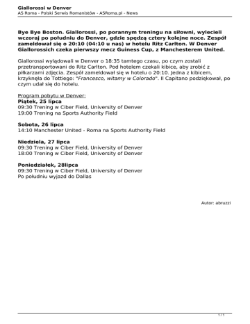 Giallorossi w Denver AS Roma - Polski Serwis Romanistów - ASRoma.pl - News Bye Bye Boston. Giallorossi, po porannym treningu na siłowni, wylecieli wczoraj po południu do Denver, gdzie spędzą cztery kolejne noce. Zespół zameldował się o 20:10 (04:10 u nas) w hotelu Ritz Carlton. W Denver Giallorossich czeka pierwszy mecz Guiness Cup, z Manchesterem United. Giallorossi wylądowali w Denver o 18:35 tamtego czasu, po czym zostali przetransportowani do Ritz Carlton. Pod hotelem czekali kibice, aby zrobić z piłkarzami zdjęcia. Zespół zameldował się w hotelu o 20:10. Jedna z kibicem, krzyknęła do Tottiego: "Francesco, witamy w Colorado". Il Capitano podziękował, po czym udał się do hotelu. Program pobytu w Denver: Piątek, 25 lipca 09:30 Trening w Ciber Field, University of Denver 19:00 Trening na Sports Authority Field Sobota, 26 lipca 14:10 Manchester United - Roma na Sports Authority Field Niedziela, 27 lipca 09:30 Trening w Ciber Field, University of Denver 18:00 Trening w Ciber Field, University of Denver Poniedziałek, 28lipca 09:30 Trening w Ciber Field, University of Denver Po południu wyjazd do Dallas Autor: abruzzi 1/1 Powered by TCPDF (www.tcpdf.org)