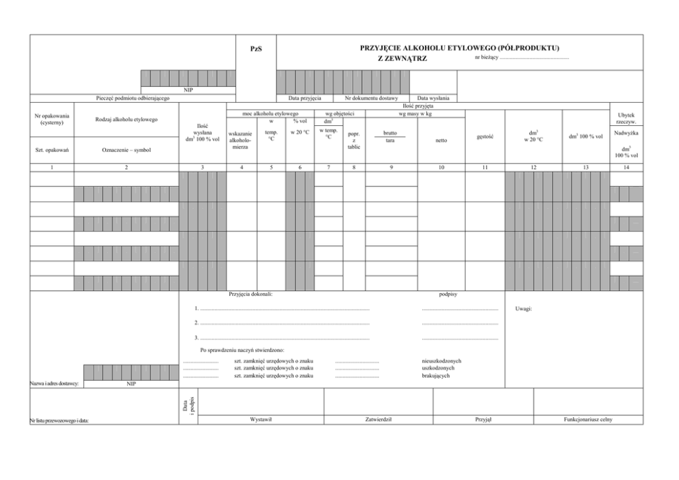 PRZYJĘCIE ALKOHOLU ETYLOWEGO (PÓŁPRODUKTU) nr bieżący ................................................. Z ZEWNĄTRZ PzS NIP Pieczęć podmiotu odbierającego Nr opakowania (cysterny) Data przyjęcia moc alkoholu etylowego w % vol Rodzaj alkoholu etylowego Ilość wysłana dm3 100 % vol Szt. opakowań Oznaczenie – symbol 1 2 3 wskazanie alkoholomierza temp. °C 4 5 w 20 °C 6 Nr dokumentu dostawy wg objętości dm3 w temp. °C 7 popr. z tablic brutto tara 8 9 Data wysłania Ilość przyjęta wg masy w kg netto Ubytek rzeczyw. gęstość dm3 w 20 °C dm3 100 % vol dm3 100 % vol Przyjęcia dokonali: 10 11 12 13 podpisy 1. ........................................................................................................................ ...................................................... 2. ........................................................................................................................ ...................................................... 3. ........................................................................................................................ ...................................................... Uwagi: Po sprawdzeniu naczyń stwierdzono: ......................... ......................... ......................... ............................... ............................... ............................... nieuszkodzonych uszkodzonych brakujących NIP Data i podpis Nazwa i adres dostawcy: szt. zamknięć urzędowych o znaku szt. zamknięć urzędowych o znaku szt. zamknięć urzędowych o znaku Nr listu przewozowego i data: Wystawił Nadwyżka Zatwierdził Przyjął Funkcjonariusz celny 14 SPRAWDZENIE PRZYJĘTEGO ALKOHOLU ETYLOWEGO Ilość alkoholu etylowego w naczyniach służących do transportu ilość alkoholu etylowego ustalona przy przyjęciu % vol w 20 °C (tablice alkoholometryczne) wg masy w kg w temperaturze °C wskazanie alkoholomierza Lp. numery naczyń (beczki, komory cysterny) moc alkoholu etylowego brutto tara netto wg objętości 3 dm w temp. °C poprawka dm3/100 dm3 (tabl. alk.) ilość alkoholu etylowego dm3 100 % vol dm3 w 20 °C Uwagi: W przypadku przyjęcia alkoholu etylowego skażonego w kolumnie „moc alkoholu etylowego” pozorną (wskazanie alkoholomierza) w alkoholu skażonym w temperaturze pomiaru wyrażonej w °C. należy podać moc