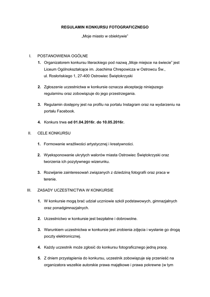 REGULAMIN KONKURSU FOTOGRAFICZNEGO „Moje miasto w obiektywie” I. POSTANOWIENIA OGÓLNE 1. Organizatorem konkursu literackiego pod nazwą „Moje miejsce na świecie” jest Liceum Ogólnokształcące im. Joachima Chrepowicza w Ostrowcu Św., ul. Rosłońskiego 1, 27-400 Ostrowiec Świętokrzyski 2. Zgłoszenie uczestnictwa w konkursie oznacza akceptację niniejszego regulaminu oraz zobowiązuje do jego przestrzegania. 3. Regulamin dostępny jest na profilu na portalu Instagram oraz na wydarzeniu na portalu Facebook. 4. Konkurs trwa od 01.04.2016r. do 10.05.2016r. II. CELE KONKURSU 1. Formowanie wrażliwości artystycznej i kreatywności. 2. Wyeksponowanie ukrytych walorów miasta Ostrowiec Świętokrzyski oraz tworzenia ich pozytywnego wizerunku. 3. Rozwijanie zainteresowań związanych z dziedziną fotografii oraz praca w terenie. III. ZASADY UCZESTNICTWA W KONKURSIE 1. W konkursie mogą brać udział uczniowie szkół podstawowych, gimnazjalnych oraz ponadgimnazjalnych. 2. Uczestnictwo w konkursie jest bezpłatne i dobrowolne. 3. Warunkiem uczestnictwa w konkursie jest zrobienia zdjęcia i wysłanie go drogą poczty elektronicznej. 4. Każdy uczestnik może zgłosić do konkursu fotograficznego jedną pracę. 5. Z dniem przystąpienia do konkursu, uczestnik zobowiązuje się przenieść na organizatora wszelkie autorskie prawa majątkowe i prawa pokrewne (w tym wyłączne prawa do zezwalania na wykonywanie zależnych praw autorskich oraz przenoszenia praw nabytych na inne osoby), do pracy konkursowej dostarczonej organizatorowi wraz z prawem do dokonywania w niej zmian oraz do nieograniczonego w czasie korzystania i rozporządzania w kraju i za granicą, na polach eksploatacji określonych w art. 50 Ustawy z dnia 4 lutego 1994 r. o prawie autorskim i prawach pokrewnych ( Dz. U. z 2000r. Nr 80, poz. 904 zwanej dalej jako Ust. o Pr. Aut.) w szczególności na polu eksploatacji związanym z działalnością promocyjną, marketingową i reklamową, w tym prawo do: wyłącznego używania i wykorzystania prac we wszelkiej działalności promocyjnej reklamowej, informacyjnej i usługowej, utrwalania i zwielokrotniania prac wszelkimi technikami, zwielokrotniania poprzez dokonywanie zapisu utworów na nośnikach elektronicznych, publicznego wystawiania i wyświetlania na wszelkich imprezach otwartych i zamkniętych, wprowadzania do obrotu, wydawania i rozpowszechniania materiałów reklamowych. wprowadzania do pamięci komputera j umieszczania w sieci Internet. publicznego wystawiania. 6. Osoby składające zgłoszenia w ramach konkursu tym samym wyrażają zgodę na przetwarzanie przez organizatora swoich danych osobowych wyłącznie na potrzeby konkursu w zakresie koniecznym do prawidłowego przeprowadzenia konkursu (ustawa o ochronie danych osobowych z dn. 29 sierpnia 1997 roku Dz.U. Nr 133, poz. 833 z późn. zm.). 7. Organizator zastrzega sobie prawo do opublikowania imion, nazwisk, zdjęć i informacji o uczestnikach, a w szczególności o zwycięzcach konkursu. 8. Organizator konkursu zapewnia poufność danych osobowych uczestników (z zastrzeżeniem postanowień §3 pkt.7). 9. Zgłoszenie pracy do konkursu jest jednoznaczne z przyjęciem warunków niniejszego regulaminu i oświadczeniem, że prace zgłoszone na konkurs zostały wykonane osobiście. 10. Przekazanie prac konkursowych oznacza jednocześnie, że przekazujący oświadcza, iż nie naruszają one praw osób trzecich, w szczególności nie naruszają ich autorskich praw majątkowych i osobistych. W przypadku wystąpienia przez osobę trzecią z roszczeniami wynikającymi z tytułu naruszenia praw określonych powyżej, osoba przekazująca zrekompensuje Organizatorowi, jako wyłącznie odpowiedzialna, koszty poniesione w związku ze skierowaniem przeciwko niemu roszczeń odszkodowawczych, zwalniając Organizatora od wszelkich zobowiązań, jakie powstaną z tego tytułu. 11. Uczestnicy konkursu wyrażają zgodę na wykorzystywanie przez Organizatora autorskich praw osobistych do pracy konkursowej na potrzeby konkursu. 12. Przekazanie prac konkursowych przez uczestników jest nieodpłatne. IV. FORMA PREZENTACJI PRACY KONKURSOWEJ 1. Praca powinna być wysłana w formacie .jpg lub .png drogą poczty elektronicznej ([email protected]). 2. Prace konkursowe nie mogą być kopiowane. 3. W konkursie mogą wziąć udział jedynie prace, które nie były nigdzie publikowane, nie brały udziału w innych konkursach, wykonane były na terenie Ostrowca Świętokrzyskiego, są oryginalnymi pracami autora. 4. Uczestników obowiązuje całkowity zakaz korzystania z programów graficznych (photoshop, gimp itp.). 5. Przesłana praca musi zawierać w treści emaila wskazane poniżej elementy: imię i nazwisko autora pracy, klasa, nazwa i adres szkoły, do której uczęszcza autor, telefon kontaktowy autora. 6. W temacie emaila należy wpisać „Konkurs fotograficzny – Moje miasto w obiektywie”. V. KOMISJA KONKURSU 1. Organizator konkursu powołuje komisję konkursu, która sprawuje nadzór organizacyjny i merytoryczny nad jego przebiegiem. Komisja konkursu opracowuje regulamin konkursu i określa jego przebieg. 2. Siedzibą komisji konkursu jest Liceum Ogólnokształcące im. J. Chreptowicza. 3. Komisja konkursu ustala kryteria oceny i tryb oceniania. 4. Komisja konkursu czuwa nad poprawnością przebiegu konkursu. VI. PRZEBIEG KONKURSU 1. Konkurs polega na zrobieniu zdjęcia na temat „Moje miasto w obiektywie” (dowolna interpretacja tematu). 2. Uczestnik konkursu musi pracować samodzielnie. 3. Prace nadsyłane są w formie załącznika do emaila ([email protected]) od 01.04.2016 r. do 10.05.2016 r. 4. Prace będą oceniane przez komisję konkursu. 5. Zostaną wybrane trzy najlepsze prace, których autorzy otrzymają nagrody rzeczowe oraz przyznane zostaną dwa wyróżnienia. 6. Wyniki końcowe zostaną ogłoszone podczas Pikniku Rodzinnego „Dla każdego coś dobrego” odbywającego się na terenie Liceum Ogólnokształcącego im