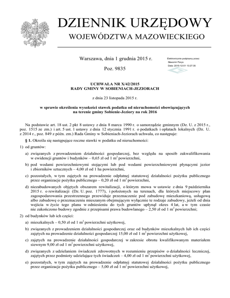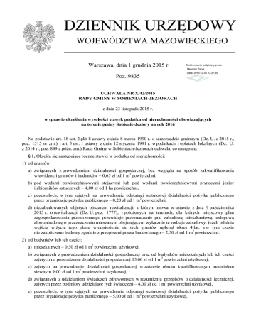 DZIENNIK URZĘDOWY WOJEWÓDZTWA MAZOWIECKIEGO Warszawa, dnia 1 grudnia 2015 r. Elektronicznie podpisany przez: Sławomir Parys Poz. 9835 Data: 2015-12-01 13:27:35 UCHWAŁA NR X/42/2015 RADY GMINY W SOBIENIACH-JEZIORACH z dnia 23 listopada 2015 r. w sprawie określenia wysokości stawek podatku od nieruchomości obowiązujących na terenie gminy Sobienie-Jeziory na rok 2016 Na podstawie art. 18 ust. 2 pkt 8 ustawy z dnia 8 marca 1990 r. o samorządzie gminnym (Dz. U. z 2015 r., poz. 1515 ze zm.) i art. 5 ust. 1 ustawy z dnia 12 stycznia 1991 r. o podatkach i opłatach lokalnych (Dz. U. z 2014 r., poz. 849 z późn. zm.) Rada Gminy w Sobieniach-Jeziorach uchwala, co następuje: § 1. Określa się następujące roczne stawki w podatku od nieruchomości: 1) od gruntów: a) związanych z prowadzeniem działalności gospodarczej, bez względu na sposób zakwalifikowania w ewidencji gruntów i budynków – 0,65 zł od 1 m2 powierzchni, b) pod wodami powierzchniowymi stojącymi lub pod wodami powierzchniowymi płynącymi jezior i zbiorników sztucznych – 4,00 zł od 1 ha powierzchni, c) pozostałych, w tym zajętych na prowadzenie odpłatnej statutowej działalności pożytku publicznego przez organizacje pożytku publicznego – 0,20 zł od 1 m2 powierzchni, d) niezabudowanych objętych obszarem rewitalizacji, o którym mowa w ustawie z dnia 9 października 2015 r. o rewitalizacji (Dz. U. poz. 1777), i położonych na terenach, dla których miejscowy plan zagospodarowania przestrzennego przewiduje przeznaczenie pod zabudowę mieszkaniową, usługową albo zabudowę o przeznaczeniu mieszanym obejmującym wyłącznie te rodzaje zabudowy, jeżeli od dnia wejścia w życie tego planu w odniesieniu do tych gruntów upłynął okres 4 lat, a w tym czasie nie zakończono budowy zgodnie z przepisami prawa budowlanego – 2,50 zł od 1 m2 powierzchni; 2) od budynków lub ich części: a) mieszkalnych – 0,50 zł od 1 m2 powierzchni użytkowej, b) związanych z prowadzeniem działalności gospodarczej oraz od budynków mieszkalnych lub ich części zajętych na prowadzenie działalności gospodarczej 15,00 zł od 1 m2 powierzchni użytkowej, c) zajętych na prowadzenie działalności gospodarczej w zakresie obrotu kwalifikowanym materiałem siewnym 9,00 zł od 1 m2 powierzchni użytkowej, d) związanych z udzielaniem świadczeń zdrowotnych w rozumieniu przepisów o działalności leczniczej, zajętych przez podmioty udzielające tych świadczeń – 4,00 zł od 1 m2 powierzchni użytkowej, e) pozostałych, w tym zajętych na prowadzenie odpłatnej statutowej działalności pożytku publicznego przez organizacje pożytku publicznego – 5,00 zł od 1 m2 powierzchni użytkowej, Dziennik Urzędowy Województwa Mazowieckiego –2– Poz. 9835 3) od budowli – 2 % ich wartości. § 2. Wykonanie uchwały powierza się Wójtowi Gminy Sobienie-Jeziory. § 3. Uchwała wchodzi w życie po upływie 14 dni od dnia ogłoszenia w Dzienniku Urzędowym Województwa Mazowieckiego i ma zastosowanie od 1 stycznia 2016 r. Przewodniczący Rady Gminy: Jerzy Janasz