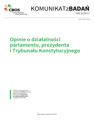 KOMUNIKATzBADAŃ NR 6/2017 ISSN 2353-5822 Opinie o działalności parlamentu, prezydenta i Trybunału Konstytucyjnego Przedruk i rozpowszechnianie tej publikacji w całości dozwolone wyłącznie za zgodą CBOS. Wykorzystanie fragmentów oraz danych empirycznych wymaga podania źródła Warszawa, styczeń 2017 Znak jakości przyznany CBOS przez Organizację Firm Badania Opinii i Rynku 14 stycznia 2016 roku Fundacja Centrum Badania Opinii Społecznej ul. Świętojerska 5/7, 00-236 Warszawa e-mail: [email protected]; [email protected] http://www.cbos.pl (48 22) 629 35 69 Raz w miesiącu pytamy Polaków o opinie na temat działalności parlamentu i prezydenta, a od pewnego czasu również o funkcjonowanie Trybunału Konstytucyjnego. W styczniu1 pogorszyły się oceny pracy Sejmu oraz TK, natomiast notowania izby wyższej oraz głowy państwa pozostają względnie stabilne. OCENY DZIAŁALNOŚCI PARLAMENTU Kryzys parlamentarny przełożył się na pogorszenie i tak już przeważnie złych opinii Polaków o pracy posłów. Odsetek osób wypowiadających się o niej negatywnie zwiększył się od grudnia minionego roku o 9 punktów procentowych (do 67%), jednocześnie odsetek zadowolonych z działalności izby niższej zmniejszył się o 6 punktów (do 21%). Są to najsłabsze notowania Sejmu VIII kadencji. Ostatnie wydarzenia w parlamencie nie wpłynęły natomiast zauważalnie na wizerunek izby wyższej. Pracę senatorów dobrze ocenia ponad jedna czwarta ankietowanych (28%), a krytykuje – połowa (51%). Tabela 1 Oceniane instytucje Sejm Senat 1 Oceny dobra zła Trudno powiedzieć dobra zła Trudno powiedzieć I II 29 54 27 56 Wskazania respondentów według terminów badań 2016 2017 Zmiany XII ’16 – III IV V VI VII VIII IX X XI XII I I ’17 w procentach 27 30 24 25 31 26 27 27 28 27 21 –6 57 54 59 59 53 57 57 60 58 58 67 +9 17 29 46 17 26 49 16 28 47 16 29 46 17 26 48 16 25 49 16 31 44 17 27 46 16 26 46 13 27 48 14 27 49 15 26 50 12 28 51 –3 +2 +1 25 25 25 25 26 26 25 27 28 25 24 24 21 –3 Badanie „Aktualne problemy i wydarzenia” (320) przeprowadzono metodą wywiadów bezpośrednich (face-to-face) wspomaganych komputerowo (CAPI) w dniach 7–15 stycznia 2017 roku na liczącej 1045 osób reprezentatywnej próbie losowej dorosłych mieszkańców Polski. -2- ZMIANY OPINII O SEJMIE ZMIANY OPINII O SENACIE 100% 100% 90% 90% 80% 80% 70% 70% 60% 60% 50% 50% 40% 40% 30% 30% 20% 20% 10% 10% 0% 0% II VI XII V I VI I VI I VI I VI I VI I VI I VI I VI I VI I VI I VI I VI I VI I VI I VI I VI I VI I '98 '99 '00 '01 '02 '03 '04 '05 '06 '07 '08 '09 '10 '11 '12 '13 '14 '15 '16 '17 II VI XII V I VI I VI I VI I VI I VI I VI I VI I VI I VI I VI I VI I VI I VI I VI I VI I VI I VI I '98 '99 '00 '01 '02 '03 '04 '05 '06 '07 '08 '09 '10 '11 '12 '13 '14 '15 '16 '17 DOBRA ZŁA DOBRA ZŁA To, jak odbierana jest praca posłów, w największym stopniu zależy od poglądów politycznych i preferencji partyjnych badanych oraz ich religijności. Pozytywnymi opiniami wyróżniają się na tle innych respondenci identyfikujący się z prawicą, popierający Prawo i Sprawiedliwość, a także uczestniczący w praktykach religijnych przynajmniej raz w tygodniu, natomiast bardzo wysoki poziom niezadowolenia z działalności izby niższej obserwujemy wśród osób mających lewicowe lub centrowe poglądy polityczne, potencjalnych wyborców Platformy Obywatelskiej i Nowoczesnej Ryszarda Petru oraz respondentów niepraktykujących religijnie. Można również dodać, że nieco lepiej niż inni oceniają Sejm badani najsłabiej wykształceni, z gospodarstw domowych o najniższych dochodach per capita, a gorzej – respondenci mający wyższe wykształcenie, mieszkańcy dużych miast (liczących 100 tys. i więcej ludności), osoby deklarujące najwyższe dochody oraz niezadowolone z własnej sytuacji materialnej. Tabela 2 Elektoraty partyjne określone na podstawie deklaracji głosowania w ewentualnych wyborach parlamentarnych dobra PiS Kukiz’15 PO Nowoczesna 48 18 8 2 Niezdecydowani, czy wziąć udział w wyborach Niezamierzający głosować 20 12 Oceny działalności Sejmu zła Trudno powiedzieć w procentach 42 10 76 6 87 5 96 3 62 67 19 21 -3OCENY DZIAŁALNOŚCI PREZYDENTA Od czerwca ubiegłego roku notowania głowy państwa utrzymują się na stabilnym poziomie. Styczniowy pomiar w zasadzie nic nie zmienił w tej kwestii. Zadowoleni z prezydentury Andrzeja Dudy stanowią obecnie nieco ponad połowę Polaków (52%), natomiast niezadowoleni – blisko dwie piąte (39%). Tabela 3 Oceny działalności prezydenta I II Dobra Zła Trudno powiedzieć 47 38 15 47 38 15 Wskazania respondentów według terminów badań 2016 III IV V VI VII VIII IX X XI w procentach 51 49 50 55 56 54 53 56 53 37 37 39 36 32 34 37 34 36 12 14 11 9 12 12 10 10 11 2017 Zmiany XII ’16 – XII I I ’17 53 38 9 52 39 9 –1 +1 0 ZMIANY OPINII O PREZYDENCIE 100% Lech Kaczyński Aleksander Kwaśniewski 90% Bronisław Komorowski Andrzej Duda 80% 70% 60% 50% 40% 30% 20% 10% 0% II VI XII V IX I VI '98 '99 '00 I VI '01 I VI '02 I VI '03 I VI '04 I VI '05 I VI '06 I VI '07 I VI '08 DOBRA I VI '09 I IX I VI '10 '11 I VI '12 I VI '13 I VI '14 I VI '15 I VI '16 I '17 ZŁA Pozytywnie o obecnej prezydenturze relatywnie często wypowiadają się badani mający wykształcenie podstawowe, gimnazjalne lub zasadnicze zawodowe, mieszkańcy wsi, respondenci uzyskujący niskie dochody per capita (poniżej 1000 zł), uczestniczący w praktykach religijnych przynajmniej raz w tygodniu, deklarujący prawicową orientację polityczną oraz zamiar głosowania w hipotetycznych wyborach parlamentarnych na PiS lub ugrupowanie Pawła Kukiza. Z kolei głosy krytyki przeważają wśród mieszkańców dużych miast, respondentów najlepiej wykształconych, o najwyższych dochodach w przeliczeniu na osobę w rodzinie, badanych niebiorących udziału w praktykach religijnych lub uczestniczących w nich kilka razy w roku, identyfikujących się z lewicą lub politycznym centr