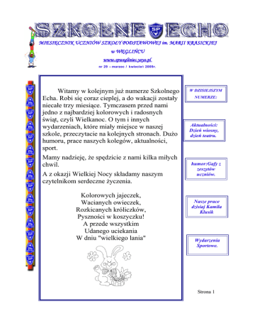 SZKOLNE ECHO MIESIĘCZNIK UCZNIÓW SZKOŁY PODSTAWOWEJ im. MARII KRASICKIEJ w WĘGLIŃCU www.spwegliniec.yoyo.pl nr 29 – marzec / kwiecień 2009r. Witamy w kolejnym już numerze Szkolnego Echa. Robi się coraz cieplej, a do wakacji zostały niecałe trzy miesiące. Tymczasem przed nami jedno z najbardziej kolorowych i radosnych świąt, czyli Wielkanoc. O tym i innych wydarzeniach, które miały miejsce w naszej szkole, przeczytacie na kolejnych stronach. Dużo humoru, prace naszych kolegów, aktualności, sport. Mamy nadzieję, że spędzicie z nami kilka miłych chwil. A z okazji Wielkiej Nocy składamy naszym czytelnikom serdeczne życzenia. Kolorowych jajeczek, Wacianych owieczek, Rozkicanych króliczków, Pyszności w koszyczku! A przede wszystkim Udanego uciekania W dniu "wielkiego lania" W DZISIEJSZYM NUMERZE: Aktualności: Dzień wiosny, dzień teatru. humor:Gafy z zeszytów uczniów. Nasze prace dzisiaj Kamila Klusik Wydarzenia Sportowe. Strona 1 Aktualności Wiosenne miesiące zwykle obfitują w różnorodne wydarzenia, tak było i w tym roku. Spośród wielu imprez wybraliśmy te, które uznaliśmy za najważniejsze. Kierowaliśmy się waszymi opiniami. Zapraszamy! 20.03.2009 W dniu dzisiejszym zamiast tradycyjnego dnia wagarowicza mieliśmy zorganizowane zajęcia w ramach projektu „Żyj bezpiecznie”. Przez kilka godzin uczestniczyliśmy w różnych zajęciach przygotowanych dla nas przez nauczycieli i zaproszonych gości. Na stanowisku kierowanym przez dr Ilonę Curyło-Dziubę i jej syna mogliśmy poćwiczyć udzielanie pierwszej pomocy. Niektórzy porywali się nawet na próby uczynienia z kolegów i koleżanek mumii. Zasady bezpiecznego poruszania się po drogach przypomniał nam gość z Komendy Policji w Pieńsku. Oceniał również naszą umiejętność zastosowania przepisów drogowych w praktyce. Pani Piękna-Świderek wprowadziła nas w świat zabaw rytmicznych. Świetnie zrelaksowaliśmy się w takt nastrojowej muzyki. Na koniec udaliśmy się do biblioteki szkolnej, gdzie czekali na nas p. Dariusz Salas i p. Tomasz Szymański. Obaj panowie w bardzo ciekawy sposób opowiedzieli nam o swoich sportowych pasjach : kolarstwie górskim i biegach długodystansowych. Był to dzień pełen wrażeń i na długo zostanie w naszej pamięci. Strona 2 27.03.2009 W dniu dzisiejszym 90 uczniów naszej szkoły pojechało do Lubania, aby obejrzeć spektakl teatralny pt: W świecie mitów. Sztukę przygotowali aktorzy Teatru Wrocławskiego. Z relacji uczniów wynikało, że przedstawienie było bardzo humorystyczne i wszystkim się podobało. W tym samym dniu, po raz kolejny członkowie naszego koła teatralnego brali udział w prezentacjach teatralnych w Czerwonej Wodzie. Pojechali tam z krótkim programem kabaretowym, który spodobał się publiczności. Pytani o wrażenia odpowiadali, że najbardziej podobał im się występ uczniów z Gimnazjum w Ruszowie. W ich wykonaniu obejrzeli inscenizację ,, Opowieści wigilijnej”. Wielkim bonusem było przepyszne ciasto, którym zostali poczęstowani młodzi artyści. 24.04.2009 W dniu dzisiejszym uczniowie klasy 6 odbyli krótką wycieczkę do budynku, w którym mieści się Urząd Miasta i Gminy. Na korytarzach urzędu rozstawiono zdjęcia i artykuły ilustrujące stan wojenny w województwie dolnośląskim. Wystawę przygotował pan A. Janicki, znany nam przede wszystkim jako były nauczyciel historii i organizator Muzeum Kresowego. 30.04.2009 Już za kilka dni będziemy obchodzić kolejną rocznicę uchwalenia Konstytucji 3 Maja. Z tej okazji klasa 5 b przygotowała przedstawienie przybliżające nam w sposób nieco humorystyczny okoliczności tego historycznego wydarzenia. Role niektórych kolegów wszystkich zaskoczyły. Dało się zauważyć, że w niektórych drzemią zadatki na artystów estradowych. Tak trzymać! Strona 3 Nasze prace Przedstawiamy pracę uczennicy klasy VI b Kamili Klusik. Praca jest bardzo na czasie, ponieważ już niedługo zbliżają się wakacje. Miłej lektury. Harcerka Kolejny słoneczny dzień. Trawa, jak zwykle zresztą, żółkła od panującego gorąca. Do samochodu przez otwarte okno wpadało schłodzone powietrze. Wszyscy byliśmy w stanie euforii. Kocher, trzy menażki, namiot- nowy, bo stary z brezentu się nie nadawał, wszystko mieliśmy w bagażniku. Jedziemy na kemping. Od tak dawna czekałam na ten dzień. Przez ostatnie tygodnie szkoły nie mogłam się skupić na lekcjach, myślami byłam gdzie indziej. Jedyna z moich towarzyszy miałam finkę, chłopaki byli uzbrojeni w saperki. Drużynowy przyśpieszył. Za godzinę mieliśmy być na miejscu… Domowy dynamit. Obudziłam się, powrót do przytomności był długi i bolesny. Obok mnie leżał sprawca całego zamieszania, mój brat. Nie chciałam robi mu scen, choć odegrał komedię. Zawsze myślałam, że jest dobrym chłopcem, dziś zrzucił maskę. Bawił się w domu dynamitem, a przy sprzątaniu jak zwykle ja będę grac pierwsze skrzypce. On jeszcze nigdy nie wszedł w moja rolę. Strona 4 Wiem, że Wam nastolatkom jest ciężko. Stres, obowiązki, nauka. Każdy z Was ma swoje sposoby, by odreagować np.: sport, gry komputerowe. Ale inni szukają pomocy w nawykach! Papierosy rzekomo odstresowują, alkohol pomaga zapomnieć o wszystkim, a narkotyki dają powera. To oczywiście nieprawda! Od papierosów można dostać raka płuc, alkohol niszczy mózg i wątrobę, a narkotyki, no niestety nie ma organu, który by się zachował nieuszkodzony. Rozmawiałam z Wami na ten temat i cóż, zdania są podzielone. Na przykład Ania uważa, że nawyki to totalna głupota! Ludzie niszczą sobie życie przez narkotyki lub alkohol! Sama widziałam, jak mojego sąsiada na noszach wynosili przez napój wyskokowy i był bliski śmierci! A taki chłopak, co pali papierosy, nazwijmy go Tadek. Taki przykładowy Tadek to chyba nigdy nie urośnie! Do śmierci będzie miał półtora metra! A umrze bardzo młodo na raka płuc! Poza tym od papierosów