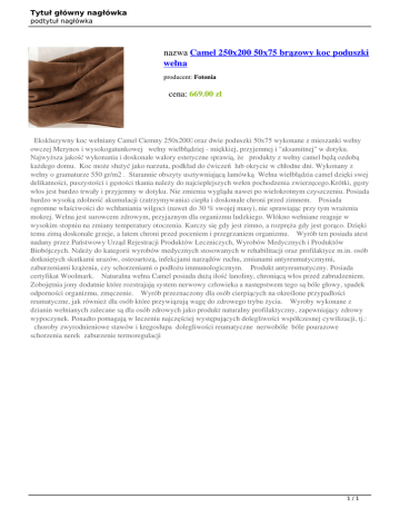 Tytuł główny nagłówka podtytuł nagłówka nazwa Camel 250x200 50x75 brązowy koc poduszki wełna producent: Fotonia cena: 669.00 zł Ekskluzywny koc wełniany Camel Ciemny 250x200 oraz dwie poduszki 50x75 wykonane z mieszanki wełny owczej Merynos i wysokogatunkowej wełny wielbłądziej - miękkiej, przyjemnej i "aksamitnej" w dotyku. Najwyższa jakość wykonania i doskonałe walory estetyczne sprawią, że produkty z wełny camel będą ozdobą każdego domu. Koc może służyć jako narzuta, podkład do ćwiczeń lub okrycie w chłodne dni. Wykonany z wełny o gramaturze 550 gr/m2 . Starannie obszyty usztywniającą lamówką Wełna wielbłądzia camel dzięki swej delikatności, puszystości i gęstości tkania należy do najcieplejszych wełen pochodzenia zwierzęcego.Krótki, gęsty włos jest bardzo trwały i przyjemny w dotyku. Nie zmienia wyglądu nawet po wielokrotnym czyszczeniu. Posiada bardzo wysoką zdolność akumulacji (zatrzymywania) ciepła i doskonale chroni przed zimnem. Posiada ogromne właściwości do wchłaniania wilgoci (nawet do 30 % swojej masy), nie sprawiając przy tym wrażenia mokrej. Wełna jest surowcem zdrowym, przyjaznym dla organizmu ludzkiego. Włókno wełniane reaguje w wysokim stopniu na zmiany temperatury otoczenia. Kurczy się gdy jest zimno, a rozpręża gdy jest gorąco. Dzięki temu zimą doskonale grzeje, a latem chroni przed poceniem i przegrzaniem organizmu. Wyrób ten posiada atest nadany przez Państwowy Urząd Rejestracji Produktów Leczniczych, Wyrobów Medycznych i Produktów Biobójczych. Należy do kategorii wyrobów medycznych stosowanych w rehabilitacji oraz profilaktyce m.in. osób dotkniętych skutkami urazów, osteoartozą, infekcjami narządów ruchu, zmianami antyreumatycznymi, zaburzeniami krążenia, czy schorzeniami o podłożu immunologicznym. Produkt antyreumatyczny. Posiada certyfikat Woolmark. Naturalna wełna Camel posiada dużą ilość lanoliny, chroniącą włos przed zabrudzeniem. Zobojętnia jony dodatnie które rozstrajają system nerwowy człowieka a następstwem tego są bóle głowy, spadek odporności organizmu, zmęczenie. Wyrób przeznaczony dla osób cierpiących na określone przypadłości reumatyczne, jak również dla osób które przywiązują wagę do zdrowego trybu życia. Wyroby wykonane z dzianin wełnianych zalecane są dla osób zdrowych jako produkt naturalny profilaktyczny, zapewniający zdrowy wypoczynek. Ponadto pomagają w leczeniu najczęściej występujących dolegliwości współczesnej cywilizacji, tj.: choroby zwyrodnieniowe stawów i kręgosłupa dolegliwości reumatyczne nerwobóle bóle pourazowe schorzenia nerek zaburzenie termoregulacji 1/1