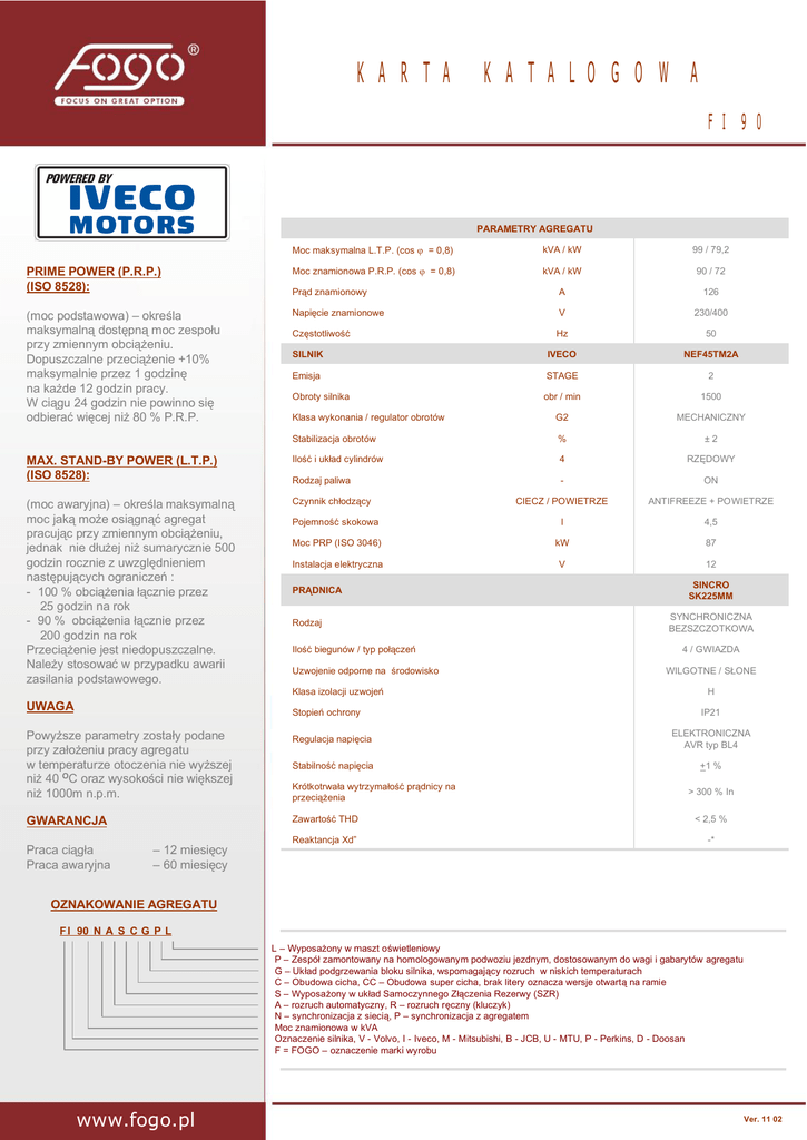 KARTA KATALOGOWA FI 90 PARAMETRY AGREGATU PRIME POWER (P.R.P.) (ISO 8528): (moc podstawowa) – okre la maksymaln dost pn moc zespo u przy zmiennym obci eniu. Dopuszczalne przeci enie +10% maksymalnie przez 1 godzin na ka de 12 godzin pracy. W ci gu 24 godzin nie powinno si odbiera wi cej ni 80 % P.R.P. MAX. STAND-BY POWER (L.T.P.) (ISO 8528): (moc awaryjna) – okre la maksymaln moc jak mo e osi gn agregat pracuj c przy zmiennym obci eniu, jednak nie d ej ni sumarycznie 500 godzin rocznie z uwzgl dnieniem nast puj cych ogranicze : - 100 % obci enia cznie przez 25 godzin na rok - 90 % obci enia cznie przez 200 godzin na rok Przeci enie jest niedopuszczalne. Nale y stosowa w przypadku awarii zasilania podstawowego. Moc maksymalna L.T.P. (cos = 0,8) kVA / kW 99 / 79,2 Moc znamionowa P.R.P. (cos = 0,8) kVA / kW 90 / 72 Pr d znamionowy A 126 Napi cie znamionowe V 230/400 Cz stotliwo Hz 50 SILNIK IVECO NEF45TM2A Emisja STAGE 2 Obroty silnika obr / min 1500 Klasa wykonania / regulator obrotów G2 MECHANICZNY Stabilizacja obrotów % ±2 Ilo 4 RZ DOWY - ON CIECZ / POWIETRZE ANTIFREEZE + POWIETRZE i uk ad cylindrów Rodzaj paliwa Czynnik ch odz cy l 4,5 Moc PRP (ISO 3046) Pojemno skokowa kW 87 Instalacja elektryczna V 12 SINCRO SK225MM PR DNICA SYNCHRONICZNA BEZSZCZOTKOWA Rodzaj Ilo biegunów / typ po cze Uzwojenie odporne na rodowisko Klasa izolacji uzwoje UWAGA Regulacja napi cia GWARANCJA Zawarto Stabilno THD Reaktancja Xd” Praca ci a Praca awaryjna IP21 ELEKTRONICZNA AVR typ BL4 napi cia Krótkotrwa a wytrzyma przeci enia WILGOTNE / S ONE H Stopie ochrony Powy sze parametry zosta y podane przy za eniu pracy agregatu w temperaturze otoczenia nie wy szej ni 40 OC oraz wysoko ci nie wi kszej ni 1000m n.p.m. 4 / GWIAZDA +1 % pr dnicy na > 300 % In < 2,5 % -* – 12 miesi cy – 60 miesi cy OZNAKOWANIE AGREGATU F I 90 N A S C G P L F L – Wyposa ony w maszt o wietleniowy P – Zespó zamontowany na homologowanym podwoziu jezdnym, dostosowanym do wagi i gabarytów agregatu G – Uk ad podgrzewania bloku silnika, wspomagaj cy rozruch w niskich temperaturach C – Obudowa cicha, CC – Obudowa super cicha, brak litery oznacza wersje otwart na ramie S – Wyposa ony w uk ad Samoczynnego Z czenia Rezerwy (SZR) A – rozruch automatyczny, R – rozruch r czny (kluczyk) N – synchronizacja z sieci , P – synchronizacja z agregatem Moc znamionowa w kVA Oznaczenie silnika, V - Volvo, I - Iveco, M - Mitsubishi, B - JCB, U - MTU, P - Perkins, D - Doosan F = FOGO – oznaczenie marki wyrobu www.fogo.pl Ver. 11 02 FI 90 WYTYCZNE INSTALACYJNE Sposób odbioru mocy listwa mm 95 Przewody odbioru mocy gi tka linka mm2 5x70( 30mb) Przewody automatyki SZR gi tka linka mm2 7x1,5 ( 30mb) Przewody potrzeb w asnych (grza ka, adowarka) gi tka linka mm2 3x2,5 ( 30mb) Przewody powy ej 30 mb – do uzgodnienia z dzia em technicznym. *** UWAGA: Za w ciwy dobór przekrojów przewodów odpowiada projektant *** Rozmiar szafy SZR (dolne podej cie kablowe) mm wys./szer./g . 1200/600/300 (wisz ca) rednica kolektora wydechu silnika mm 88,9 rednica wydechu (max. 7mb, 4 kolana 90st.) mm 88,9 rednica wydechu (max. 15mb, 4 kolana 90st.) mm 101,6 DO ZABUDOWY Wymiary ./szer./wys. Masa agregatu Pojemno paliwa zbiornika Czas pracy przy 100% obci enia 2500x1000x1520 kg 1300 l 210 h 9,5 Wysoko ch odnicy mm 740 Szeroko ch odnicy mm 650 ch odnicy a Odleg od pod mm 600 Powierzchnia wyrzutni powietrza m2 0,48 Powierzchnia czerpni powietrza m2 0,6 Moc akustyczna LWA dB 117** ./szer./wys. Masa agregatu 2500x1000x1770 kg 1500 l 210 Czas pracy przy 100% obci enia h 9,5 Moc akustyczna LWA dB 94*** Pojemno zbiornika paliwa Zdj cia przyk adowe EKSPLOATACJA Rodzaj oleju Ilo oleju w uk adzie smarowania 15W40 Rimula R3X L 12,8 Zu ycie oleju (na 1 kW) % 0,01 Okres pomi dzy wymianami oleju Rh 500 / 1 rok -38oC Antifreeze Glycoshell L 18,5 Rh / lat 1000 / 2 Rodzaj p ynu ch odz cego (glikolowy) Ilo p ynu ch odz cego Okres pomi dzy wymianami p ynu Pojemno Ah 100 - EN 590 Zu ycie paliwa100% l/h 22,0 Zu ycie paliwa 80% l/h 16,2 Zu ycie paliwa 50% l/h 11,0 Wymiana filtrów paliwa Rh 500 Wymiana filtrów oleju Rh 500 Zgodno akumulatora rozruchowego paliwa z norm Wytyczne p yty fundamentowej (p yta zbrojona) - silnik - pr dnica - bateria akumulatorów - instalacja elektryczna - zbiornik paliwa wraz z instalacj - wibroizolatory - kompensator wydechu - t umik - p yny eksploatacyjne (p yn ch odz cy + olej silnikowy, bez paliwa) - szafa potrzeb w asnych i odbioru mocy - zabezpieczenie pr dnicy (wy cznik mocy) - mikroprocesorowy uk ad sterowania - wska niki parametrów elektrycznych i mechanicznych - przycisk wy cznika bezpiecze stwa - sygna akustyczny awarii WERSJE: ZABUDOWANY Wymiary WYPOSA ENIE STANDARDOWE: ./szer. R - do zabudowy, sterowanie r czne - wyposa enie standardowe AG - do zabudowy, start automatyczny - wyposa enie standardowe + adowarka + zdolno przyj cia sygna u zdalnego startu ASG - do zabudowy, start automatyczny, SZR - wyposa enie standardowe + adowarka + zdolno przyj cia sygna u zdalnego startu + SZR (oddzielna szafa z w asnym sterowaniem) RC - zabudowany, sterowanie r czne - wyposa enie standardowe + obudowa atmosferyczna ACG - zabudowany, sterowanie automatyczne - wyposa enie standardowe + obudowa atmosferyczna + adowarka + zdolno przyj cia sygna u zdalnego startu, ASCG - zabudowany, start automatyczny, SZR - wyposa enie standardowe + obudowa atmosferyczna + adowarka + zdolno przyj cia sygna u zdalnego startu + SZR (oddzielna szafa z w asnym sterowaniem) OPCJE DODATKOWE: - zewn trzny zbiornik paliwa - synchronizacja - uk ad wentylacji - uk ad odprowadzenia spalin - zabezpieczenie ró nicowo-pr dowe - wykonanie agregatu w innej wersji napi ciowej - wykonanie zewn trzne uk adu SZR - apacz iskier - monitoring - p yta fundamentowa - obs uga gwarancyjna i pogwarancyjna - inne * 2700x1200 * - kontakt z dzia em technicznym, ** - agregat do zabudowy, wymaga zastosowania dodatkowego wyciszenia, *** - spe nia wymagania dyrektywy 2005/88/WE dla urz dze pra