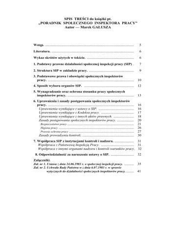 SPIS TREŚCI do książki pt. „PORADNIK SPOŁECZNEGO INSPEKTORA PRACY” Autor — Marek GAŁUSZA Wstęp. .................................................................................................... 5 Literatura. ............................................................................................. 6 Wykaz skrótów użytych w tekście. ..................................................... 6 1. Podstawy prawne działalności społecznej inspekcji pracy (SIP) . 7 2. Struktura SIP w zakładzie pracy. ................................................... 9 3. Podstawowe prawa i obowiązki społecznych inspektorów pracy. ................................................................................................. 10 4. Sposób wyboru organów SIP. ........................................................ 12 5. Wynagradzanie oraz ochrona stosunku pracy społecznych inspektorów pracy. ........................................................................... 13 6. Uprawnienia i zasady postępowania społecznych inspektorów pracy. ................................................................................................. Uprawnienia wynikające z ustawy o SIP. ........................................ Uprawnienia wynikające z Kodeksu pracy. ..................................... Uprawnienia wynikające z innych aktów prawnych. ....................... Zasady postępowania społecznych inspektorów pracy. ................... Bezpieczeństwo pracy ........................................................................... Higiena pracy ..................................................................................... Prawna ochrona pracy ......................................................................... Zasady prowadzenia kontroli. .......................................................... 16 16 17 18 20 21 26 27 30 7. Współpraca SIP z instytucjami kontroli i nadzoru. ...................... 31 Współpraca z Państwową Inspekcją Pracy. ..................................... 31 Współpraca z innymi organami nadzoru i kontroli warunków pracy. 32 8. Odpowiedzialność za naruszenie ustawy o SIP. .......................... 32 Załączniki. Zał. nr 1. Ustawa z dnia 24.06.1983 r. o społecznej inspekcji pracy. ........... Zał. nr 2. Uchwała Rady Państwa w z dnia 6.07.1983 r. w sprawie wytycznych do działalności społecznych inspektorów pracy. ......... 35 41 Zał. nr 3. Ustawa z dnia 30.10.2002 r. o ubezpieczeniu społecznym z tytułu wypadków przy pracy i chorób zawodowych. .............................. Zał. nr 4. Rozporządzenie RM z dnia 01.07.2009 r. w sprawie ustalania okoliczności i przyczyn wypadków przy pracy. ............................. Zał. nr 5. Rozporządzenie MGiP z dnia 16.09.2004 r. w sprawie wzoru protokołu ustalenia okoliczności i przyczyn wypadku przy pracy. ........................................................................................ Zał. nr 6. Rozporządzenie MPiPS z dnia 26.09.1997 r. w sprawie ogólnych przepisów bezpieczeństwa i higieny pracy. .................................. Zał. nr 7. Rozporządzenie MI z dnia 12.04.2002 r. w sprawie warunków technicznych, jakim powinny odpowiadać budynki i ich usytuowanie. (wyciąg) ............................................................... Zał. nr 8. Wzór zakładowej księgi zaleceń i uwag oraz oddziałowej (wydziałowej) księgi uwag. .............................................................. 45 63 67 73 123 133