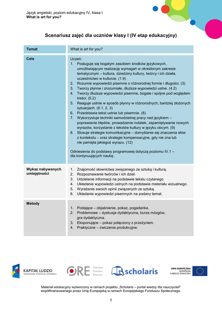 Język angielski, poziom edukacyjny IV, klasa I What is art for you? Scenariusz zajęć dla uczniów klasy I (IV etap edukacyjny) Temat What is art for you? Cele Uczeń: 1. Posługuje się bogatym zasobem środków językowych, umożliwiającym realizację wymagań w określonym zakresie tematycznym – kultura, dziedziny kultury, twórcy i ich dzieła, uczestnictwo w kulturze. (1.9) 2. Rozumie wypowiedzi pisemne o różnorodnej formie i długości. (3) 3. Tworzy płynne i zrozumiałe, dłuższe wypowiedzi ustne. (4.2) 4. Tworzy dłuższe wypowiedzi pisemne, bogate i spójne pod względem treści. (5.2) 5. Reaguje ustnie w sposób płynny w różnorodnych, bardziej złożonych sytuacjach. (6.1, 2, 3) 6. Przedstawia tekst ustnie lub pisemnie. (8) 7. Wykorzystuje techniki samodzielnej pracy nad językiem – poprawianie błędów, prowadzenie notatek, zapamiętywanie nowych wyrazów, korzystanie z tekstów kultury w języku obcym. (9) 8. Stosuje strategie komunikacyjne – domyślanie się znaczenia słów z kontekstu – oraz strategie kompensacyjne, gdy nie zna lub nie pamięta jakiegoś wyrazu. (12) Odniesienia do podstawy programowej dotyczą poziomu IV.1 – dla kontynuujących naukę. Wykaz nabywanych umiejętności 1. 2. 3. 4. 5. 6. Znajomość słownictwa związanego ze sztuką i kulturą. Rozpoznawanie twórców i ich dzieł. Udzielanie informacji na podstawie tekstu czytanego. Układanie wypowiedzi ustnych na podstawie materiału wizualnego. Wyrażanie swoich opinii związanych ze sztuką. Układanie wypowiedzi pisemnych na podany temat. Metody 1. Podające – objaśnienie, pokaz, pogadanka. 2. Problemowe – dyskusja dydaktyczna, burza mózgów, gra dydaktyczna. 3. Eksponujące – pokaz połączony z przeżyciem. 4. Praktyczne – ćwiczenia produkcyjne. Materiał edukacyjny wytworzony w ramach projektu „Scholaris – portal wiedzy dla nauczycieli" współfinansowanego przez Unię Europejską w ramach Europejskiego Funduszu Społecznego. 1 Język angielski, poziom edukacyjny IV, klasa I What is art for you? Formy 1. Praca z całą grupą. 2. Praca w grupach. 3. Praca indywidualna. Środki dydaktyczne 1. 2. 3. 4. 5. 6. 7. Proponowany czas zajęć 45 minut Ćwiczenie interaktywne pt. „Art”. Karta pracy pt. „Extra Task 1”. Ćwiczenie interaktywne pt. „Famous Works of Art”. Karta pracy pt. „Extra Task 2”. Przygotowane przez nauczyciela przykłady sztuki nowoczesnej. Ekran interaktywny ze zdaniami „Words and Sentences”. Karta pracy pt. „Homework – What is art for you?”. Opis sposobu realizacji Indywidualizacja nauczania uwzględniająca specjalne potrzeby edukacyjne 1. Nauczyciel wita się z uczniami. Pyta ich o samopoczucie, a także zadaje pytania: ‒ How often do you read? ‒ How often do you go to the cinema, art galleries, museums? ‒ How often do you listen to music? Ćwiczenie to jest pomocne zwłaszcza dla uczniów z trudnościami w czytaniu i pisaniu. Pokazuje im obrazowo, czego będzie dotyczyć lekcja. 2. Zapisuje na tablicy słowo ART i prosi uczniów, aby podali wszystkie skojarzenia z nim związane. Zapisuje je na tablicy. Nauczyciel informuje uczniów, że zajęcia będą poświęcone sztuce i jej znaczeniu w życiu człowieka. 3. Ćwiczenie interaktywne pt. „Art”. Nauczyciel wyświetla ekran z ćwiczeniem. Uczniowie przyglądają się ilustracjom i dopasowują do nich odpowiednie wyrazy. Uczniowie z trudnościami w czytaniu i pisaniu otrzymują dodatkowo kartę pracy utrwalającą słownictwo związane ze sztuką (karta pracy pt. „Extra Task 1”). Zadanie wykonują w ramach pracy domowej. 4. Ćwiczenie interaktywne pt. „Famous Works of Art”. Nauczyciel wyświetla ćwiczenie interaktywne. Uczniowie zapoznają się z listą sławnych dzieł i dopasowują słowa do odpowiednich grup. Następnie podają znane im inne Uczniowie z trudnościami w czytaniu i pisaniu otrzymują dodatkowo kartę pracy utrwalającą słownictwo związane ze sztuką Materiał edukacyjny wytworzony w ramach projektu „Scholaris – portal wiedzy dla nauczycieli" współfinansowanego przez Unię Europejską w ramach Europejskiego Funduszu Społecznego. 2 Język angielski, poziom edukacyjny IV, klasa I What is art for you? przykłady do każdej kategorii. W razie pojawienia się problemów, uczniowie wpisują odpowiednie hasła do wyszukiwarki internetowej (muszą mieć dostęp do internetu) i sprawdzają, jaką dziedzinę sztuki reprezentuje dana grupa wyrazów. (karta pracy pt. „Extra Task 2”). Zadanie wykonują w ramach pracy domowej. 5. Nauczyciel wyświetla przygotowane przez siebie (wyszukane w albumach, w internecie) przykłady sztuki współczesnej (Andy Warhol, Marcel Duchamp i inni). Pyta uczniów, co wiedzą na ten temat, czy znane są im jakieś inne dzieła współczesne lub ich twórcy. Uczniowie w trakcie oglądania prac komentują to, co widzą i dzielą się swoimi refleksjami. 6. Nauczyciel pyta, czy uczniowie zgadzają się ze zdaniem wypowiedzianym przez Andy’ego Warhola: ”Art is what you can get away with”. 7. Gra. Ekran interaktywny ze zdaniami „Words and sentences”. Nauczyciel dzieli uczniów na grupy 3–5-osobowe (w zależności od liczby osób w klasie). Na tablicy interaktywnej zostaną wyświetlone zdania, w których brakuje wyrazów. Nauczyciel powinien użyć opcji tablicy interaktywnej i zakryć zdania tak, aby widniało na niej tylko jedno zdanie do uzupełnienia na raz (pozostałe są ukryte przed wzrokiem uczniów). Zadaniem uczniów jest jak najszybsze podanie brakujących wyrazów i dopisanie ich do zdań. Grupa, która uzupełni większą liczbę zdań, wygrywa. Nauczyciel stara się dobrać uczniów w taki sposób, aby osoby z trudnościami w czytaniu i pisaniu znajdowały się w różnych grupach. Wszyscy uczniowie powinni być zaangażowani w wykonanie zadania i mieć swój udział w sukcesie grupy. 8. Nauczyciel zadaje uczniom pytanie: What is art for you? Uczniowie zastanawiają się i podają odpow