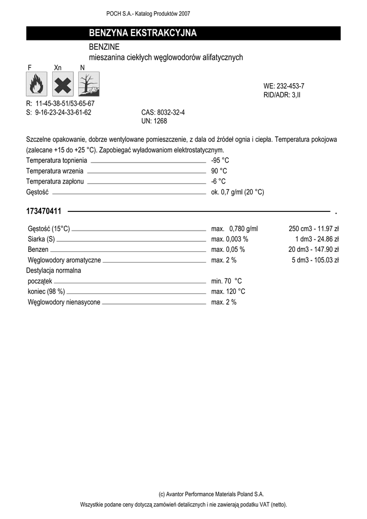 POCH S.A.- Katalog Produktów 2007 BENZYNA EKSTRAKCYJNA BENZINE mieszanina ciekłych węglowodorów alifatycznych F Xn N WE: 232-453-7 RID/ADR: 3,II R: 11-45-38-51/53-65-67 S: 9-16-23-24-33-61-62 CAS: 8032-32-4 UN: 1268 Szczelne opakowanie, dobrze wentylowane pomieszczenie, z dala od źródeł ognia i ciepła. Temperatura pokojowa (zalecane +15 do +25 °C). Zapobiegać wyładowaniom elektrostatycznym. Temperatura topnienia -95 °C Temperatura wrzenia 90 °C Temperatura zapłonu -6 °C Gęstość ok. 0,7 g/ml (20 °C) 173470411 . Gęstość (15°C) Siarka (S) Benzen Węglowodory aromatyczne Destylacja normalna początek koniec (98 %) Węglowodory nienasycone max. 0,780 g/ml max. 0,003 % max. 0,05 % max. 2 % min. 70 °C max. 120 °C max. 2 % (c) Avantor Performance Materials Poland S.A. Wszystkie podane ceny dotyczą zamówień detalicznych i nie zawierają podatku VAT (netto). 250 cm3 - 11.97 zł 1 dm3 - 24.86 zł 20 dm3 - 147.90 zł 5 dm3 - 105.03 zł