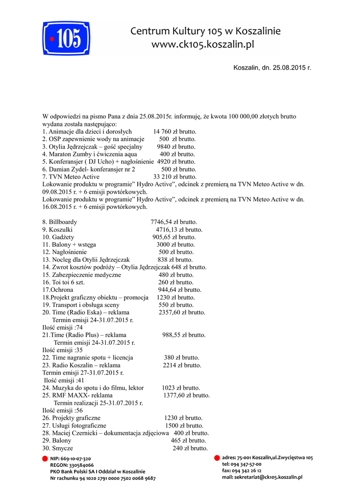 Koszalin, dn. 25.08.2015 r. W odpowiedzi na pismo Pana z dnia 25.08.2015r. informuję, że kwota 100 000,00 złotych brutto wydana została następująco: 1. Animacje dla dzieci i dorosłych 14 760 zł brutto. 2. OSP zapewnienie wody na animacje 500 zł brutto. 3. Otylia Jędrzejczak – gość specjalny 9840 zł brutto. 4. Maraton Zumby i ćwiczenia aqua 400 zł brutto. 5. Konferansjer ( DJ Ucho) + nagłośnienie 4920 zł brutto. 6. Damian Zydel- konferansjer nr 2 500 zł brutto. 7. TVN Meteo Active 33 210 zł brutto. Lokowanie produktu w programie” Hydro Active”, odcinek z premierą na TVN Meteo Active w dn. 09.08.2015 r. + 6 emisji powtórkowych. Lokowanie produktu w programie” Hydro Active”, odcinek z premierą na TVN Meteo Active w dn. 16.08.2015 r. + 6 emisji powtórkowych. 8. Billboardy 7746,54 zł brutto. 9. Koszulki 4716,13 zł brutto. 10. Gadżety 905,65 zł brutto. 11. Balony + wstęga 3000 zł brutto. 12. Nagłośnienie 500 zł brutto. 13. Nocleg dla Otylii Jędrzejczak 838 zł brutto. 14. Zwrot kosztów podróży – Otylia Jędrzejczak 648 zł brutto. 15. Zabezpieczenie medyczne 480 zł brutto. 16. Toi toi 6 szt. 260 zł brutto. 17.Ochrona 944,64 zł brutto. 18.Projekt graficzny obiektu – promocja 1230 zł brutto. 19. Transport i obsługa sceny 550 zł brutto. 20. Time (Radio Eska) – reklama 2357,60 zł brutto. Termin emisji 24-31.07.2015 r. Ilość emisji :74 21.Time (Radio Plus) – reklama 988,55 zł brutto. Termin emisji 24-31.07.2015 r. Ilość emisji :35 22. Time nagranie spotu + licencja 380 zł brutto. 23. Radio Koszalin – reklama 2214 zł brutto. Termin emisji 27-31.07.2015 r. Ilość emisji :41 24. Muzyka do spotu i do filmu, lektor 1023 zł brutto. 25. RMF MAXX- reklama 1377,60 zł brutto. Termin realizacji 25-31.07.2015 r. Ilość emisji :56 26. Projekty graficzne 1230 zł brutto. 27. Usługi fotograficzne 1500 zł brutto. 28. Maciej Czernicki – dokumentacja zdjęciowa 400 zł brutto. 29. Balony 465 zł brutto. 30. Smycze 240 zł brutto. 31. Nocleg- Dawid Bochen 32. Przemek Woś- konferansjer nr 3 638 zł brutto. 1090 zł brutto. Jednocześnie informuję, że nie możemy dostarczyć Panu dokumentów źródłowych, z których wynikają powyższe wartości z uwagi na to, że nie wolno ujawnić nam danych osobowych naszych kontrahentów. Natomiast nic nie stoi na przeszkodzie, by w naszej instytucji zapoznał się Pan z tymi dokumentami, po wcześniejszym uzgodnieniu terminu Pana przybycia do CK 105. Wskazuję jednak, że nie wolno Panu fotografować tych dokumentów lub ujawniać publicznie w jakiejkolwiek formie danych osobowych tam zawartych. Z poważaniem Emilia Wójcik Kierownik Działu Promocji i Marketingu Centrum Kultury 105 w Koszalinie