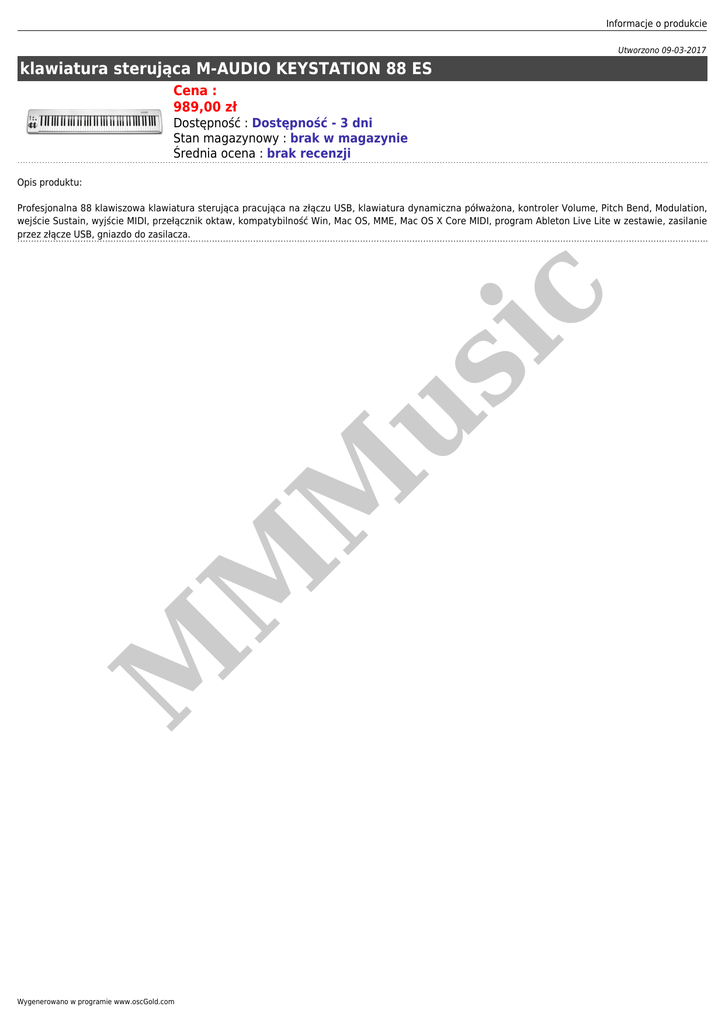 Informacje o produkcie Utworzono 09-03-2017 klawiatura sterująca M-AUDIO KEYSTATION 88 ES Cena : 989,00 zł Dostępność : Dostępność - 3 dni Stan magazynowy : brak w magazynie Średnia ocena : brak recenzji Opis produktu: M M M us ic Profesjonalna 88 klawiszowa klawiatura sterująca pracująca na złączu USB, klawiatura dynamiczna półważona, kontroler Volume, Pitch Bend, Modulation, wejście Sustain, wyjście MIDI, przełącznik oktaw, kompatybilność Win, Mac OS, MME, Mac OS X Core MIDI, program Ableton Live Lite w zestawie, zasilanie przez złącze USB, gniazdo do zasilacza. Wygenerowano w programie www.oscGold.com