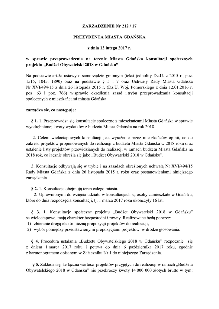 ZARZĄDZENIE Nr 212 / 17 PREZYDENTA MIASTA GDAŃSKA z dnia 13 lutego 2017 r. w sprawie przeprowadzenia na terenie Miasta Gdańska konsultacji społecznych projektu „Budżet Obywatelski 2018 w Gdańsku” Na podstawie art.5a ustawy o samorządzie gminnym (tekst jednolity Dz.U. z 2015 r., poz. 1515, 1045, 1890) oraz na podstawie § 5 i 7 oraz Uchwały Rady Miasta Gdańska Nr XVI/494/15 z dnia 26 listopada 2015 r. (Dz.U. Woj. Pomorskiego z dnia 12.01.2016 r. poz. 63 i poz. 766) w sprawie określenia zasad i trybu przeprowadzania konsultacji społecznych z mieszkańcami miasta Gdańska zarządza się, co następuje: § 1. 1. Przeprowadza się konsultacje społeczne z mieszkańcami Miasta Gdańska w sprawie wyodrębnionej kwoty wydatków z budżetu Miasta Gdańska na rok 2018. 2. Celem wieloetapowych konsultacji jest wyrażenie przez mieszkańców opinii, co do zakresu projektów proponowanych do realizacji z budżetu Miasta Gdańska w 2018 roku oraz ustalenie listy projektów przewidzianych do realizacji w ramach budżetu Miasta Gdańska na 2018 rok, co łącznie określa się jako „Budżet Obywatelski 2018 w Gdańsku”. 3. Konsultacje odbywają się w trybie i na zasadach określonych uchwałą Nr XVI/494/15 Rady Miasta Gdańska z dnia 26 listopada 2015 r. roku oraz postanowieniami niniejszego zarządzenia. § 2. 1. Konsultacje obejmują teren całego miasta. 2. Uprawnionymi do wzięcia udziału w konsultacjach są osoby zamieszkałe w Gdańsku, które do dnia rozpoczęcia konsultacji, tj. 1 marca 2017 roku ukończyły 16 lat. § 3. 1. Konsultacje społeczne projektu „Budżet Obywatelski 2018 w Gdańsku” są wieloetapowe, mają charakter bezpośredni i równy. Realizowane będą poprzez: 1) zbieranie drogą elektroniczną propozycji projektów do realizacji, 2) wybór pomiędzy przedstawionymi propozycjami projektów w drodze głosowania. § 4. Procedura ustalania „Budżetu Obywatelskiego 2018 w Gdańsku” rozpocznie się z dniem 1 marca 2017 roku i potrwa do dnia 6 października 2017 roku, zgodnie z harmonogramem opisanym w Załączniku Nr 1 do niniejszego Zarządzenia. § 5. Zakłada się, że łączna wartość projektów przyjętych do realizacji w ramach „Budżetu Obywatelskiego 2018 w Gdańsku” nie przekroczy kwoty 14 000 000 złotych brutto w tym: 11 200 000 złotych brutto na projekty dzielnicowe oraz 2 800 000 złotych brutto na projekty ogólnomiejskie. § 6. 1. Projekty dzielnicowe zgłaszane i realizowane są w 34 jednostkach pomocniczych gminy Miasta Gdańska. 2. Wartość jednostkowa zgłoszonego projektu dzielnicowego nie może przekroczyć kwoty przeznaczonej na dzielnicę, w której projekt ma być realizowany. 3. Granice dzielnic i kwotę przypadającą dla każdej z dzielnic określa Załącznik nr 2 do niniejszego Zarządzenia. 4. Projektem ogólnomiejskim jest projekt, którego szacunkowy koszt realizacji przekracza 280 000 zł brutto, dotyczy potrzeb mieszkańców więcej niż jednej dzielnicy lub miejsce jego realizacji nie jest przypisane do jednej dzielnicy. 5. Propozycja projektu musi być poparta przez grupę co najmniej 15 mieszkańców Gdańska uprawnionych do udziału w konsultacjach. W przypadku projektów dzielnicowych osoby te muszą zamieszkiwać na terenie dzielnicy której dotyczy projekt. Przy projektach ogólnomiejskich granice dzielnic nie mają znaczenia. § 7. 1. Propozycje projektów zweryfikowane pozytywnie pod względem formalnoprawnym tworzą „Bazę Projektów Dzielnicowych” i „Bazę Projektów Ogólnomiejskich”. 2. Projekty ujęte w Bazach Projektów wybierane są następnie przez osoby uprawnione do udziału w konsultacjach w głosowaniu powszechnym. 3. Projekty wybrane w głosowaniu zostają zarekomendowane do realizacji ze środków budżetu uchwalonego przez Radę Miasta Gdańska na rok 2018 i 2019. 4. Szczegółowy Regulamin konsultacji określa Załącznik Nr 3. § 8. 1. W celu przeprowadzenia konsultacji społecznych projektu „Budżet Obywatelski 2018 w Gdańsku” powołuje się Zespół Konsultacyjny. Skład Zespołu Konsultacyjnego zostanie powołany oddzielnym Zarządzeniem. 2. W uzasadnionych przypadkach można dokonać zmian w składzie Zespołu Konsultacyjnego. W przypadku osób delegowanych zmiana może być dokonana na wniosek Przewodniczącego Zespołu lub podmiotów delegujących. 3. Do zadań Zespołu Konsultacyjnego należy ocena formalno-prawna oraz gospodarności zgłoszonych projektów i nadzór nad sprawnym przeprowadzeniem konsultacji. Członkowie Zespołu uczestniczą w promocji idei Budżetu Obywatelskiego oraz udzielają mieszkańcom pomocy i informacji w kwestiach związanych z realizacją projektu. 4. Zobowiązuje się Dyrektorów Wydziałów Urzędu Miejskiego w Gdańsku i Dyrektorów Jednostek Organizacyjnych Miasta do udzielania Zespołowi pomocy w realizacji jego zadań. § 9. 1. Określa się górną granicę środków finansowych na przeprowadzenie konsultacji w wysokości 250.000 złotych brutto. 2. Koszty przeprowadzenia konsultacji pokryte zostaną ze środków budżetu Miasta Gdańska na rok 2017. 3. Konsultacje poprzedza kampania informacyjna. 4. Dokumentacja z konsultacji podlega archiwizacji, zgodnie z obowiązującymi przepisami prawa. § 10. 1. Zarządzenie podlega publikacji w Biuletynie Informacji Publicznej Miasta Gdańska, na stronie internetowej i tablicy ogłoszeń Urzędu Miejskiego w Gdańsku. 2. Zarządzenie wchodzi w życie z dniem podpisania. Prezydent Miasta Gdańska /-/ Paweł Adamowicz Załącznik Nr 1 do ZARZĄDZENIA Nr 212/17 PREZYDENTA MIASTA GDAŃSKA z dnia 13 lutego 2017 r. „Budżet Obywatelski 2018 w Gdańsku” HARMONOGRAM 20 – 28 lutego 2017 r. – kampania informacyjna. 1 – 31 marca 2017 r. – przyjmowanie propozycji projektów do realizacji. 3 marca – 30 czerwca 2017 r. – ocena zgłoszonych projektów pod względem możliwości ich wykonania. 1 kwietnia - 31 lipca 2017 r. - weryfikacja formalno-prawna i gospodarności propozycji projektów p