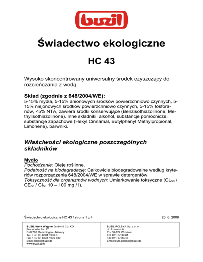 Świadectwo ekologiczne HC 43 Wysoko skoncentrowany uniwersalny środek czyszczący do rozcieńczania z wodą. Skład (zgodnie z 648/2004/WE): 5-15% mydła, 5-15% anionowych środków powierzchniowo czynnych, 515% niejonowych środków powierzchniowo czynnych, 5-15% fosforanów, <5% NTA, zawiera środki konserwujące (Benzisothiazolinone, Methylisothiazolinone). Inne składniki: alkohol, substancje pomocnicze, substancje zapachowe (Hexyl Cinnamal, Butylphenyl Methylpropional, Limonene), barwniki. Właściwości ekologiczne poszczególnych składników Mydło Pochodzenie: Oleje roślinne. Podatność na biodegradację: Całkowicie biodegradowalne według kryteriów rozporządzenia 648/2004/WE w sprawie detergentów. Toksyczność dla organizmów wodnych: Umiarkowanie toksyczne (CL50 / CE50 / CI50 10 – 100 mg / l). Świadectwo ekologiczne HC 43 / strona 1 z 4 BUZIL-Werk Wagner GmbH & Co. KG Fraunhofer Str. 17 D-87700 Memmingen - Niemcy Tel. + 49 (0) 8331 / 930-6 Fax + 49 (0) 8331 / 930-880 Email [email protected] www.buzil.com 20. 6. 2008 BUZIL POLSKA Sp. z o. o. ul. Szewska 8 PL- 50-122 Wrocław Tel. 071-3766031 Fax 071-3766045 Email [email protected] Anionowe i niejonowe środki powierzchniowo czynne Pochodzenie: Ropa naftowa. Podatność na biodegradację: Całkowicie biodegradowalne według kryteriów rozporządzenia 648/2004/WE w sprawie detergentów. Toksyczność dla organizmów wodnych: Toksyczne (CL50 / CE50 / CI50 1 – 10 mg / l). Fosforany Pochodzenie: Surowce mineralne. Podatność na biodegradację: Nie dotyczy. Toksyczność dla organizmów wodnych: Fosforany są całkowicie nietoksyczne i stanowią składniki naturalnych obiegów materii. Ponieważ są one podstawowymi substancjami odżywczymi dla roślin, nadmierne wprowadzenie do wód może spowodować ich użyźnienie (eutrofizację). NTA (Nitrylotrioctan) Pochodzenie: Ropa naftowa. Podatność na biodegradację: Łatwo biodegradowalny według kryteriów testów szeregu OECD 301. Toksyczność dla organizmów wodnych: Umiarkowanie toksyczny (CL50 / CE50 / CI50 około 100 mg / l). Środki konserwujące Pochodzenie: Ropa naftowa. Podatność na biodegradację: Zgodnie z swoim przeznaczeniem środki konserwujące są toksyczne dla drobnoustrojów i dlatego ulegają biodegradacji tylko w dużym rozcieńczeniu. Toksyczność dla organizmów wodnych: Silnie toksyczne (CL50 / CE50 / CI50 < 1 mg / l). Świadectwo ekologiczne HC 43 / strona 2 z 4 BUZIL-Werk Wagner GmbH & Co. KG Fraunhofer Str. 17 D-87700 Memmingen - Niemcy Tel. + 49 (0) 8331 / 930-6 Fax + 49 (0) 8331 / 930-880 Email [email protected] www.buzil.com 20. 6. 2008 BUZIL POLSKA Sp. z o. o. ul. Szewska 8 PL- 50-122 Wrocław Tel. 071-3766031 Fax 071-3766045 Email [email protected] Alkohol Pochodzenie: Ropa naftowa albo zboże. Podatność na biodegradację: Łatwo biodegradowalny według kryteriów testów szeregu OECD 301. Toksyczność dla organizmów wodnych: Nietoksyczny (CL50 / CE50 / CI50 > 1000 mg / l). Substancje pomocnicze Pochodzenie: Ropa naftowa. Podatność na biodegradację: Nie biodegradowalne. Ulegają one jednak częściowemu rozkładowi abiotycznemu (np. przez promieniowanie słońca). Toksyczność dla organizmów wodnych: Nietoksyczne (CL50 / CE50 / CI50 > 1000 mg / l). Substancje zapachowe Perfumy są mieszaninami różnych naturalnych i syntetycznych substancji zapachowych. Niektóre z nich są tylko wolno biodegradowalne lub/i toksyczne dla organizmów wodnych. Można jednak wnioskować z zachowania się podobnych substancji w naturze, że wszystkie komponenty ulegają wcześniej czy później rozkładowi biologicznemu i nie stwarzają długotrwałego zagrożenia dla środowiska. Barwniki Barwniki używane w środkach czyszczących w bardzo niskich stężeniach (niewiele ppm) z reguły mają pochodzenie syntetyczne (ropa naftowa), nie są łatwo biodegradowalne a jednocześnie praktycznie nietoksyczne dla organizmów wodnych. Świadectwo ekologiczne HC 43 / strona 3 z 4 BUZIL-Werk Wagner GmbH & Co. KG Fraunhofer Str. 17 D-87700 Memmingen - Niemcy Tel. + 49 (0) 8331 / 930-6 Fax + 49 (0) 8331 / 930-880 Email [email protected] www.buzil.com 20. 6. 2008 BUZIL POLSKA Sp. z o. o. ul. Szewska 8 PL- 50-122 Wrocław Tel. 071-3766031 Fax 071-3766045 Email [email protected] Zachowanie się produktu w oczyszczalniach ścieków oraz w środowisku Niekorzystne wpływy na środowisko naturalne mogą wynikać z toksyczności zawartych w produkcie środków powierzchniowo czynnych dla organizmów wodnych. Ulegają one wraz z innymi organicznymi komponentami prawie całkowitej biodegradacji już podczas zwyczajowego zatrzymania się ścieków w oczyszczalniach. Pozostałości dostające się potem do naturalnych wód od razu ulegają dalszej biodegradacji i znikają po krótkim czasie ze środowiska. Substancje pomocnicze, które występują w produkcie w bardzo małych stężeniach (zakres ppm), wytrącają się w ściekach i dostają do szlamu. Ilość fosforanów docierająca do środowiska naturalnego zależy od wyposażenia oczyszczalni ścieków. Możliwe działania użyźniające należy ocenić uwzględniając ogólne obciążenie ścieków fosforanami. Świadectwo ekologiczne HC 43 / strona 4 z 4 BUZIL-Werk Wagner GmbH & Co. KG Fraunhofer Str. 17 D-87700 Memmingen - Niemcy Tel. + 49 (0) 8331 / 930-6 Fax + 49 (0) 8331 / 930-880 Email [email protected] www.buzil.com 20. 6. 2008 BUZIL POLSKA Sp. z o. o. ul. Szewska 8 PL- 50-122 Wrocław Tel. 071-3766031 Fax 071-3766045 Email [email protected]
