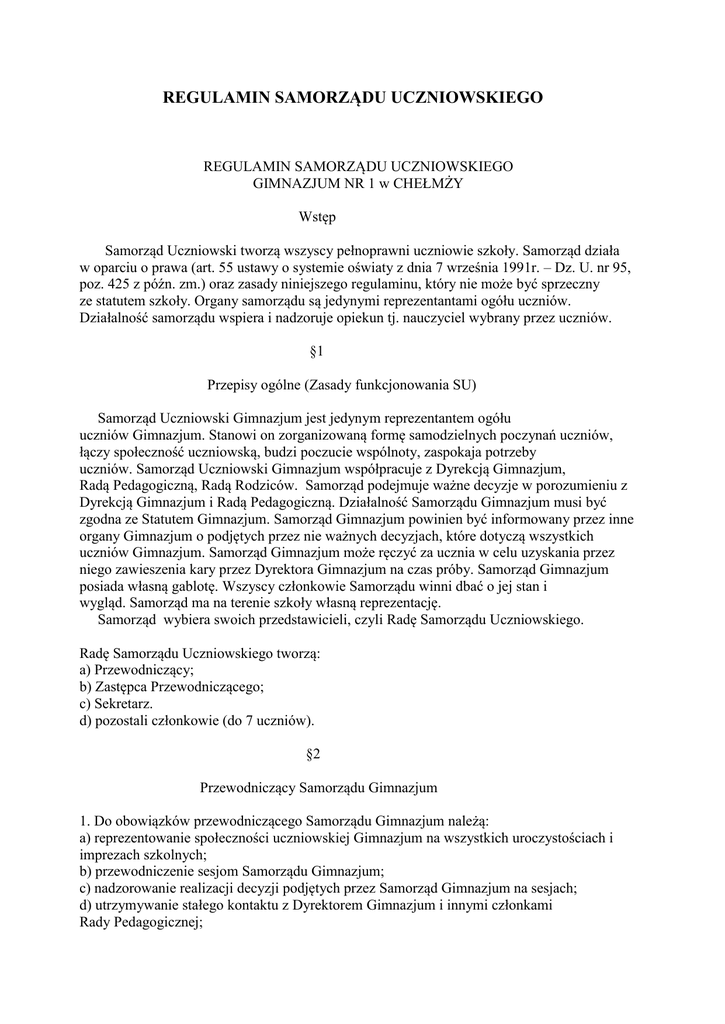 REGULAMIN SAMORZĄDU UCZNIOWSKIEGO REGULAMIN SAMORZĄDU UCZNIOWSKIEGO GIMNAZJUM NR 1 w CHEŁMŻY Wstęp Samorząd Uczniowski tworzą wszyscy pełnoprawni uczniowie szkoły. Samorząd działa w oparciu o prawa (art. 55 ustawy o systemie oświaty z dnia 7 września 1991r. – Dz. U. nr 95, poz. 425 z późn. zm.) oraz zasady niniejszego regulaminu, który nie może być sprzeczny ze statutem szkoły. Organy samorządu są jedynymi reprezentantami ogółu uczniów. Działalność samorządu wspiera i nadzoruje opiekun tj. nauczyciel wybrany przez uczniów. §1 Przepisy ogólne (Zasady funkcjonowania SU) Samorząd Uczniowski Gimnazjum jest jedynym reprezentantem ogółu uczniów Gimnazjum. Stanowi on zorganizowaną formę samodzielnych poczynań uczniów, łączy społeczność uczniowską, budzi poczucie wspólnoty, zaspokaja potrzeby uczniów. Samorząd Uczniowski Gimnazjum współpracuje z Dyrekcją Gimnazjum, Radą Pedagogiczną, Radą Rodziców. Samorząd podejmuje ważne decyzje w porozumieniu z Dyrekcją Gimnazjum i Radą Pedagogiczną. Działalność Samorządu Gimnazjum musi być zgodna ze Statutem Gimnazjum. Samorząd Gimnazjum powinien być informowany przez inne organy Gimnazjum o podjętych przez nie ważnych decyzjach, które dotyczą wszystkich uczniów Gimnazjum. Samorząd Gimnazjum może ręczyć za ucznia w celu uzyskania przez niego zawieszenia kary przez Dyrektora Gimnazjum na czas próby. Samorząd Gimnazjum posiada własną gablotę. Wszyscy członkowie Samorządu winni dbać o jej stan i wygląd. Samorząd ma na terenie szkoły własną reprezentację. Samorząd wybiera swoich przedstawicieli, czyli Radę Samorządu Uczniowskiego. Radę Samorządu Uczniowskiego tworzą: a) Przewodniczący; b) Zastępca Przewodniczącego; c) Sekretarz. d) pozostali członkowie (do 7 uczniów). §2 Przewodniczący Samorządu Gimnazjum 1. Do obowiązków przewodniczącego Samorządu Gimnazjum należą: a) reprezentowanie społeczności uczniowskiej Gimnazjum na wszystkich uroczystościach i imprezach szkolnych; b) przewodniczenie sesjom Samorządu Gimnazjum; c) nadzorowanie realizacji decyzji podjętych przez Samorząd Gimnazjum na sesjach; d) utrzymywanie stałego kontaktu z Dyrektorem Gimnazjum i innymi członkami Rady Pedagogicznej; e) informowanie Dyrektora Gimnazjum i grona pedagogicznego o ważnych dla całej społeczności Gimnazjum postanowieniach lub wnioskach Samorządu Gimnazjum; f) przygotowanie na koniec pierwszego semestru i koniec roku szkolnego sprawozdań z działalności Samorządu, które zostaną przedstawione na Radzie Pedagogicznej i które zostaną wpisane do protokołu jej obrad; 2. Przewodniczący Samorządu Gimnazjum ma prawo: a) zlecać do wykonania innym członkom Samorządu różne zadania w ramach prac Samorządu; b) w porozumieniu z opiekunem złożyć na sesji wniosek o zawieszenie w prawach członka Samorządu. §3 Zastępca przewodniczącego Samorządu Gimnazjum Zastępca przewodniczącego Samorządu Gimnazjum w razie nieobecności lub niemożności sprawowania funkcji przez przewodniczącego Samorządu przejmuje wszystkie jego obowiązki i posiada wszystkie jego prawa. Zastępca przewodniczącego Samorządu Gimnazjum przejmuje w razie konieczności obowiązki innych członków Samorządu, tj. skarbnika lub członka Samorządu, któremu została powierzona realizacja decyzji Samorządu. §4 Sekretarz Samorządu Gimnazjum 1. Sekretarz Samorządu Gimnazjum prowadzi na zebraniach Samorządu protokoły, przygotowuje, gromadzi i przechowuje dokumenty Samorządu. §5 Inni członkowie Samorządu Gimnazjum 1. Inni członkowie Samorządu Gimnazjum mają obowiązek uczestniczyć w zebraniach, brać aktywny udział w pracach Samorządu i realizować powierzone im zadania w zgodzie z decyzjami Samorządu. §6 Opiekun Samorządu Gimnazjum 1. Do obowiązków opiekuna Samorządu Gimnazjum należą: a) zapoznanie wszystkich członków Samorządu z ich obowiązkami i prawami zawartymi w Regulaminie Samorządu Uczniowskiego Gimnazjum ; b) nadzorowanie prac Samorządu; c) służenie Samorządowi radą i pomocą we wszystkich przedsięwzięciach; d) obecność na wszystkich sesjach Samorządu Gimnazjum. 2. Opiekun Samorządu Gimnazjum ma prawo: a) zwołać Samorząd na sesję i w razie konieczności jej przewodniczyć; b) wpisać w razie konieczności pochwały lub uwagi do dzienników wychowawczych w imieniu Samorządu w sprawach, nad którymi ten sprawuje opiekę lub nadzór; c) złożyć na sesji wniosek o zawieszenie w prawach członka Samorządu; 3. W razie potrzeby opiekun Samorządu Gimnazjum jest łącznikiem i mediatorem pomiędzy Samorządem a wszystkimi innymi organami Gimnazjum i ich członkami. §7 Wybory przedstawicieli Samorządu Uczniowskiego 1. W wyborach do Samorządu Uczniowskiego startować mogą wszystkie chętne osoby, które spełniają poniższe kryteria: a) członek SU nie może mieć oceny z zachowania niższej niż poprawna; b) nie może powtarzać klasy. 2. Opiekun Samorządu Uczniowskiego wybierany jest we wrześniu przez społeczność uczniowską. Opiekun może zostać powołany także przez dyrektora szkoły lub radę pedagogiczną. 3. We wrześniu każdego roku szkolnego przeprowadza się wybory do Samorządu Klasowego. W ostatnich dniach września pedagog szkolny przeprowadza w szkole tajne głosowanie, podczas którego uczniowie wybierają Radę Samorządu Uczniowskiego. Wybory są powszechne, równe i tajne. W skład Rady SU może wejść 10-12 uczniów. 4. W wyborach biorą udział wszyscy uczniowie szkoły. 5. W skład komisji wyborczej nie może wchodzić osoba kandydująca do Zarządu. 6. Rada wybiera ze swojego grona przewodniczącego, zastępcę przewodniczącego, sekretarza. §8 Sesje Rady Samorządu Gimnazjum 1. Samorząd Gimnazjum zbiera się na Sesje zwyczajne przynajmniej raz w miesiącu. 2. Samorząd Gimnazjum zbiera się na Sesje nadzwyczajne w każdym terminie, jeśli tylko zajdzie taka potrzeba. 3. Sesję Rady Samorządu Gim