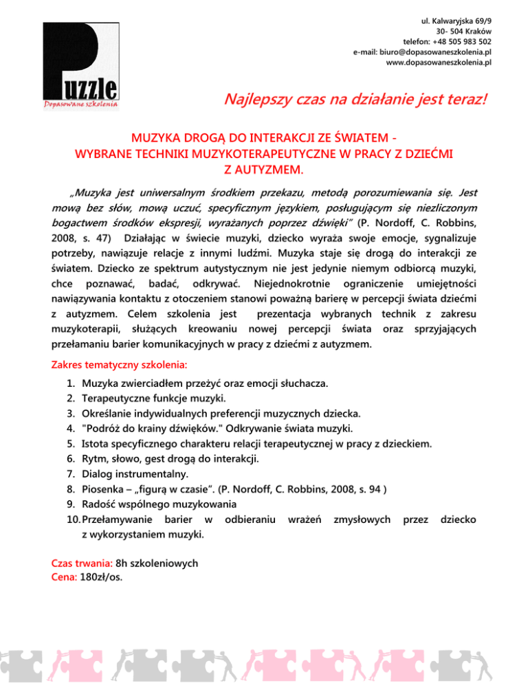 ul. Kalwaryjska 69/9 30- 504 Kraków telefon: +48 505 983 502 e-mail: [email protected] www.dopasowaneszkolenia.pl Najlepszy czas na działanie jest teraz! MUZYKA DROGĄ DO INTERAKCJI ZE ŚWIATEM WYBRANE TECHNIKI MUZYKOTERAPEUTYCZNE W PRACY Z DZIEĆMI Z AUTYZMEM. „Muzyka jest uniwersalnym środkiem przekazu, metodą porozumiewania się. Jest mową bez słów, mową uczuć, specyficznym językiem, posługującym się niezliczonym bogactwem środków ekspresji, wyrażanych poprzez dźwięki” (P. Nordoff, C. Robbins, 2008, s. 47) Działając w świecie muzyki, dziecko wyraża swoje emocje, sygnalizuje potrzeby, nawiązuje relacje z innymi ludźmi. Muzyka staje się drogą do interakcji ze światem. Dziecko ze spektrum autystycznym nie jest jedynie niemym odbiorcą muzyki, chce poznawać, badać, odkrywać. Niejednokrotnie ograniczenie umiejętności nawiązywania kontaktu z otoczeniem stanowi poważną barierę w percepcji świata dziećmi z autyzmem. Celem szkolenia jest prezentacja wybranych technik z zakresu muzykoterapii, służących kreowaniu nowej percepcji świata oraz sprzyjających przełamaniu barier komunikacyjnych w pracy z dziećmi z autyzmem. Zakres tematyczny szkolenia: 1. Muzyka zwierciadłem przeżyć oraz emocji słuchacza. 2. Terapeutyczne funkcje muzyki. 3. Określanie indywidualnych preferencji muzycznych dziecka. 4. "Podróż do krainy dźwięków." Odkrywanie świata muzyki. 5. Istota specyficznego charakteru relacji terapeutycznej w pracy z dzieckiem. 6. Rytm, słowo, gest drogą do interakcji. 7. Dialog instrumentalny. 8. Piosenka – „figurą w czasie”. (P. Nordoff, C. Robbins, 2008, s. 94 ) 9. Radość wspólnego muzykowania 10. Przełamywanie barier w odbieraniu wrażeń zmysłowych przez dziecko z wykorzystaniem muzyki. Czas trwania: 8h szkoleniowych Cena: 180zł/os. Informacje o trenerce: Joanna Drozd - Kucz - pedagog, muzykoterapii i choreoterapii oligofrenopedagog, instruktor metod Wykształcenie: Akademia Muzyczna im. Grażyny i Kiejstuta Bacewiczów w Łodzi Wydział Kompozycji, Teorii Muzyki, Rytmiki i Edukacji Artystycznej kierunek: Edukacja Artystyczna w Zakresie Sztuki Muzycznej w zakresie muzykoterapii Uniwersytet Śląski w Katowicach Wydział Pedagogiki i Psychologii kierunek: pedagogika specjalność: zintegrowana edukacja wczesnoszkolna i oligofrenopedagogika Studio Działań Kreatywnych „Movimento” w Poznaniu: kurs instruktorski: „Muzyka, taniec, ruch w edukacji i terapii” tytuł zawodowy: instruktor metod muzykoterapii i choreoterapii Doświadczenie zawodowe zdobywała jako nauczyciel w Specjalnym Ośrodku Szkolno – Wychowawczym, muzykoterapeuta w Stowarzyszeniu Na Rzecz Osób Niepełnosprawnych, wykładowca na studiach podyplomowych z zakresu oligofrenopedagogiki i właściciel Centrum Twórczej Terapii – GAMA, które oferuje zajęcia muzykoterapii indywidualnej, grupowej, zajęć muzycznych dla małych dzieci, oraz zajęć muzykoterapii z elementami logopedii dla dzieci z trudnościami rozwojowymi. Jest członkiem Polskiego Stowarzyszenia Muzykoterapeutów w Lublinie i Stowarzyszenia "Psychiatria i Sztuka" w Krakowie. Odbyła wiele szkoleń doskonalących jego umiejętności i warsztat pracy, m.in.: - Kurs języka miganego dla nauczycieli – I stopień, „Metoda Ruchu Rozwijającego bazującego na pracy Weroniki Sherborne” - warsztat szkoleniowy I stopnia, „Moje sylabki – nauka czytania metodą symultaniczno – sekwencyjną”, "Bajki – legendy – mity. Dziecięcy świat teatru. Bawimy się w teatr” – warsztaty teatralne, Program Rozwoju Komunikacji – MAKATON - Szkolenie podstawowe – I i II stopień, Program Rozwoju Komunikacji – MAKATON - Szkolenia dodatkowe – Metodyka, Zabawy, „Diagnoza funkcjonalna dziecka z zaburzeniami rozwoju, Profil Psychoedukacyjny PEP-R”, „Obsługa oraz wykorzystanie programu MÓWik w terapii osób niemówiących” „Muzyka w przedszkolu i szkole wg idei Carla Orffa”. Brała udział w konferencjach naukowych, m.in. Congress of Montessori Europe e.V. 2009 „Every child is special” – Montessori and Inclusion w Krakowie 18 październik 2009 o Referent nt. „Dziecko z niepełnosprawnością intelektualną w świecie muzyki. Od percepcji muzyki do aktywności twórczej.” Ogólnopolska Konferencja Naukowa „Systemowe podejście rozwoju, edukacji, życia zawodowego i społecznego i zespołem Aspergera” w Poznaniu 4 – 5 grudzień 2009 we wspomaganiu osób z autyzmem o Referent nt. „Muzyka drogą do interakcji ze światem. Wybrane techniki muzykoterapeutyczne w pracy z dziećmi z autyzmem.” Konferencja Naukowo – Metodyczna „Arteterapia – Sztuka w terapii, rozwoju i edukacji” w Chorzowie 17 październik 2013 o Referent nt. „Odkryj mój mały świat” – twórcze zabawy z muzyką w pracy z dziećmi.” Jest autorka publikacji naukowych, m.in.: „Dziecko z niepełnosprawnością intelektualną w świecie muzyki. Od percepcji muzyki do aktywności twórczej.” [red.: Elżbieta Lubińska – Kościółek; Katarzyna Plutecka: „Stymulowanie potencjału twórczego u osób z różnymi potrzebami edukacyjnymi.” Oficyna Wydawnicza „Impuls”, Kraków 2011r] „Wykorzystanie gestów systemu Makaton w procesie terapii muzycznej dziecka z niepełnosprawnością intelektualną” [red.: B.B. Kaczmarek: „Makaton. Alternatywna metoda wspomagająca komunikację osób ze złożonymi trudnościami w porozumiewaniu się.” Oficyna Wydawnicza „Impuls” [w druku] Zapraszam do współpracy Katarzyna Kusińska Koordynator ds. Szkoleń tel: 505 983 502 [email protected] www.dopasowaneszkolenia.pl https://www.facebook.com/dopasowaneszkolenia