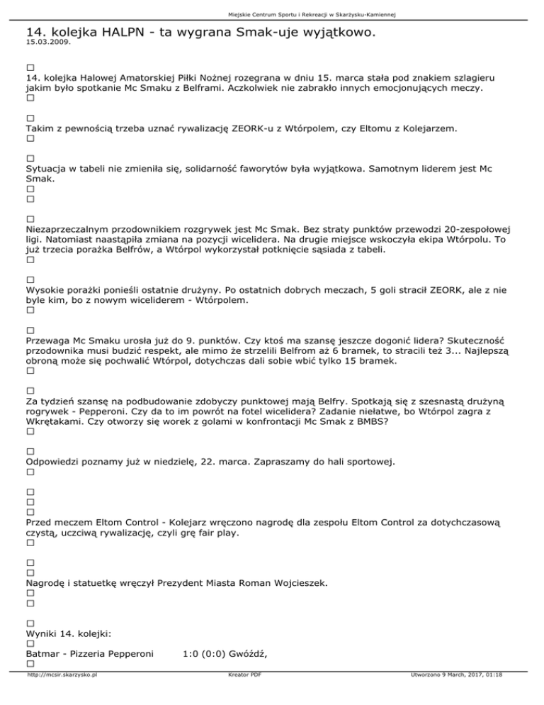 Miejskie Centrum Sportu i Rekreacji w Skarżysku-Kamiennej 14. kolejka HALPN - ta wygrana Smak-uje wyjątkowo. 15.03.2009. 14. kolejka Halowej Amatorskiej Piłki Nożnej rozegrana w dniu 15. marca stała pod znakiem szlagieru jakim było spotkanie Mc Smaku z Belframi. Aczkolwiek nie zabrakło innych emocjonujących meczy. Takim z pewnością trzeba uznać rywalizację ZEORK-u z Wtórpolem, czy Eltomu z Kolejarzem. Sytuacja w tabeli nie zmieniła się, solidarność faworytów była wyjątkowa. Samotnym liderem jest Mc Smak. Niezaprzeczalnym przodownikiem rozgrywek jest Mc Smak. Bez straty punktów przewodzi 20-zespołowej ligi. Natomiast naastąpiła zmiana na pozycji wicelidera. Na drugie miejsce wskoczyła ekipa Wtórpolu. To już trzecia porażka Belfrów, a Wtórpol wykorzystał potknięcie sąsiada z tabeli. Wysokie porażki ponieśli ostatnie drużyny. Po ostatnich dobrych meczach, 5 goli stracił ZEORK, ale z nie byle kim, bo z nowym wiceliderem - Wtórpolem. Przewaga Mc Smaku urosła już do 9. punktów. Czy ktoś ma szansę jeszcze dogonić lidera? Skuteczność przodownika musi budzić respekt, ale mimo że strzelili Belfrom aż 6 bramek, to stracili też 3... Najlepszą obroną może się pochwalić Wtórpol, dotychczas dali sobie wbić tylko 15 bramek. Za tydzień szansę na podbudowanie zdobyczy punktowej mają Belfry. Spotkają się z szesnastą drużyną rogrywek - Pepperoni. Czy da to im powrót na fotel wicelidera? Zadanie niełatwe, bo Wtórpol zagra z Wkrętakami. Czy otworzy się worek z golami w konfrontacji Mc Smak z BMBS? Odpowiedzi poznamy już w niedzielę, 22. marca. Zapraszamy do hali sportowej. Przed meczem Eltom Control - Kolejarz wręczono nagrodę dla zespołu Eltom Control za dotychczasową czystą, uczciwą rywalizację, czyli grę fair play. Nagrodę i statuetkę wręczył Prezydent Miasta Roman Wojcieszek. Wyniki 14. kolejki: Batmar - Pizzeria Pepperoni http://mcsir.skarzysko.pl 1:0 (0:0) Gwóźdź, Kreator PDF Utworzono 9 March, 2017, 01:18 Miejskie Centrum Sportu i Rekreacji w Skarżysku-Kamiennej Erbabud - Kamienna Burza - Lewiatan Duet Posadaj Jedliński, BMBS - Matbud Eltom Control - Kolejarz Zagdan, Belfry - Mc Smak samob., Football Fighters - Grom ZEORK - Wtórpol Wkrętaki - Rejów Venus - Płomień Mazurkiewicz R. 1:3 (0:3) Wierzchowski - Grabowski, 1:6 (0:0) Kaczmarski - Bilski 2, Rzeszowski S. 2, Rzeszowski P., 0:0 4:3 (3:1) Piotrowski 2, Radosław Grzyb, Lech - Karpeta, Łyżwa, 3:6 (1:4) Kasprzyk 2, Przybycień - Miller 2, Szwed, Bębas, Grzelka, 2:1 (1:1) Czapnik R., Charyasz - Wierzbowicz, 0:5 (0:1) Kwaśniewski 2, Błąd, Połeć, Gadecki, 2:4 (0:4) Konrad Koziel, Kujawa - Sorsa 2, Kopycki, Koryciński, 3:1 (1:1) Krzysztof Burasiewicz, Kamil Burasiewicz, Jurkiewicz - Tabela po 14. kolejkach: Lp. Zespół Pkt. Bramki 1. Mc Smak 42 65-21 2. http://mcsir.skarzysko.pl Kreator PDF Utworzono 9 March, 2017, 01:18 Miejskie Centrum Sportu i Rekreacji w Skarżysku-Kamiennej Wtórpol 33 45-15 3. Belfry 31 50-26 4. Football Fighters 25 44-26 5. Venus 25 25-27 6. Eltom Control 24 http://mcsir.skarzysko.pl Kreator PDF Utworzono 9 March, 2017, 01:18 Miejskie Centrum Sportu i Rekreacji w Skarżysku-Kamiennej 43-30 7. Kolejarz 24 30-23 8. Matbud C.H. 23 25-21 9. Wkrętaki 23 43-32 10. ZEORK 22 30-32 http://mcsir.skarzysko.pl Kreator PDF Utworzono 9 March, 2017, 01:18 Miejskie Centrum Sportu i Rekreacji w Skarżysku-Kamiennej 11. BMBS 21 35-27 12. Lewiatan Duet Posadaj 19 35-28 13. Rejów 18 34-31 14. Grom 17 36-32 15. Kamienna http://mcsir.skarzysko.pl Kreator PDF Utworzono 9 March, 2017, 01:18 Miejskie Centrum Sportu i Rekreacji w Skarżysku-Kamiennej 15 34-39 16. Pizzeria Pepperoni 13 20-31 17. Erbabud 9 21-49 18. Batmar 9 22-49 19. Płomień 5 12-36 20. Burza http://mcsir.skarzysko.pl Kreator PDF Utworzono 9 March, 2017, 01:18 Miejskie Centrum Sportu i Rekreacji w Skarżysku-Kamiennej 1 17-91 Zapowiedź 15. kolejki, 22.03: Najlepsi strzelcy: 1. Czapnik K. Smak) - 18 Mecze poranne, od godz. 8.00: (Kamienna) - 15 3. 1. 2. 3. Kwaśniewski M. (Mc 2. Grabowski K. (Wtórpol) - 15 Grom - ZEORK Kamienna - Football Fighters Pizzeria Pepperoni - Belfry Mecze popołudniowe, od godz. 17.30: 4. Płomień - Batmar 5. Rejów - Venus 6. Wtórpol - Wkrętaki 7. Matbud C.H. - Burza 8. Mc Smak - BMBS 9. Kolejarz - Erbabud 10. Lewiatan Duet Posadaj - Eltom Control 14. kolejka w obiektywie: http://mcsir.skarzysko.pl Kreator PDF Utworzono 9 March, 2017, 01:18 Miejskie Centrum Sportu i Rekreacji w Skarżysku-Kamiennej Zdjęcia dzięki portalowi skarzysko24.pl http://mcsir.skarzysko.pl Kreator PDF Utworzono 9 March, 2017, 01:18