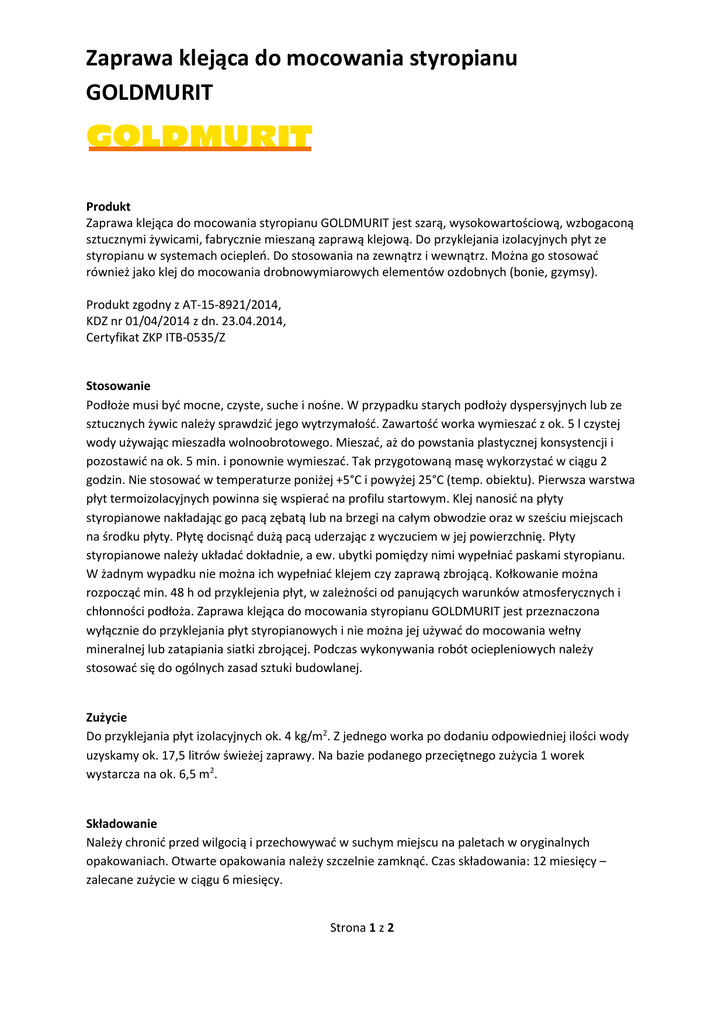 Zaprawa klejąca do mocowania styropianu GOLDMURIT Produkt Zaprawa klejąca do mocowania styropianu GOLDMURIT jest szarą, wysokowartościową, wzbogaconą sztucznymi żywicami, fabrycznie mieszaną zaprawą klejową. Do przyklejania izolacyjnych płyt ze styropianu w systemach ociepleń. Do stosowania na zewnątrz i wewnątrz. Można go stosować również jako klej do mocowania drobnowymiarowych elementów ozdobnych (bonie, gzymsy). Produkt zgodny z AT-15-8921/2014, KDZ nr 01/04/2014 z dn. 23.04.2014, Certyfikat ZKP ITB-0535/Z Stosowanie Podłoże musi być mocne, czyste, suche i nośne. W przypadku starych podłoży dyspersyjnych lub ze sztucznych żywic należy sprawdzić jego wytrzymałość. Zawartość worka wymieszać z ok. 5 l czystej wody używając mieszadła wolnoobrotowego. Mieszać, aż do powstania plastycznej konsystencji i pozostawić na ok. 5 min. i ponownie wymieszać. Tak przygotowaną masę wykorzystać w ciągu 2 godzin. Nie stosować w temperaturze poniżej +5°C i powyżej 25°C (temp. obiektu). Pierwsza warstwa płyt termoizolacyjnych powinna się wspierać na profilu startowym. Klej nanosić na płyty styropianowe nakładając go pacą zębatą lub na brzegi na całym obwodzie oraz w sześciu miejscach na środku płyty. Płytę docisnąć dużą pacą uderzając z wyczuciem w jej powierzchnię. Płyty styropianowe należy układać dokładnie, a ew. ubytki pomiędzy nimi wypełniać paskami styropianu. W żadnym wypadku nie można ich wypełniać klejem czy zaprawą zbrojącą. Kołkowanie można rozpocząć min. 48 h od przyklejenia płyt, w zależności od panujących warunków atmosferycznych i chłonności podłoża. Zaprawa klejąca do mocowania styropianu GOLDMURIT jest przeznaczona wyłącznie do przyklejania płyt styropianowych i nie można jej używać do mocowania wełny mineralnej lub zatapiania siatki zbrojącej. Podczas wykonywania robót ociepleniowych należy stosować się do ogólnych zasad sztuki budowlanej. Zużycie Do przyklejania płyt izolacyjnych ok. 4 kg/m2. Z jednego worka po dodaniu odpowiedniej ilości wody uzyskamy ok. 17,5 litrów świeżej zaprawy. Na bazie podanego przeciętnego zużycia 1 worek wystarcza na ok. 6,5 m2. Składowanie Należy chronić przed wilgocią i przechowywać w suchym miejscu na paletach w oryginalnych opakowaniach. Otwarte opakowania należy szczelnie zamknąć. Czas składowania: 12 miesięcy – zalecane zużycie w ciągu 6 miesięcy. Strona 1 z 2 Zaprawa klejąca do mocowania styropianu GOLDMURIT Rodzaj zagrożenia R: R37/38 Działa drażniąco na drogi oddechowe i skórę R41 Ryzyko poważnego uszkodzenia oczu R43 Kontakt ze skórą może wywołać uczulenie Warunki Bezpiecznego Stosowania S: S2 Chronić przed dziećmi Xi Drażniący S 22 Nie wdychać pyłu S 24/25 Unikać zanieczyszczenia skóry i oczu S 26 Zanieczyszczone oczy przemyć natychmiast dużą ilością wody i zasięgnąć porady lekarza S 36/37/39 Nosić odpowiednią odzież ochronną, odpowiednie rękawice ochronne i okulary lub ochronę twarzy S46 W razie połknięcia niezwłocznie zasięgnij porady lekarza – pokaż opakowanie lub etykietę Strona 2 z 2