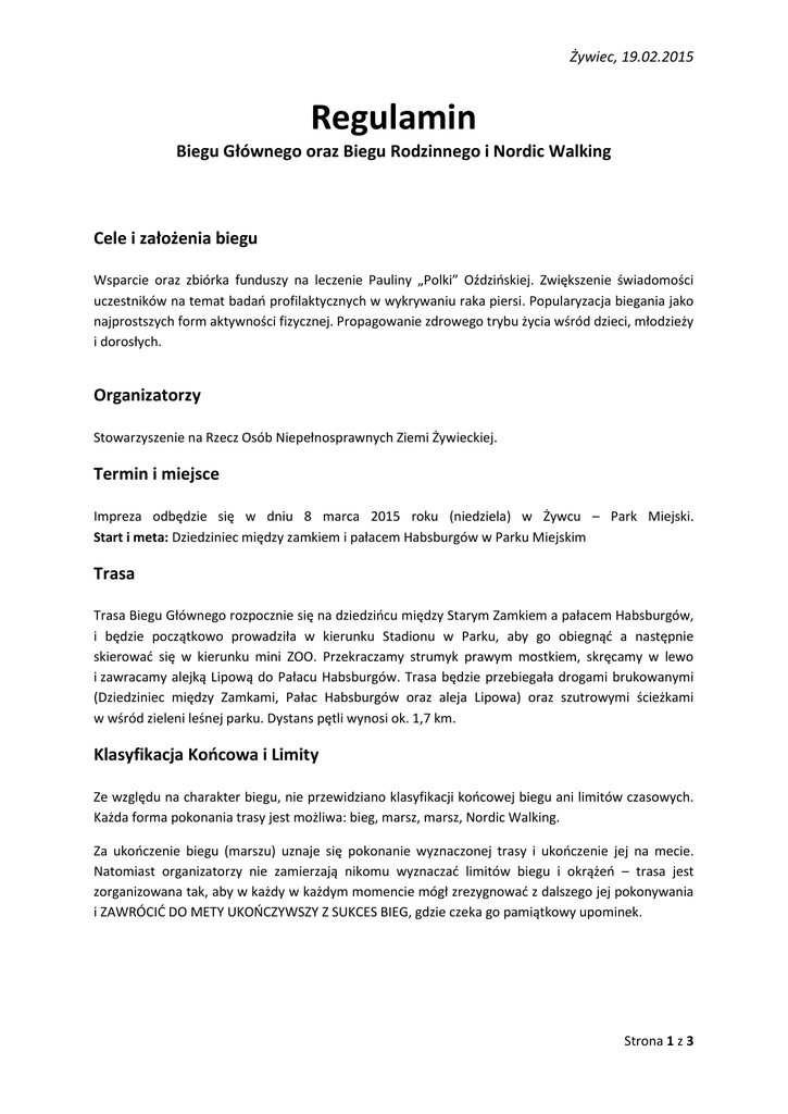 Żywiec, 19.02.2015 Regulamin Biegu Głównego oraz Biegu Rodzinnego i Nordic Walking Cele i założenia biegu Wsparcie oraz zbiórka funduszy na leczenie Pauliny „Polki” Oździoskiej. Zwiększenie świadomości uczestników na temat badao profilaktycznych w wykrywaniu raka piersi. Popularyzacja biegania jako najprostszych form aktywności fizycznej. Propagowanie zdrowego trybu życia wśród dzieci, młodzieży i dorosłych. Organizatorzy Stowarzyszenie na Rzecz Osób Niepełnosprawnych Ziemi Żywieckiej. Termin i miejsce Impreza odbędzie się w dniu 8 marca 2015 roku (niedziela) w Żywcu – Park Miejski. Start i meta: Dziedziniec między zamkiem i pałacem Habsburgów w Parku Miejskim Trasa Trasa Biegu Głównego rozpocznie się na dziedziocu między Starym Zamkiem a pałacem Habsburgów, i będzie początkowo prowadziła w kierunku Stadionu w Parku, aby go obiegnąd a następnie skierowad się w kierunku mini ZOO. Przekraczamy strumyk prawym mostkiem, skręcamy w lewo i zawracamy alejką Lipową do Pałacu Habsburgów. Trasa będzie przebiegała drogami brukowanymi (Dziedziniec między Zamkami, Pałac Habsburgów oraz aleja Lipowa) oraz szutrowymi ścieżkami w wśród zieleni leśnej parku. Dystans pętli wynosi ok. 1,7 km. Klasyfikacja Końcowa i Limity Ze względu na charakter biegu, nie przewidziano klasyfikacji koocowej biegu ani limitów czasowych. Każda forma pokonania trasy jest możliwa: bieg, marsz, marsz, Nordic Walking. Za ukooczenie biegu (marszu) uznaje się pokonanie wyznaczonej trasy i ukooczenie jej na mecie. Natomiast organizatorzy nie zamierzają nikomu wyznaczad limitów biegu i okrążeo – trasa jest zorganizowana tak, aby w każdy w każdym momencie mógł zrezygnowad z dalszego jej pokonywania i ZAWRÓCID DO METY UKOOCZYWSZY Z SUKCES BIEG, gdzie czeka go pamiątkowy upominek. Strona 1 z 3 Żywiec, 19.02.2015 Zasady uczestnictwa i zgłoszenia uczestnicy powyżej 18 roku życia podpisują oświadczenie o biegu na własną odpowiedzialnośd osoby w wieku 16-18 lat (które w dniu biegu nie osiągnęły jeszcze pełnoletniości) zobowiązane są do posiadania pozwolenia na udział od rodziców lub prawnych opiekunów, z ich podpisem i nr PESEL. Warunkiem dopuszczenia ich do startu jest obecnośd rodzica lub opiekuna wraz z dowodem osobistym w momencie weryfikacji uczestnika w biurze zawodów zgłoszenia można dokonad drogą elektroniczną przez wypełnienie formularza zgłoszeniowego zamieszczonego na stronie internetowej www.polkidlapolki.pl i w Biurze Zawodów w dniu zawodów w godzinach 8:00 – 11:00 numery startowe będą wydawane po podpisaniu oświadczenia o biegu na własną odpowiedzialnośd wszyscy uczestnicy muszą zostad zweryfikowani w Biurze Zawodów. Podczas weryfikacji uczestnicy muszą posiadad DOKUMENT POTWIERDZAJĄCY TOŻSAMOŚD (z PESEL). Warunkiem dopuszczenia do startu będzie złożenie podpisu pod oświadczeniem o starcie w zawodach na własną odpowiedzialnośd (podstawa prawna: Rozporządzenie Ministra Edukacji Narodowej z dnia 12.09.2001r. Dz. U. Nr 101 poz. 1095). Uczestnicy podpisując kartę zgłoszeniową akceptują warunki niniejszego regulaminu. Zasady finansowania Koszty związane z przeprowadzeniem imprezy pokrywają organizatorzy. Uczestnicy przyjeżdżają na koszt własny. W punkcie rejestracji zawodników i wydawania numerów, uczestnicy będą mogli wesprzed inicjatywę dobrowolnym datkiem. Fundusze zgromadzone w czasie biegu "Polki dla Polki" przeznaczone będą na leczenie i rehabilitację Pauliny "Polki" Oździoskiej oraz na działania profilaktyczne w zakresie wczesnego wykrywania nowotworów piersi i wspierające rehabilitację po zabiegach mastektomii. Postanowienia końcowe Bieg odbędzie się bez względu na pogodę. Każdy uczestnik startuje na własną odpowiedzialnośd (w przypadku zawodników niepełnoletnich na odpowiedzialnośd rodziców lub prawnych opiekunów). Organizatorzy zapewniają opiekę lekarską w trakcie trwania imprezy biegowej. Organizatorzy nie będą odpowiadali za przedmioty pozostawione bez zabezpieczenia lub skradzione podczas imprezy. Organizatorzy nie zapewniają depozytu, szatni, natrysków i toalet w trakcie trwania imprezy biegowej. Uczestnicy imprezy proszeni są o przestrzeganie zasad obowiązujących w lasach zgodnie z art. 29 i 30 Ustawy o Lasach z dnia 28.09.1991. Organizatorzy zastrzegają sobie prawo interpretacji niniejszego regulaminu. Strona 2 z 3 Żywiec, 19.02.2015 W przypadku pytań prosimy o kontakt z koordynatorami biegu: Dominik Deka (sprawy organizacyjne/wolontariusze, gastronomia, media) - nr tel. 664 425 007 Izabela Cierniak (sponsoring, wolontariusze, marketing) - nr tel. 505 518 117 Monika Biegun (sprawy sportowe, animacje dla dzieci, sklepy dla biegaczy) - nr tel. 887 253 431 Sebastian Wójcik (aukcje, sponsoring, PR) - nr tel. 535 261 770 Strona 3 z 3