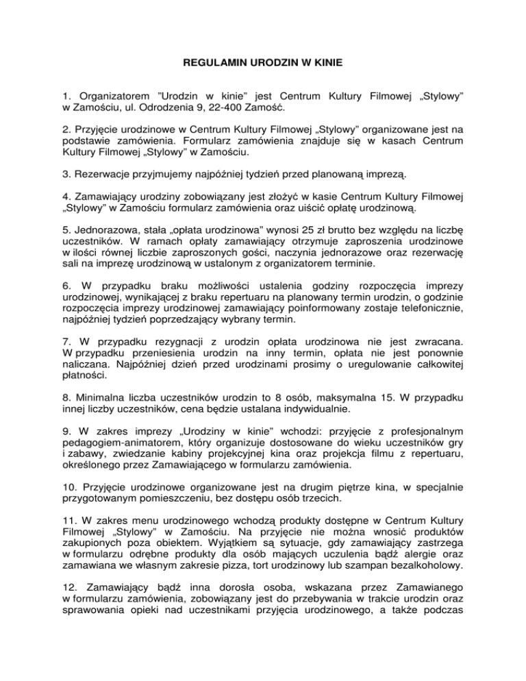 REGULAMIN URODZIN W KINIE 1. Organizatorem ”Urodzin w kinie” jest Centrum Kultury Filmowej „Stylowy” w Zamościu, ul. Odrodzenia 9, 22-400 Zamość. 2. Przyjęcie urodzinowe w Centrum Kultury Filmowej „Stylowy” organizowane jest na podstawie zamówienia. Formularz zamówienia znajduje się w kasach Centrum Kultury Filmowej „Stylowy” w Zamościu. 3. Rezerwacje przyjmujemy najpóźniej tydzień przed planowaną imprezą. 4. Zamawiający urodziny zobowiązany jest złożyć w kasie Centrum Kultury Filmowej „Stylowy” w Zamościu formularz zamówienia oraz uiścić opłatę urodzinową. 5. Jednorazowa, stała „opłata urodzinowa” wynosi 25 zł brutto bez względu na liczbę uczestników. W ramach opłaty zamawiający otrzymuje zaproszenia urodzinowe w ilości równej liczbie zaproszonych gości, naczynia jednorazowe oraz rezerwację sali na imprezę urodzinową w ustalonym z organizatorem terminie. 6. W przypadku braku możliwości ustalenia godziny rozpoczęcia imprezy urodzinowej, wynikającej z braku repertuaru na planowany termin urodzin, o godzinie rozpoczęcia imprezy urodzinowej zamawiający poinformowany zostaje telefonicznie, najpóźniej tydzień poprzedzający wybrany termin. 7. W przypadku rezygnacji z urodzin opłata urodzinowa nie jest zwracana. W przypadku przeniesienia urodzin na inny termin, opłata nie jest ponownie naliczana. Najpóźniej dzień przed urodzinami prosimy o uregulowanie całkowitej płatności. 8. Minimalna liczba uczestników urodzin to 8 osób, maksymalna 15. W przypadku innej liczby uczestników, cena będzie ustalana indywidualnie. 9. W zakres imprezy „Urodziny w kinie” wchodzi: przyjęcie z profesjonalnym pedagogiem-animatorem, który organizuje dostosowane do wieku uczestników gry i zabawy, zwiedzanie kabiny projekcyjnej kina oraz projekcja filmu z repertuaru, określonego przez Zamawiającego w formularzu zamówienia. 10. Przyjęcie urodzinowe organizowane jest na drugim piętrze kina, w specjalnie przygotowanym pomieszczeniu, bez dostępu osób trzecich. 11. W zakres menu urodzinowego wchodzą produkty dostępne w Centrum Kultury Filmowej „Stylowy” w Zamościu. Na przyjęcie nie można wnosić produktów zakupionych poza obiektem. Wyjątkiem są sytuacje, gdy zamawiający zastrzega w formularzu odrębne produkty dla osób mających uczulenia bądź alergie oraz zamawiana we własnym zakresie pizza, tort urodzinowy lub szampan bezalkoholowy. 12. Zamawiający bądź inna dorosła osoba, wskazana przez Zamawianego w formularzu zamówienia, zobowiązany jest do przebywania w trakcie urodzin oraz sprawowania opieki nad uczestnikami przyjęcia urodzinowego, a także podczas późniejszej projekcji filmu. Zamawiający ponosi wyłączną odpowiedzialność za sprawowanie opieki w całym okresie trwania imprezy „Urodzin w kinie”. Rodzic/Opiekun kupuje dla siebie bilet ulgowy na seans filmowy zgodnie z obowiązującym w danym dniu cennikiem. 13. Organizator nie ponosi odpowiedzialności za pozostawione bądź zgubione rzeczy na terenie kina. Okrycia wierzchnie bądź inne przedmioty na czas seansu pozostawić można w zamkniętym pomieszczeniu na terenie Centrum Kultury Filmowej „Stylowy” w Zamościu. 14. Rezerwacji urodzin dokonywać można osobiście w kasach kina bądź telefonicznie pod numerem: 84 639 23 13. 15. Organizator zastrzega sobie prawo do zmiany niniejszego regulaminu.