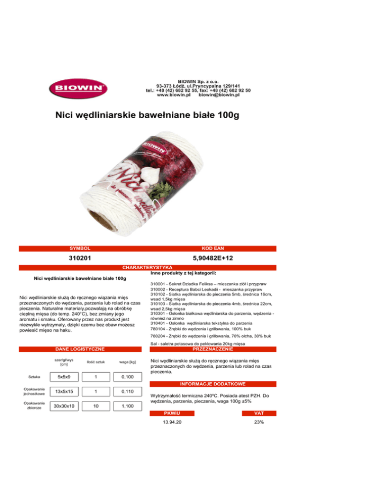 Nici wędliniarskie bawełniane białe 100g SYMBOL KOD EAN 310201 5,90482E+12 CHARAKTERYSTYKA Inne produkty z tej kategorii: Nici wędliniarskie bawełniane białe 100g Nici wędliniarskie służą do ręcznego wiązania mięs przeznaczonych do wędzenia, parzenia lub rolad na czas pieczenia. Naturalne materiały,pozwalają na obróbkę cieplną mięsa (do temp. 240°C), bez zmiany jego aromatu i smaku. Oferowany przez nas produkt jest niezwykle wytrzymały, dzięki czemu bez obaw możesz powiesić mięso na haku. 310001 - Sekret Dziadka Feliksa – mieszanka ziół i przypraw 310002 - Receptura Babci Leokadii - mieszanka przypraw 310102 - Siatka wędliniarska do pieczenia 5mb, średnica 16cm, wsad 1,5kg mięsa 310103 - Siatka wędliniarska do pieczenia 4mb, średnica 22cm, wsad 2,5kg mięsa 310301 - Osłonka białkowa wędliniarska do parzenia, wędzenia również na zimno 310401 - Osłonka wędliniarska tekstylna do parzenia 780104 - Zrębki do wędzenia i grillowania, 100% buk 780204 - Zrębki do wędzenia i grillowania, 70% olcha, 30% buk Sal - saletra potasowa do peklowania 20kg mięsa DANE LOGISTYCZNE PRZEZNACZENIE szer/gł/wys [cm] Ilość sztuk waga [kg] Sztuka 5x5x9 1 0,100 Opakowanie jednostkowe 13x5x15 1 0,110 Opakowanie zbiorcze 30x30x10 10 1,100 Nici wędliniarskie służą do ręcznego wiązania mięs przeznaczonych do wędzenia, parzenia lub rolad na czas pieczenia. INFORMACJE DODATKOWE Wytrzymałość termiczna 240ºC. Posiada atest PZH. Do wędzenia, parzenia, pieczenia, waga 100g ±5% PKWiU VAT 13.94.20 23%