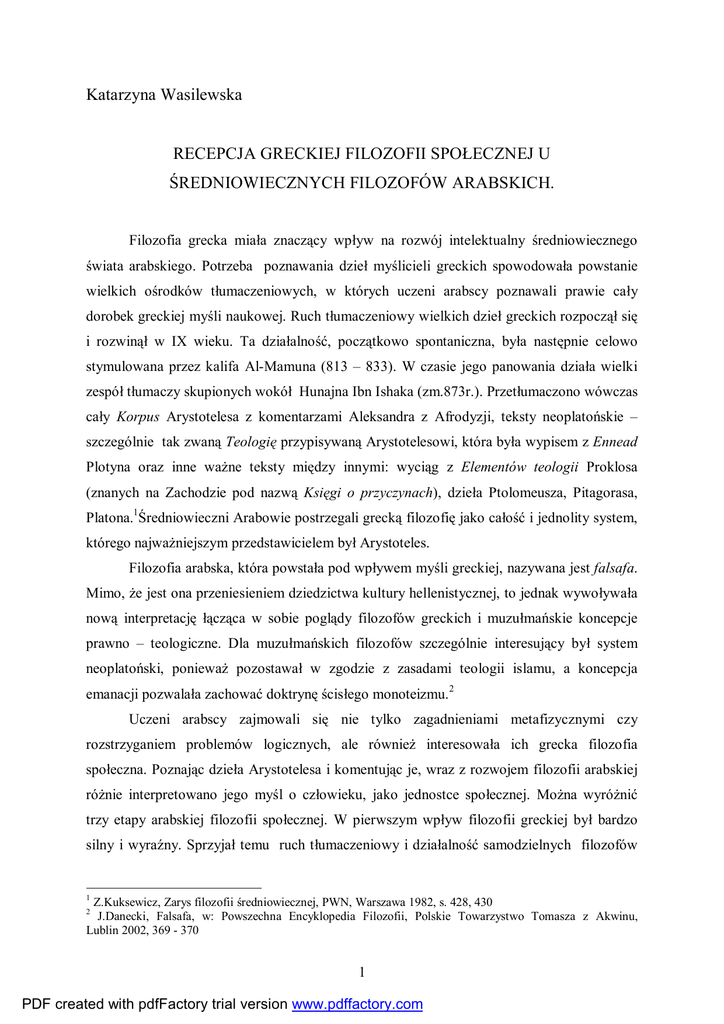 Katarzyna Wasilewska RECEPCJA GRECKIEJ FILOZOFII SPOŁECZNEJ U ŚREDNIOWIECZNYCH FILOZOFÓW ARABSKICH. Filozofia grecka miała znaczący wpływ na rozwój intelektualny średniowiecznego świata arabskiego. Potrzeba poznawania dzieł myślicieli greckich spowodowała powstanie wielkich ośrodków tłumaczeniowych, w których uczeni arabscy poznawali prawie cały dorobek greckiej myśli naukowej. Ruch tłumaczeniowy wielkich dzieł greckich rozpoczął się i rozwinął w IX wieku. Ta działalność, początkowo spontaniczna, była następnie celowo stymulowana przez kalifa Al-Mamuna (813 – 833). W czasie jego panowania działa wielki zespół tłumaczy skupionych wokół Hunajna Ibn Ishaka (zm.873r.). Przetłumaczono wówczas cały Korpus Arystotelesa z komentarzami Aleksandra z Afrodyzji, teksty neoplatońskie – szczególnie tak zwaną Teologię przypisywaną Arystotelesowi, która była wypisem z Ennead Plotyna oraz inne ważne teksty między innymi: wyciąg z Elementów teologii Proklosa (znanych na Zachodzie pod nazwą Księgi o przyczynach), dzieła Ptolomeusza, Pitagorasa, Platona.1Średniowieczni Arabowie postrzegali grecką filozofię jako całość i jednolity system, którego najważniejszym przedstawicielem był Arystoteles. Filozofia arabska, która powstała pod wpływem myśli greckiej, nazywana jest falsafa. Mimo, że jest ona przeniesieniem dziedzictwa kultury hellenistycznej, to jednak wywoływała nową interpretację łącząca w sobie poglądy filozofów greckich i muzułmańskie koncepcje prawno – teologiczne. Dla muzułmańskich filozofów szczególnie interesujący był system neoplatoński, ponieważ pozostawał w zgodzie z zasadami teologii islamu, a koncepcja emanacji pozwalała zachować doktrynę ścisłego monoteizmu. 2 Uczeni arabscy zajmowali się nie tylko zagadnieniami metafizycznymi czy rozstrzyganiem problemów logicznych, ale również interesowała ich grecka filozofia społeczna. Poznając dzieła Arystotelesa i komentując je, wraz z rozwojem filozofii arabskiej różnie interpretowano jego myśl o człowieku, jako jednostce społecznej. Można wyróżnić trzy etapy arabskiej filozofii społecznej. W pierwszym wpływ filozofii greckiej był bardzo silny i wyraźny. Sprzyjał temu ruch tłumaczeniowy i działalność samodzielnych filozofów 1 Z.Kuksewicz, Zarys filozofii średniowiecznej, PWN, Warszawa 1982, s. 428, 430 J.Danecki, Falsafa, w: Powszechna Encyklopedia Filozofii, Polskie Towarzystwo Tomasza z Akwinu, Lublin 2002, 369 - 370 2 1 PDF created with pdfFactory trial version www.pdffactory.com arabskich, którzy systematyzowali myśl Greków. Filozofowie, inspirowani Państwem Platona i Polityką Arystotelesa, tworzyli dzieła o wzorowym państwie, którego celem jest osiąganie szczęścia przez obywateli. Drugi etap arabskiej filozofii społecznej jest czasem sporów między filozofią (falsafa) a teologią (kalam). Dla teologów państwo jest podstawowym warunkiem wprowadzenia prawa Bożego na ziemi. Organizacja państwowa jest powołana do zabezpieczania funkcjonowania prawa, a władca powinien strzec porządku religijnego – podstawy prawidłowego funkcjonowania państwa. Trzeci etap filozofii społecznej to czas wewnętrznego kryzysu i powolnego upadku świata islamu. Nadal krytykowano filozofię za niepowodzenia w rozwiązywaniu problemów metafizycznych, a jej głównym zadaniem było rozważanie całościowego istnienia, czyli społeczności ludzkiej. Każdy z etapów arabskiej filozofii społecznej ma swojego znaczącego przedstawiciela. Pierwszym z nich jest Al-Farabi (870 – 950 r.), wielki filozof islamu, nazywany „Drugim Nauczycielem”. W drugim etapie działa sławny teolog, mistyk i filozof Al-Gazali (1058 – 1111 r.), w trzecim – Ibn Chaldun (1332 – 1406 r.), zdolny polityk, historyk, dyplomata i filozof. W tej pracy przedstawione zostaną poglądy dotyczące społeczeństwa i państwa dwóch myślicieli: Al–Farabiego – twórcy filozofii politycznej islamu oraz Ibn Chalduna, który nakreślił nową koncepcję społeczeństwa. Działalność tych filozofów oddzielają cztery wieki rozwoju myśli naukowej w świecie arabskim oraz czas krytyki filozofii. Al-Farabi jest autorem wielu dzieł filozoficznych i komentarzy do pism Platona i Arystotelesa. Podejmował wszystkie ważne problemy filozofii średniowiecznej, między innymi: zagadnienie Boga, relacji Boga i świata, strukturę bytu, człowieka i jego duszy. Ważne miejsce w jego filozofii zajmowały zagadnienia moralne i społeczne. Jest twórcą teorii społecznej, opartej na myśli Platona i Arystotelesa, ale łączącej w sobie elementy charakterystyczne dla państwa muzułmańskiego.3 Na pytanie: dlaczego człowiek potrzebuje państwa? Al-Farabi podaje taką samą odpowiedź jak Arystoteles – człowiek jest z natury istotą polityczną, państwową.4 Nie jest samowystarczalny i potrzebuje pomocy innych ludzi, aby utrzymać się przy życiu i dążyć do doskonałości. Ale osiągnięcie doskonałości może zapewnić tylko państwo, a szczególnie 3 4 Z.Kuksewicz, op.cit., Zarys filozofii..., s. 471 Al-Farabi, Państwo doskonałe. Polityka, tłum. J.Bielawski, PWN, Warszawa 1967, s. XXXV 2 PDF created with pdfFactory trial version www.pdffactory.com państwo doskonałe, którego obywatele skupiając się i pomagając sobie wzajemnie, dokonują rzeczy prowadzących do prawdziwego szczęścia.5 „Polega ono na tym, że dusza ludzka osiąga taki stopień doskonałości istnienia, iż nie potrzebuje materii, aby nadal istnieć, łączy się bowiem z całością bytów pozbawionych ciał oraz substancji oddzielonych od materii i pozostaje w takim stanie na zawsze”. 6 Dusza osiąga wieczne szczęście dzięki czynom dobrowolnym (intelektualnym i cielesnym), które nie są przypadkowe, ale określone i zamierzone, będące skutkiem również określonych i zamierzonych dyspozycji i nawyków. Wśród czynów dobrowolnych są również takie, które pr