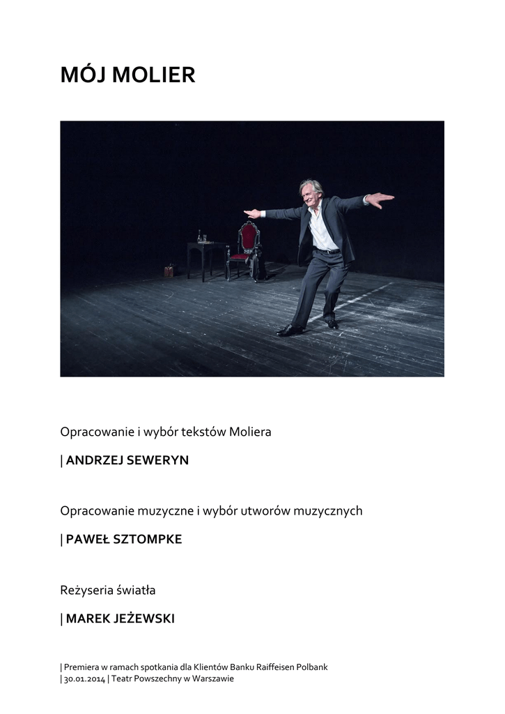 MÓJ MOLIER Opracowanie i wybór tekstów Moliera | ANDRZEJ SEWERYN Opracowanie muzyczne i wybór utworów muzycznych | PAWEŁ SZTOMPKE Reżyseria światła | MAREK JEŻEWSKI | Premiera w ramach spotkania dla Klientów Banku Raiffeisen Polbank | 30.01.2014 | Teatr Powszechny w Warszawie Solowy występ aktorski Andrzeja Seweryna lżejszy w treści i formie od podobnych „spotkań” tego wybitnego aktora z utworami Gombrowicza czy Szekspira. Teraz Seweryn w swojej opowieści scenicznej, zbudowanej wokół perypetii zazdrosnego bohatera Molierowskiej „Szkoły żon”, pozwala sobie na cudowny luz już od samego początku. Wchodzi na scenę krokiem tanecznym, w rytm swingującej muzyki, którą wybrał znany dziennikarz radiowy i prezenter estradowy, Paweł Sztompke. Nie, nie, proszę państwa: to ani Gene Kelly, ani Fred Astaire, to naprawdę będzie mieć związek z Molierem” – zaczyna Seweryn. I dalej w tym duchu, choć już bez „musicalowego” tła, toczy się historia czterdziestoletniego („starego”, jak na XVII-wieczne standardy) mieszczanina, Arnolfa, który szykując się do ożenku z dziewczęciem znacznie młodszym od niego, zaczyna przeżywać katusze, gdy ta wpada w oko pewnemu młodzieńcowi. Seweryn improwizuje, czyni zabawne dygresje, przeczytanie fragmentów tekstu powierza widzom. Lekko, dowcipnie, finezyjnie. Na naprawdę najwyższym poziomie. fot. Bartosz Fajge
