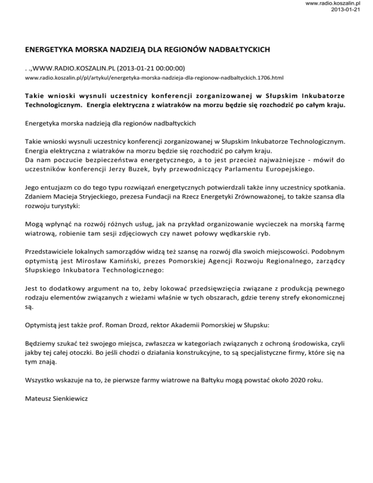 www.radio.koszalin.pl 2013-01-21 ENERGETYKA MORSKA NADZIEJĄ DLA REGIONÓW NADBAŁTYCKICH . .,WWW.RADIO.KOSZALIN.PL (2013-01-21 00:00:00) www.radio.koszalin.pl/pl/artykul/energetyka-morska-nadzieja-dla-regionow-nadbaltyckich.1706.html Takie wnioski wysnuli uczestnicy konferencji zorganizowanej w Słupskim Inkubatorze Technologicznym. Energia elektryczna z wiatraków na morzu będzie się rozchodzić po całym kraju. Energetyka morska nadzieją dla regionów nadbałtyckich Takie wnioski wysnuli uczestnicy konferencji zorganizowanej w Słupskim Inkubatorze Technologicznym. Energia elektryczna z wiatraków na morzu będzie się rozchodzić po całym kraju. Da nam poczucie bezpieczeństwa energetycznego, a to jest przecież najważniejsze - mówił do uczestników konferencji Jerzy Buzek, były przewodniczący Parlamentu Europejskiego. Jego entuzjazm co do tego typu rozwiązań energetycznych potwierdzali także inny uczestnicy spotkania. Zdaniem Macieja Stryjeckiego, prezesa Fundacji na Rzecz Energetyki Zrównoważonej, to także szansa dla rozwoju turystyki: Mogą wpłynąć na rozwój różnych usług, jak na przykład organizowanie wycieczek na morską farmę wiatrową, robienie tam sesji zdjęciowych czy nawet połowy wędkarskie ryb. Przedstawiciele lokalnych samorządów widzą też szansę na rozwój dla swoich miejscowości. Podobnym optymistą jest Mirosław Kamiński, prezes Pomorskiej Agencji Rozwoju Regionalnego, zarządcy Słupskiego Inkubatora Technologicznego: Jest to dodatkowy argument na to, żeby lokować przedsięwzięcia związane z produkcją pewnego rodzaju elementów związanych z wieżami właśnie w tych obszarach, gdzie tereny strefy ekonomicznej są. Optymistą jest także prof. Roman Drozd, rektor Akademii Pomorskiej w Słupsku: Będziemy szukać też swojego miejsca, zwłaszcza w kategoriach związanych z ochroną środowiska, czyli jakby tej całej otoczki. Bo jeśli chodzi o działania konstrukcyjne, to są specjalistyczne firmy, które się na tym znają. Wszystko wskazuje na to, że pierwsze farmy wiatrowe na Bałtyku mogą powstać około 2020 roku. Mateusz Sienkiewicz